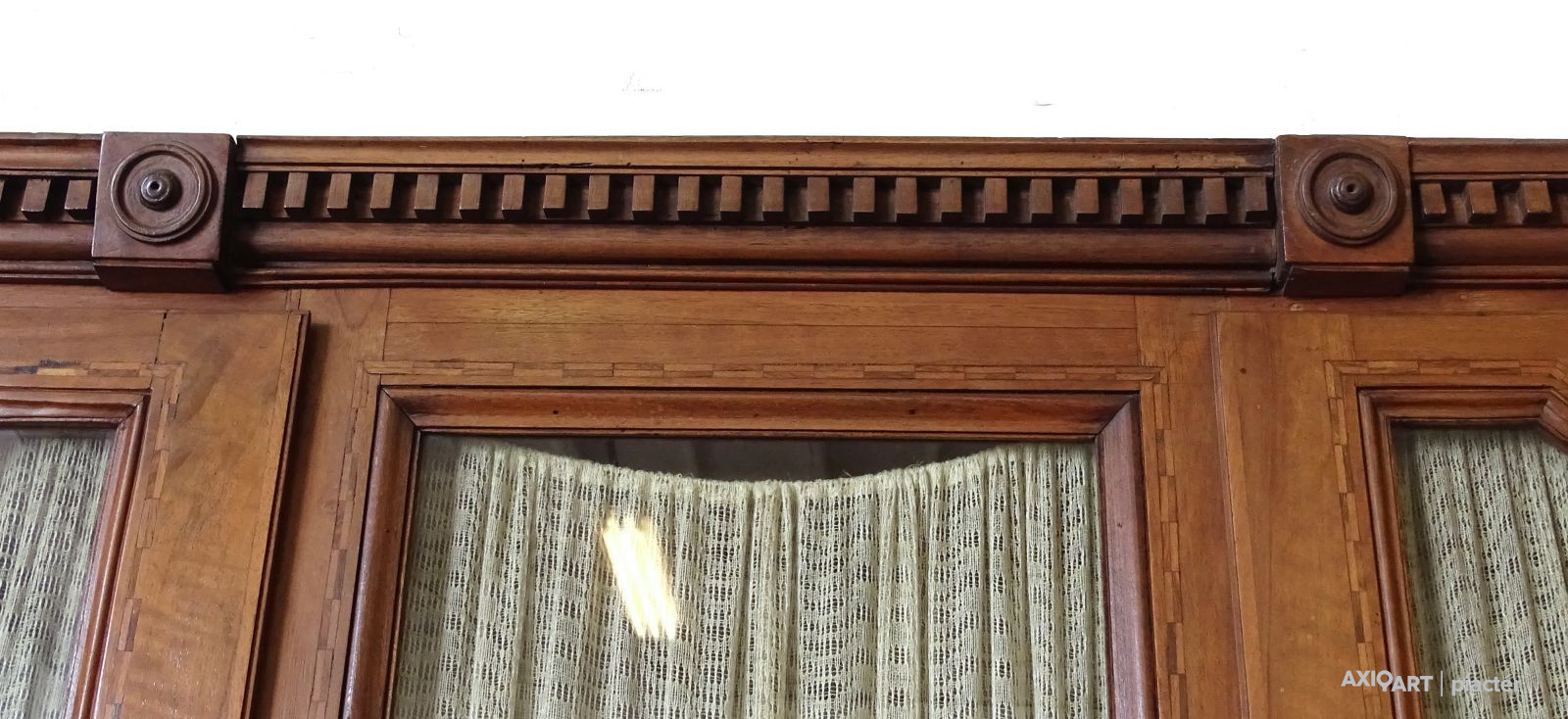 [1N308/UZ-K] Antik, felújításmentes állapotban lévő, XIX. századi antik üveges könyvszekrény. Felső rész belseje kárpitozott, három üveges ajtaján függöny található. Ajtajaiban működő zárak találhatók, három darab kulcs tartozik hozzá. Faragott részekkel és intarziával díszített nagy méretű könyvszekrény. Háta is eredeti, osztott, faragott deszkás hátlap. Hátoldalán korabeli hajózási szállítmányozási címke található: ELSŐ CS. KIR. SZAB. DUNA GŐZHAJÓZÁSI TÁRSASÁG BUDAPEST Magasság: 214 cm Szélesség: 170 cm