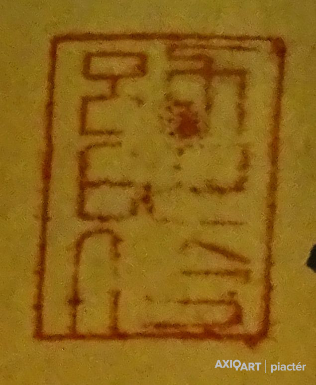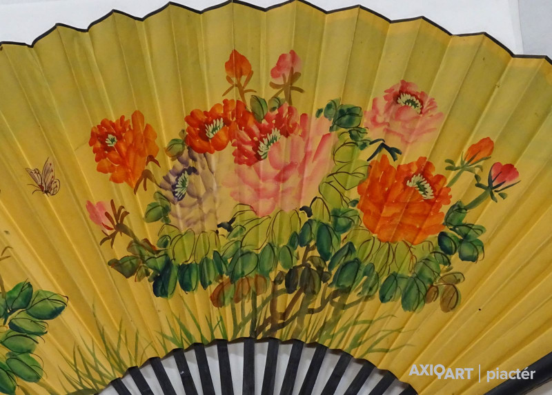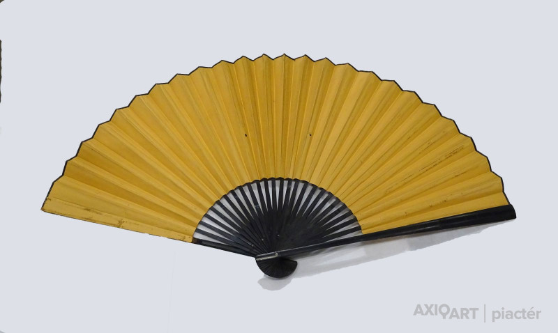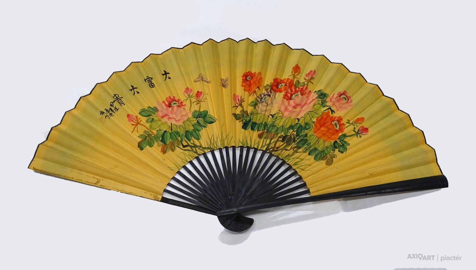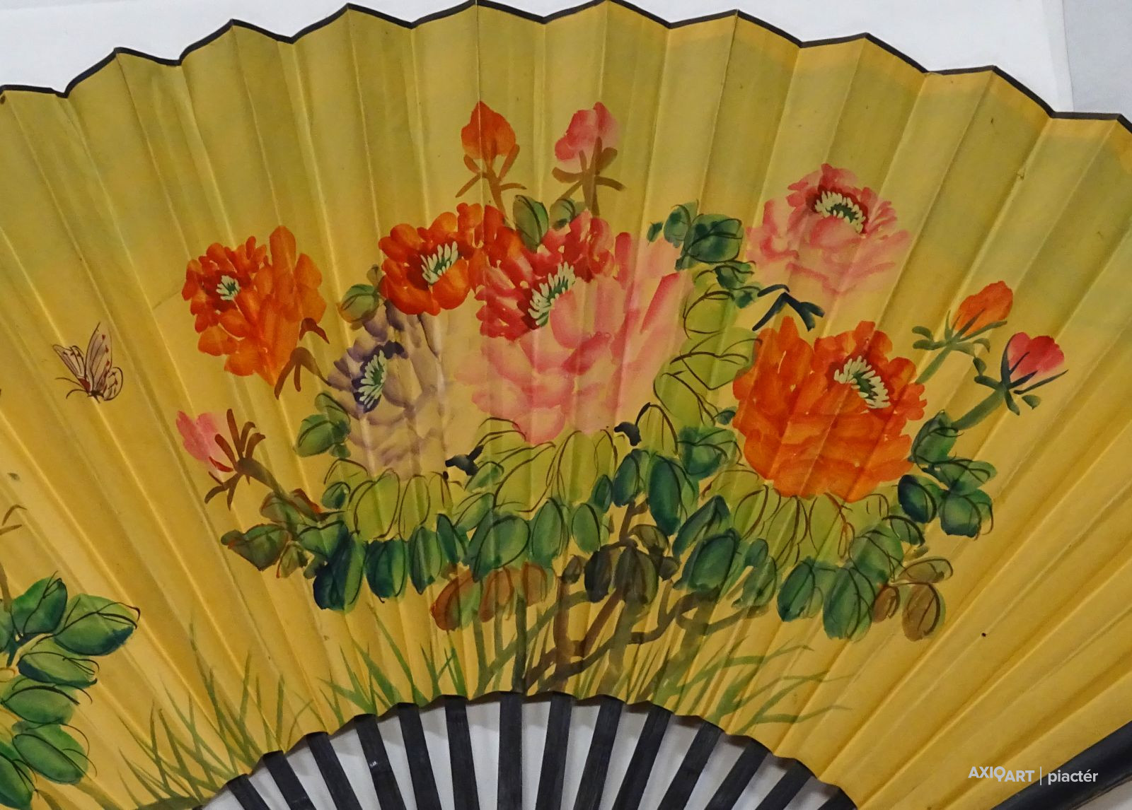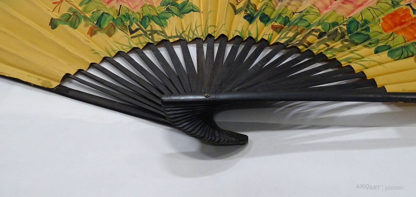 Antik, nagyméretű legyező. Összesen 26 tagú fa vázon akvarellel festett, jelzett papír legyező. Rajta kalligrafikus tus felirat művész jelzés és piros jelzés található, lásd fotó.