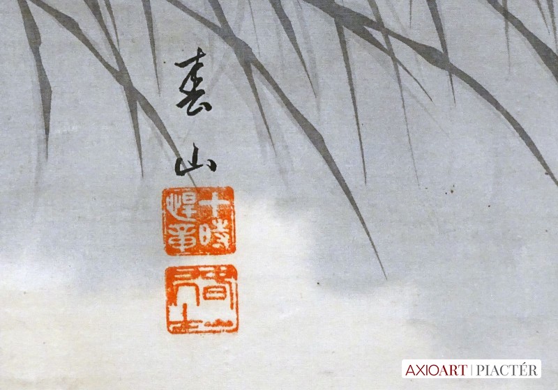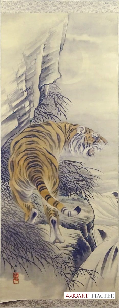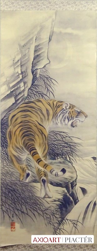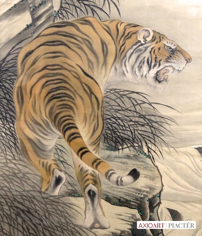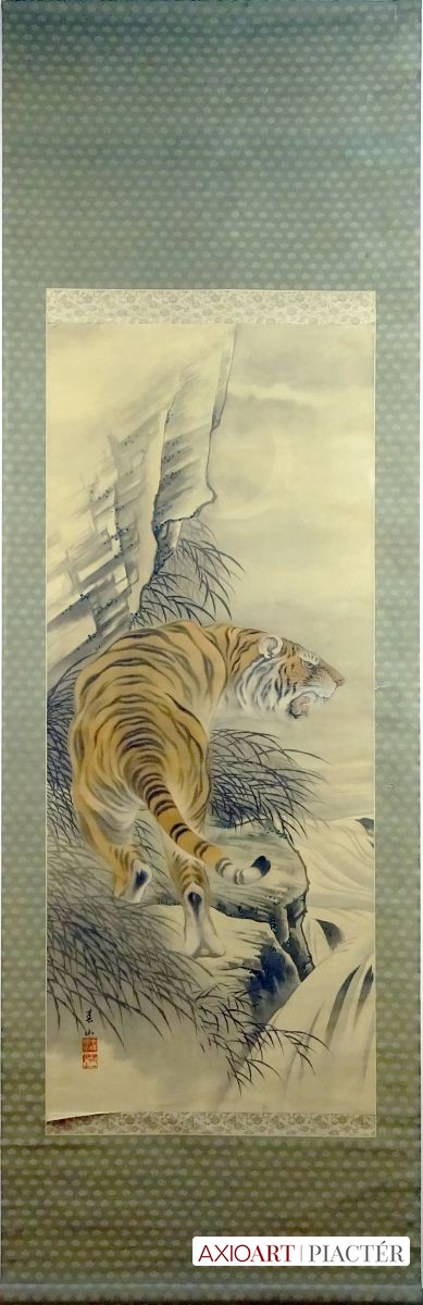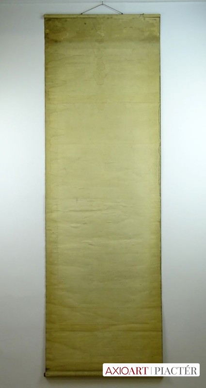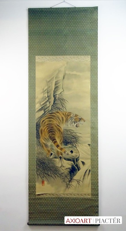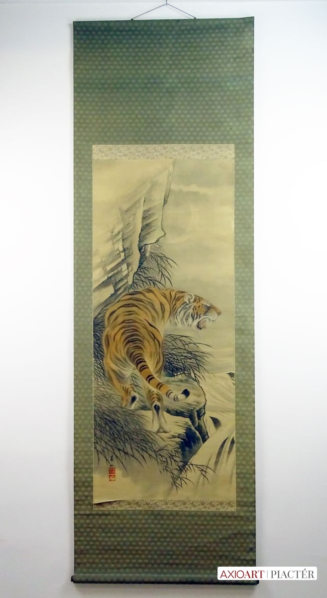 [0F880/105] Jelzett, kínai mester által készített, papír akvarell kínai kép tigrissel, háború előtti darab lehet. Kalligrafikus jelzés balra lent kínai művész által. A kép pergamenként összetekerhető, a festmény nagyon díszes, selyem szerű textíliára kasírozott, lásd fotó. Szélesség: 65.5 cm Hosszúság: 203 cm