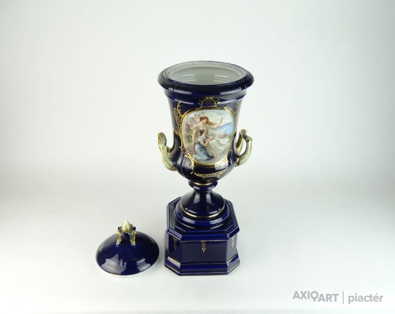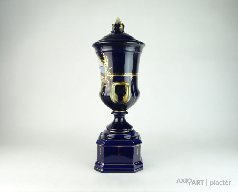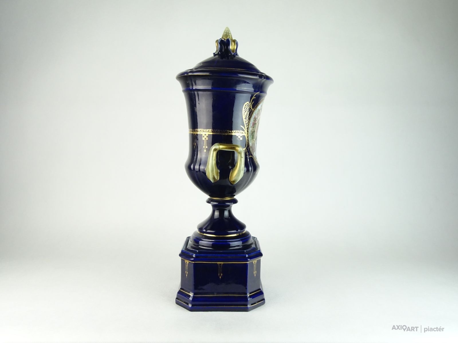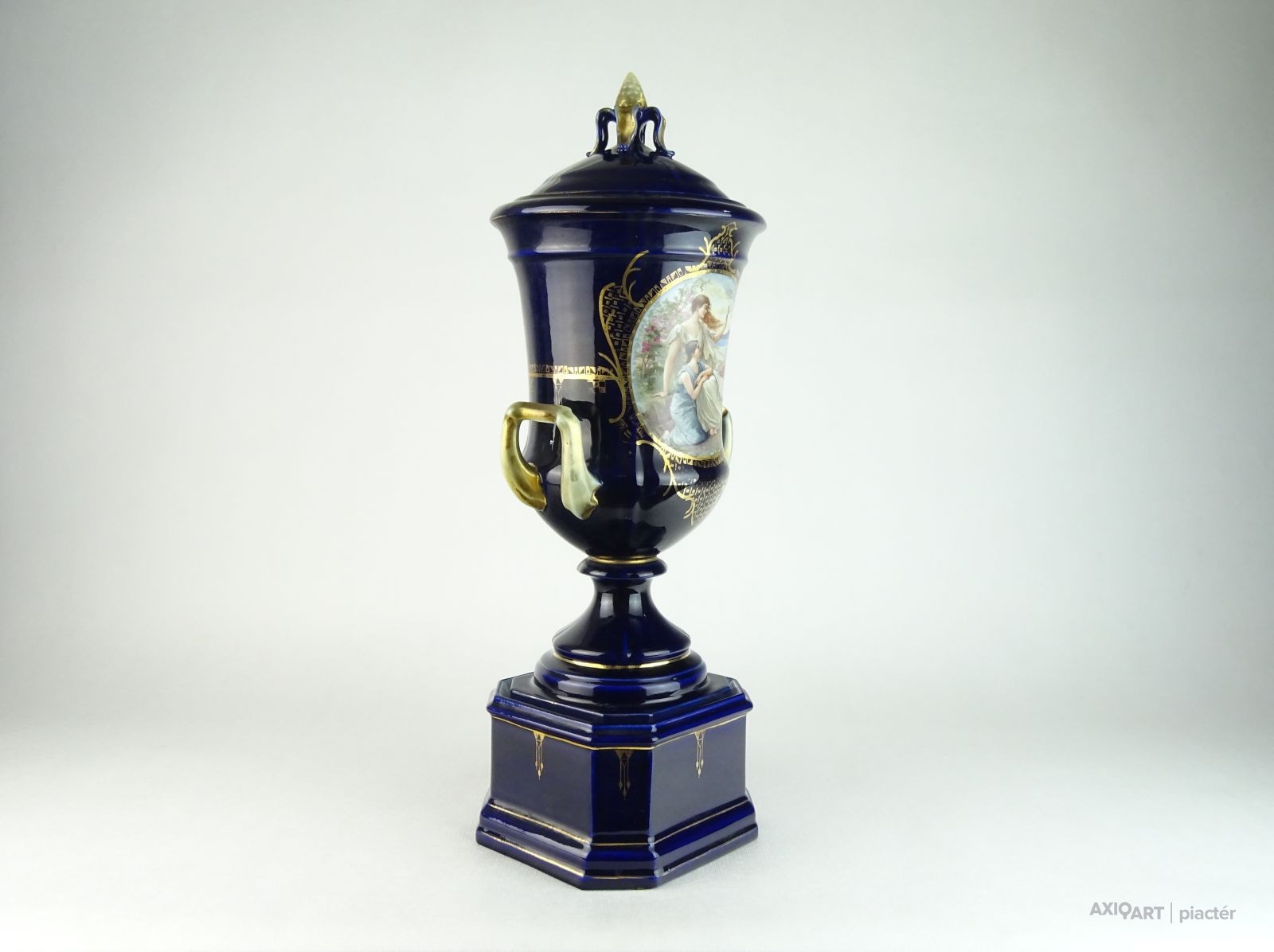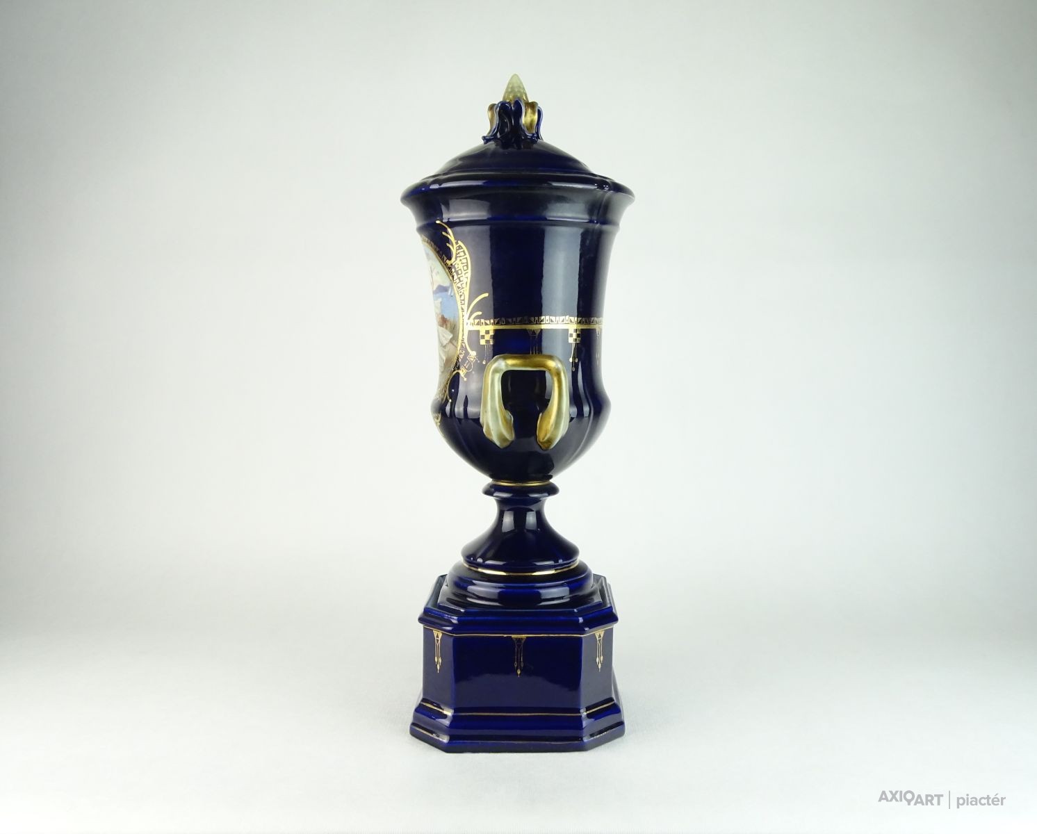 Szép állapotú, antik, jelzett kobaltkék porcelán arannyal dúsan, gazdagon díszített jelenetes nagy méretű dísztárgy, füles urnaváza.