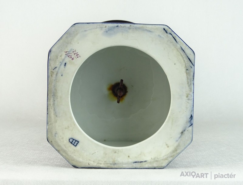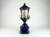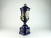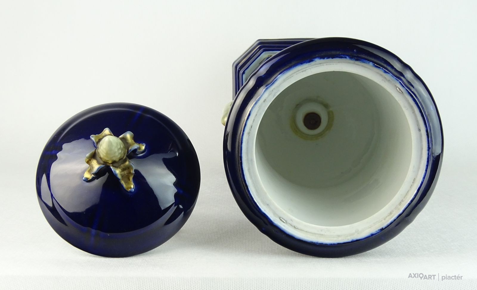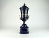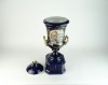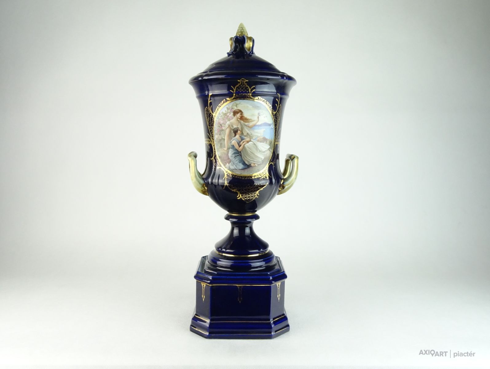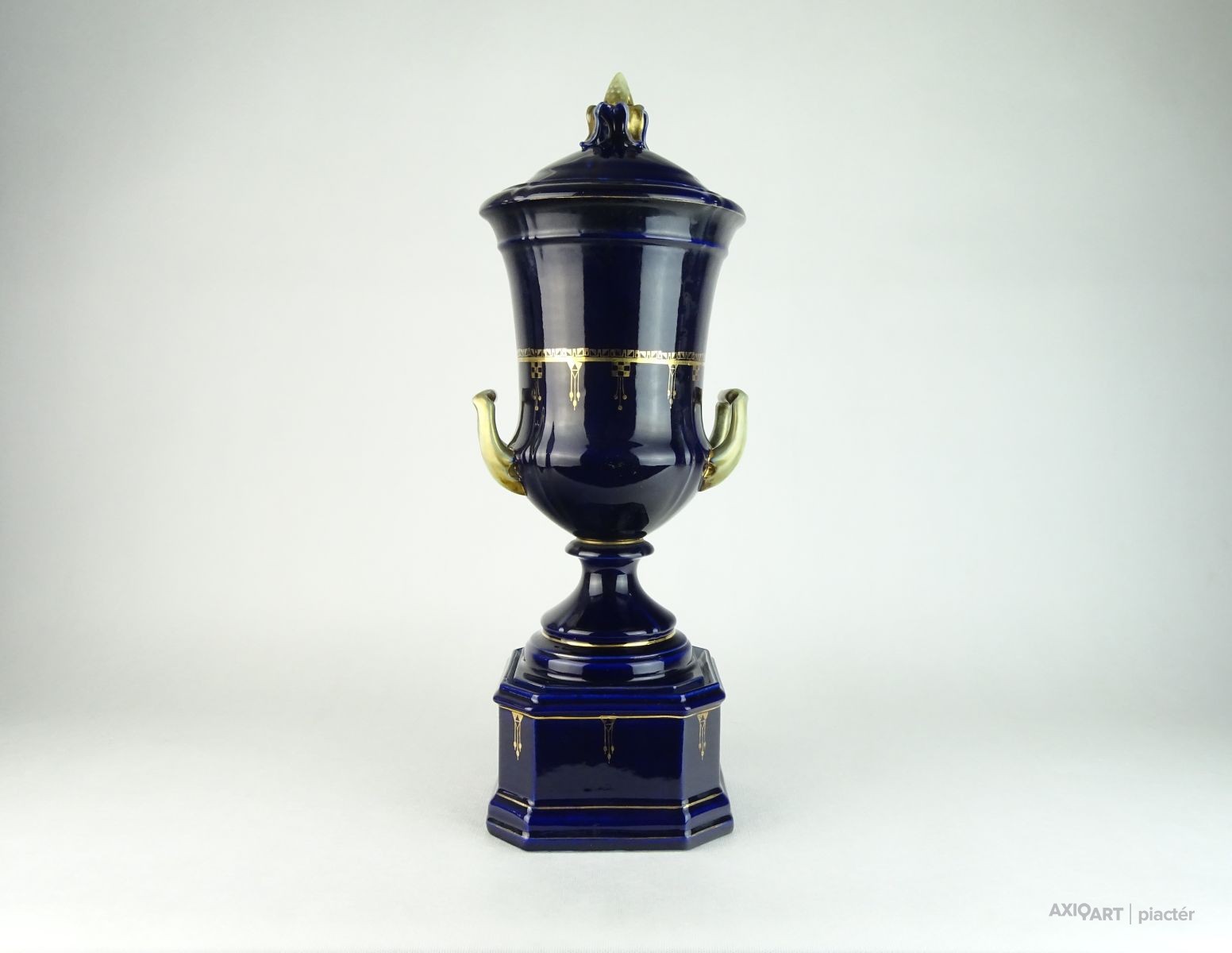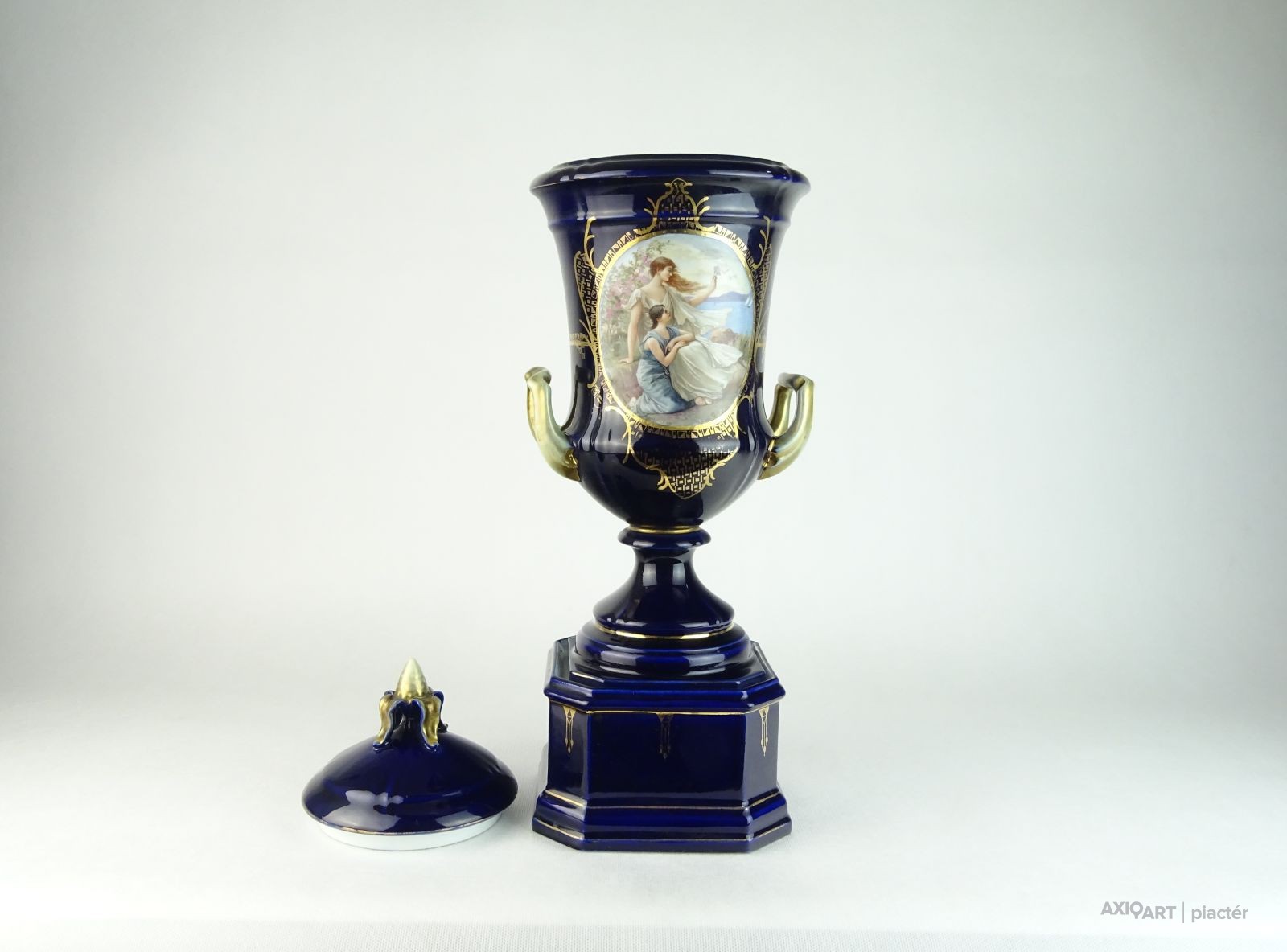 Szép állapotú, antik, jelzett kobaltkék porcelán arannyal dúsan, gazdagon díszített jelenetes nagy méretű dísztárgy, füles urnaváza.