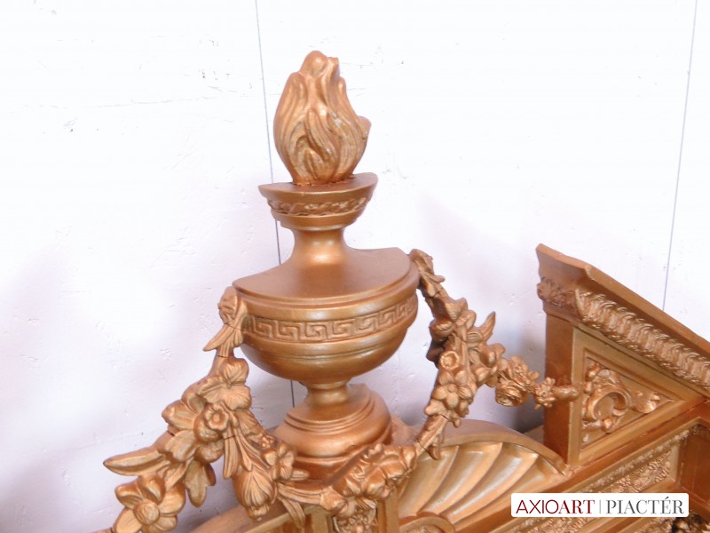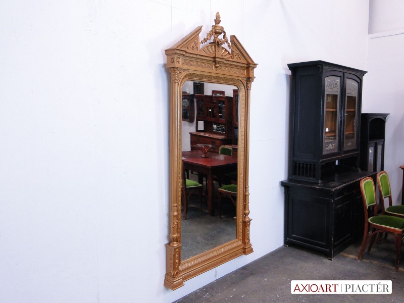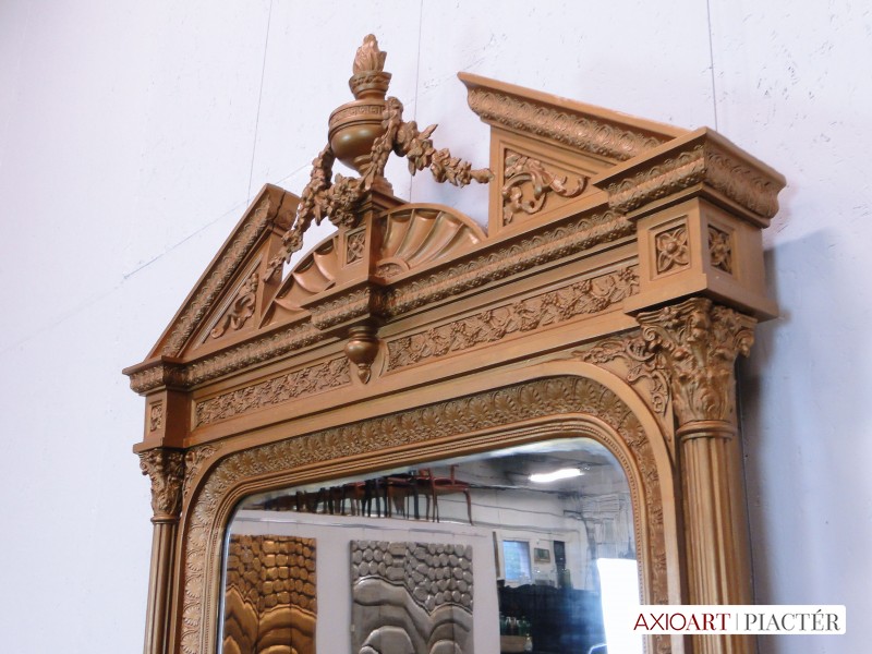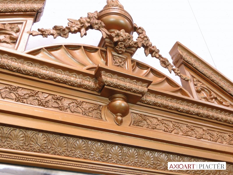 Nagyon gazdagon díszített, aranyozott kétoszlopos antik fali tükör. Tetején virágdíszes, koszorús láng nyelves csúcsdísszel.