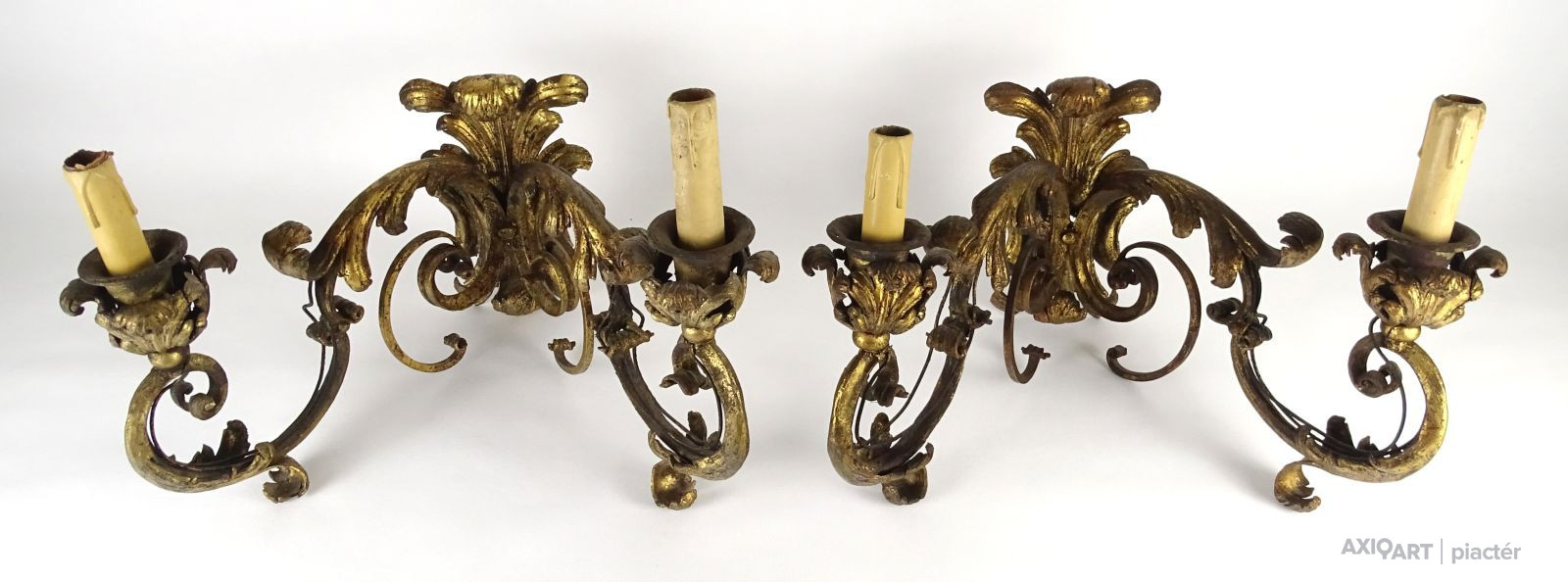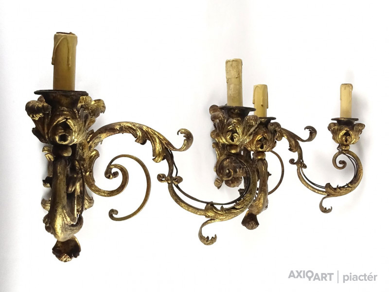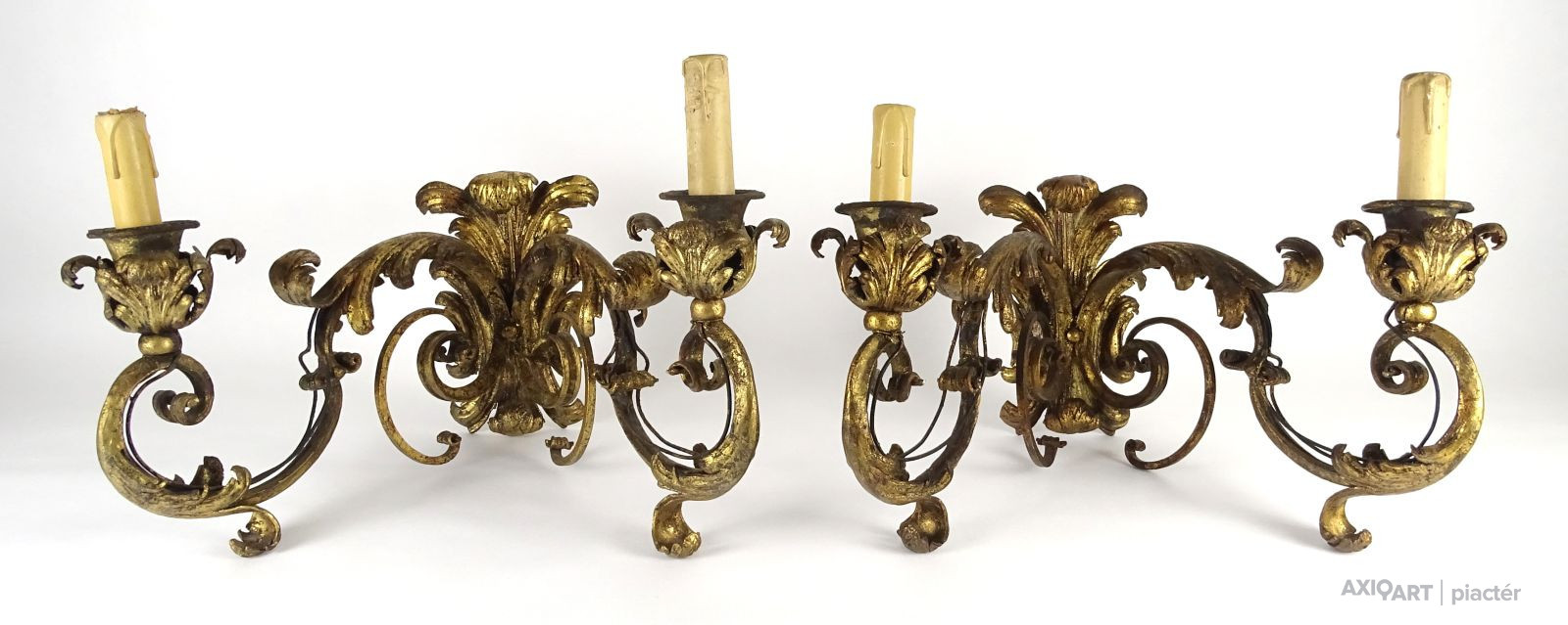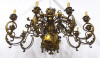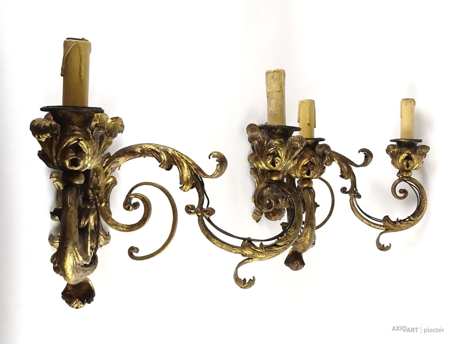 Antik hatalmas tűzaranyozott patinás 10 karú kovácsoltvas kastély csillár falikar párral