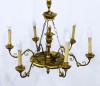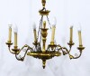 Hatégős, antik csillár aranyozott és kézzel festett elemekkel. A karok papírmasé gyertyákban végződnek, kisméretű izzók valók bele.