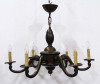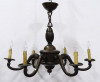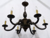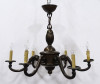 [1K397/W067] Antik hatkarú bronz csillár. A karok papírmasé gyertyákban végződnek, kis méretű (E14) izzó való bele. Némelyik gyertya eldől, javításra szorul. Magasság: 65 cm Szélesség: 80 cm