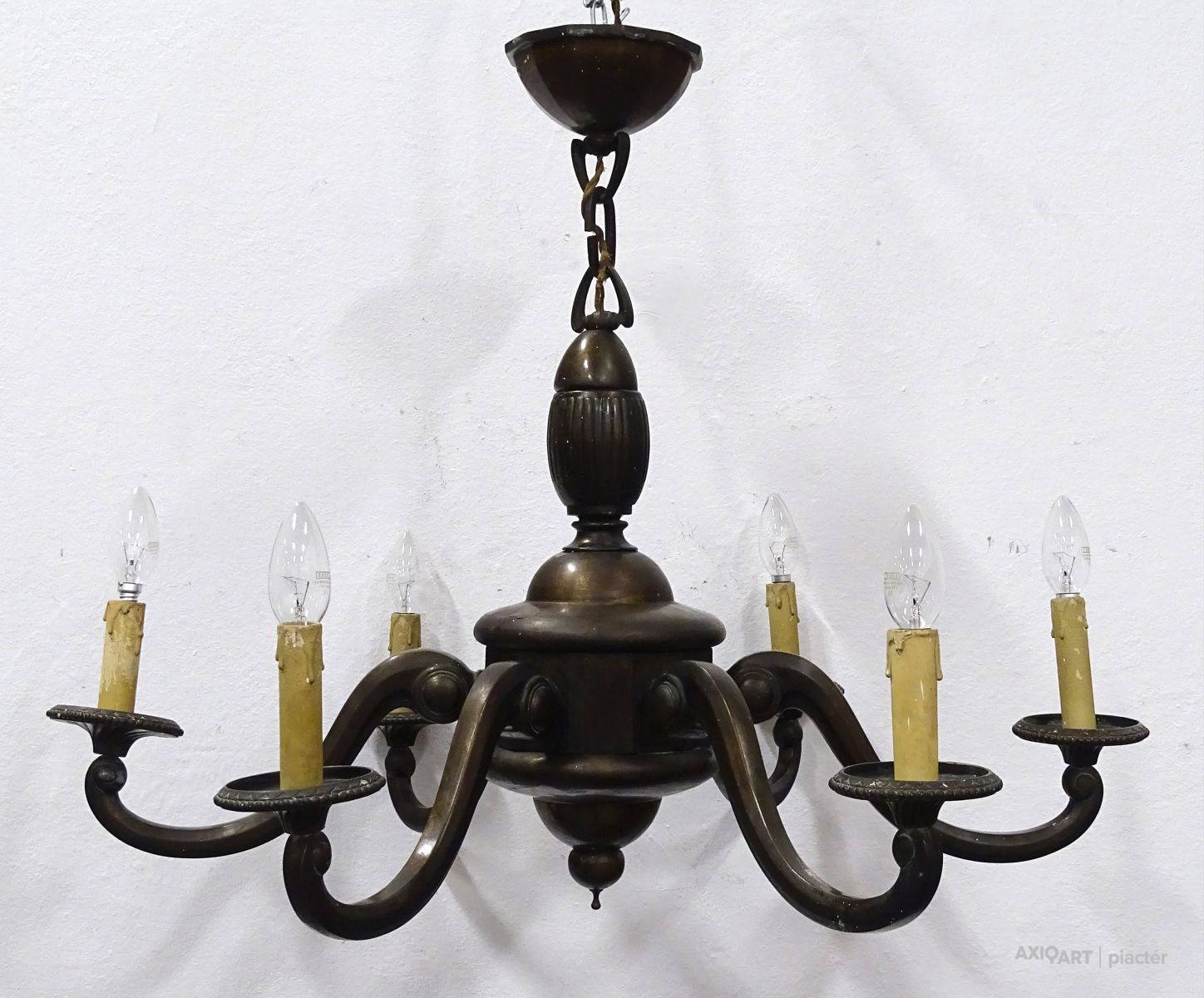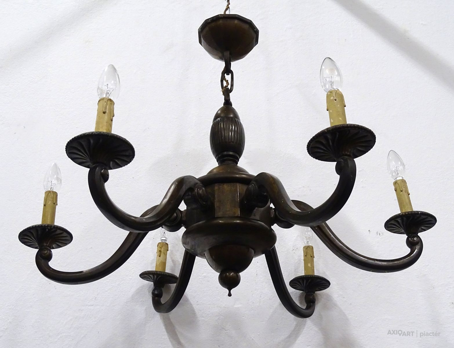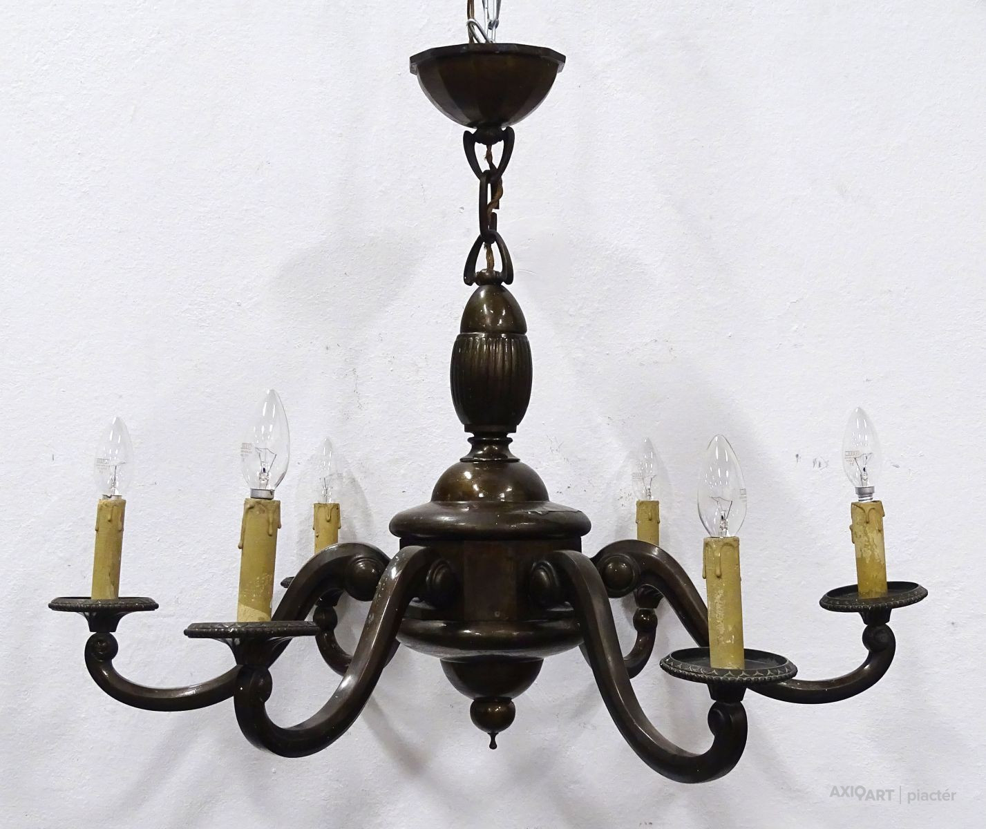 Antik hatkarú bronz csillár. A karok papírmasé gyertyákban végződnek, kis méretű (E14) izzó való bele. Némelyik gyertya eldől, javításra szorul.
