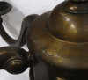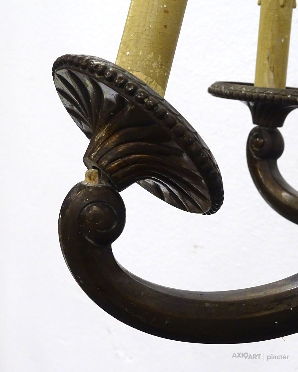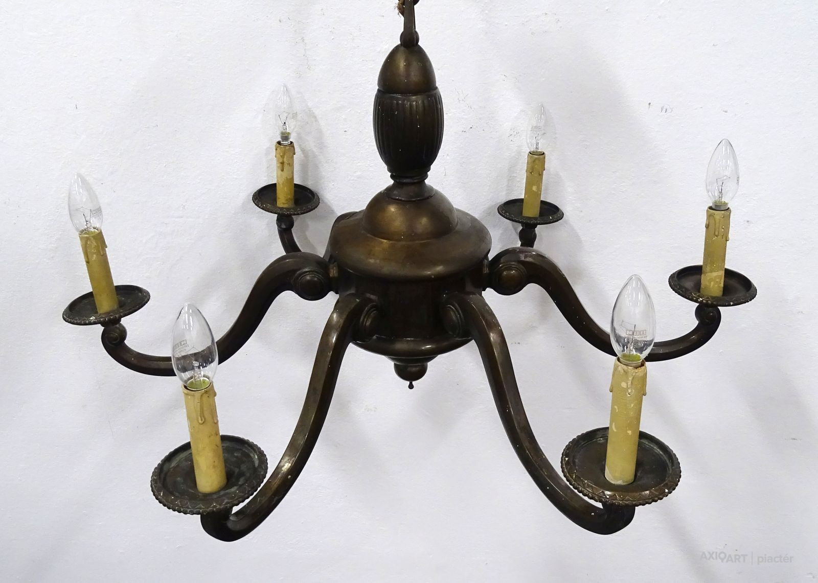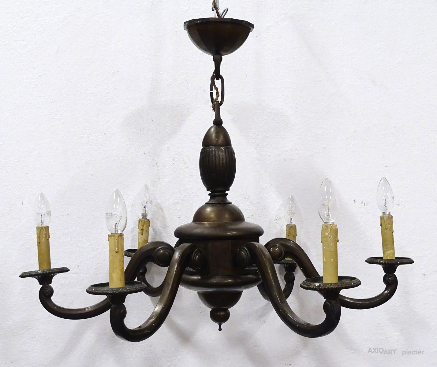 Antik hatkarú bronz csillár. A karok papírmasé gyertyákban végződnek, kis méretű (E14) izzó való bele. Némelyik gyertya eldől, javításra szorul.