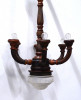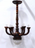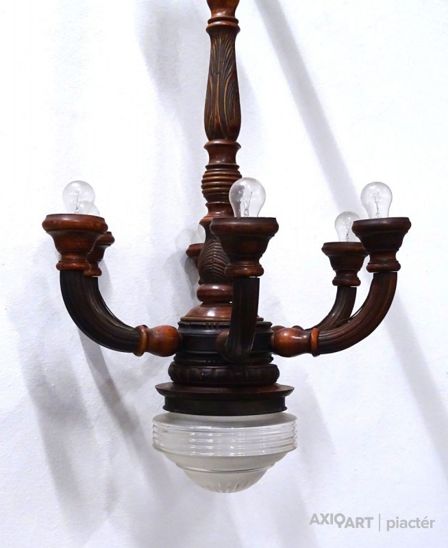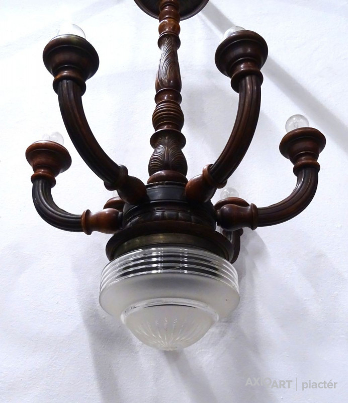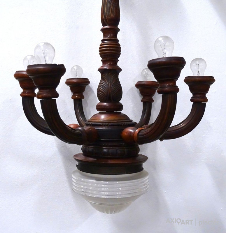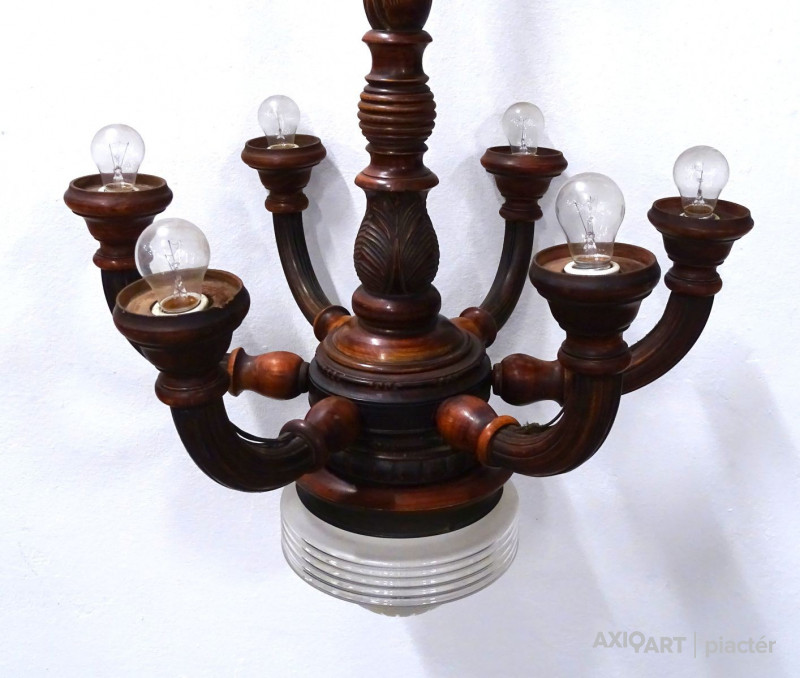 Hatkarú, hétégős, antik faragott fa csillár. Alján nagyméretű csiszolt lámpabura. Nagyméretű (E27) izzó való bele.