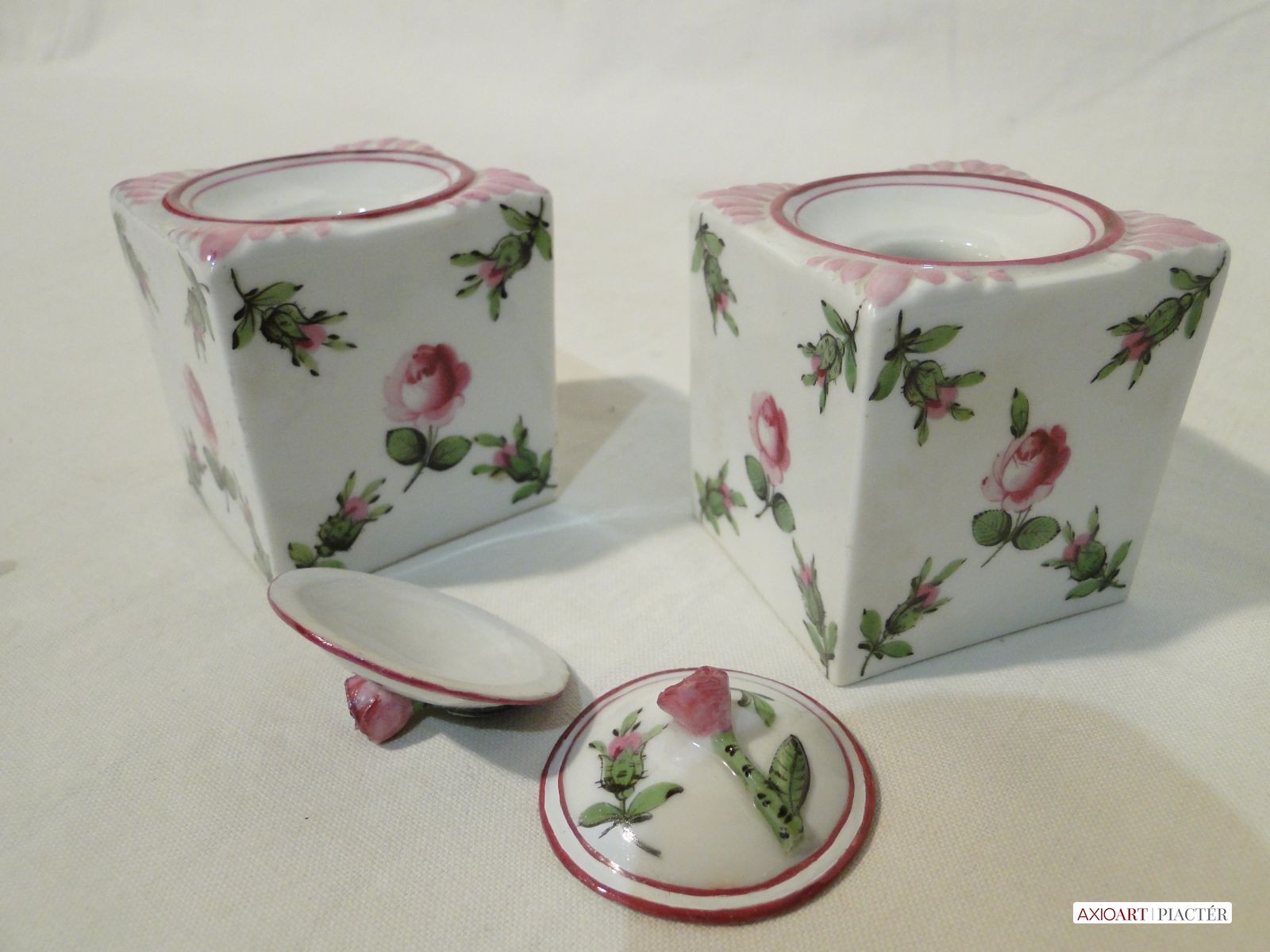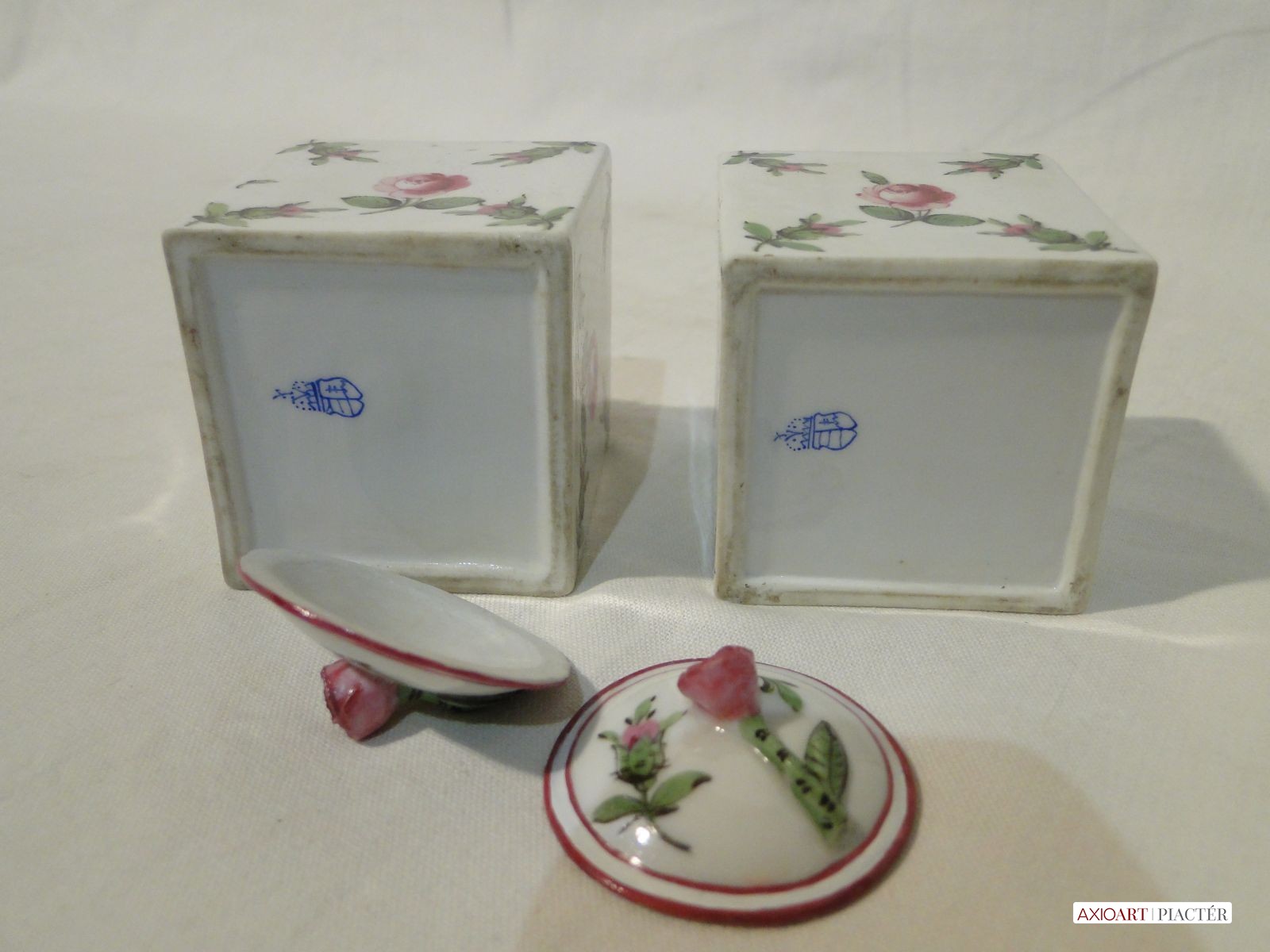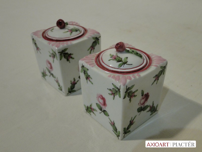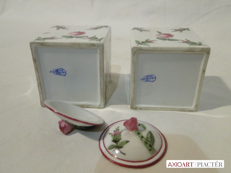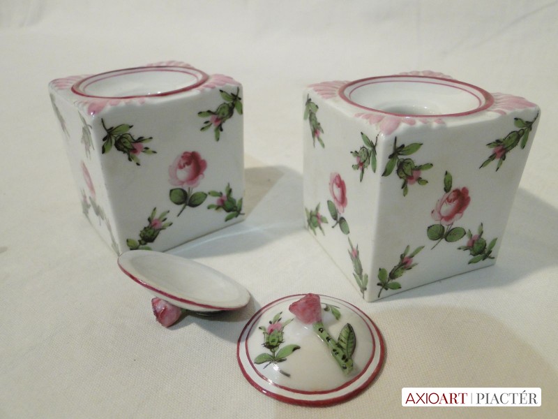 1930-as évekbeli antik herendi porcelán tégelyek, aljukon kézzel rajzolt herendi jelzés. Mindkét tégely mintázata holicsi rózsamintás.
