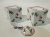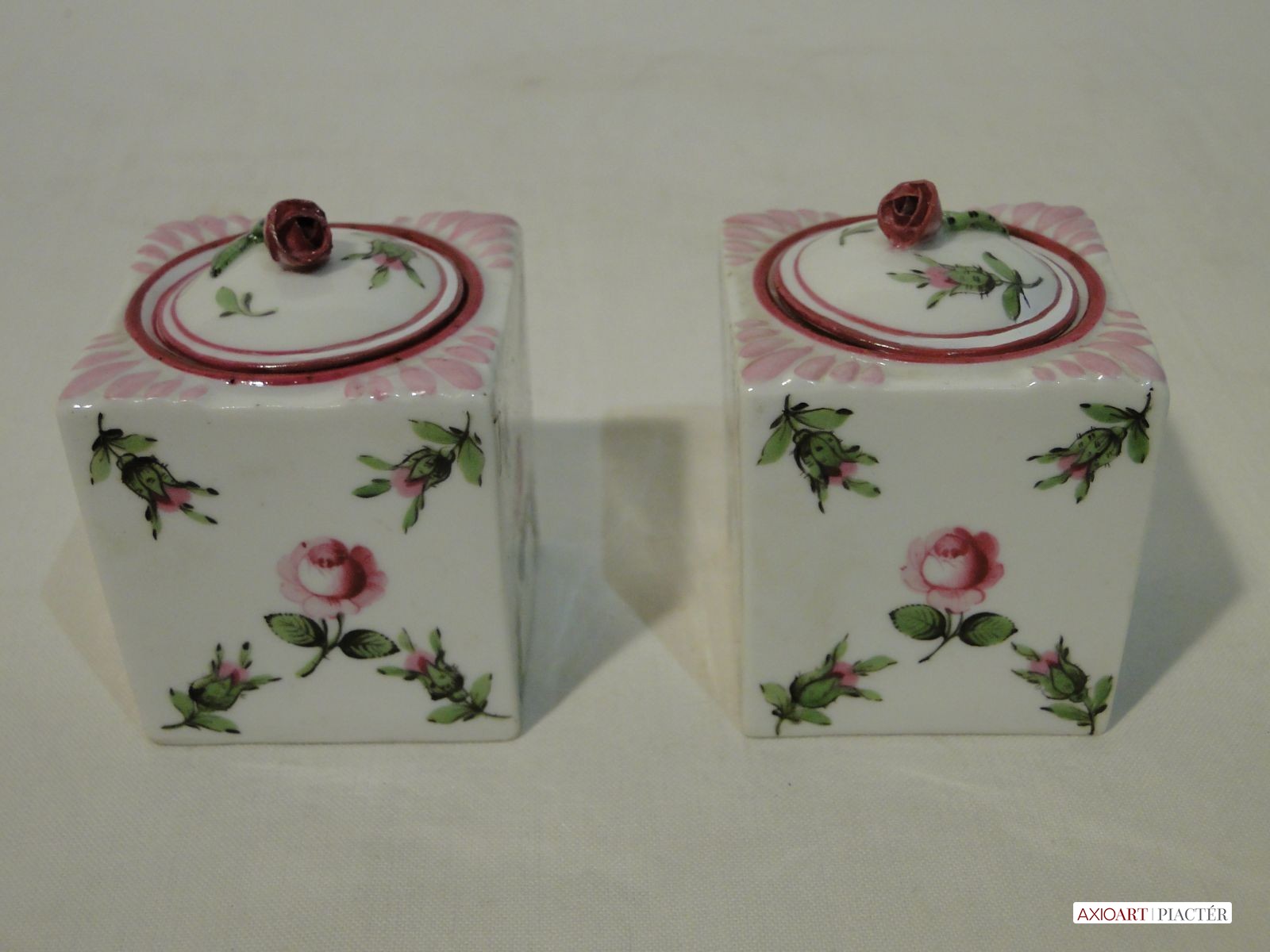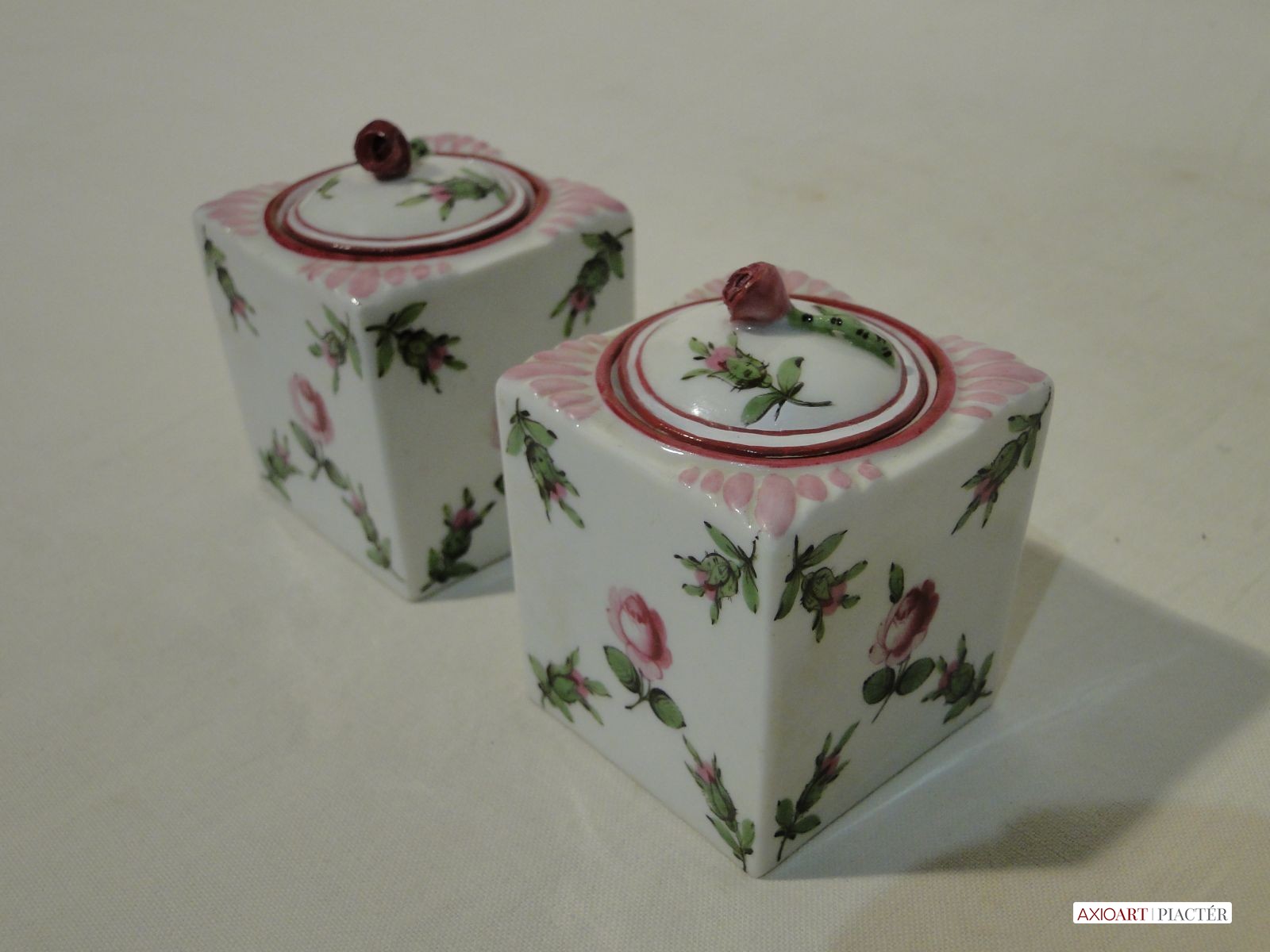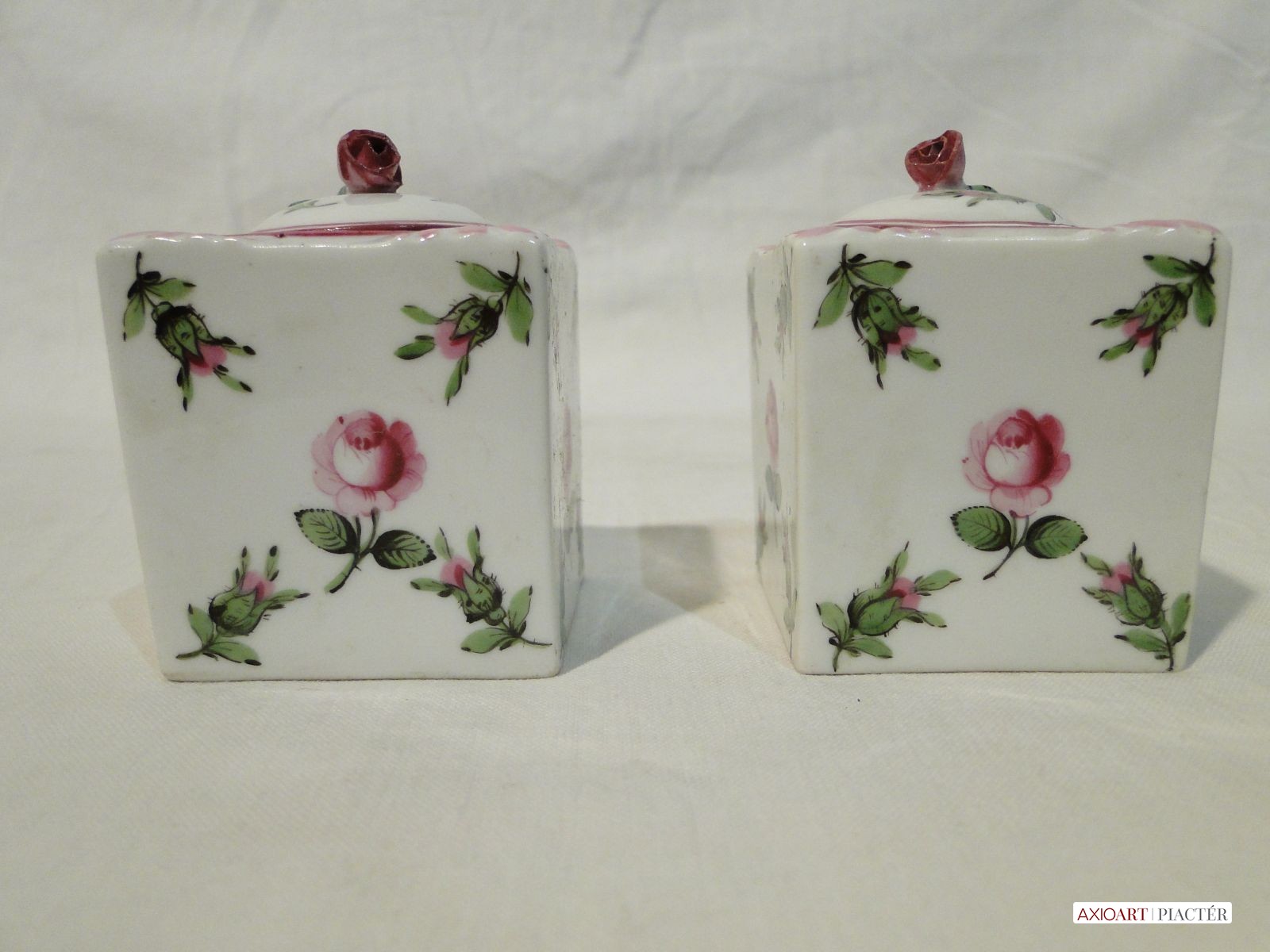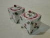 1930-as évekbeli antik herendi porcelán tégelyek, aljukon kézzel rajzolt herendi jelzés. Mindkét tégely mintázata holicsi rózsamintás.