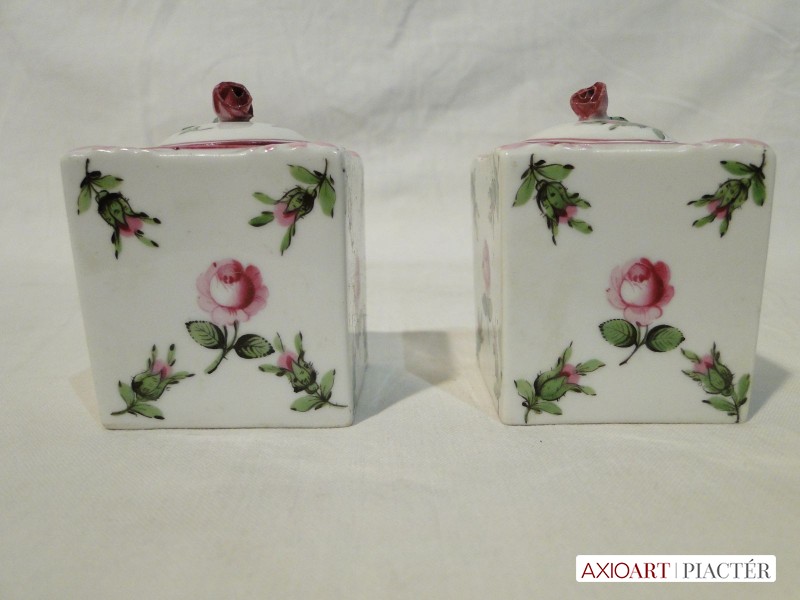 [5211/VTR-4] 1930-as évekbeli antik herendi porcelán tégelyek, aljukon kézzel rajzolt herendi jelzés. Mindkét tégely mintázata holicsi rózsamintás. Az egyik tégely tetején restaurálás nyomok láthatóak a rózsán és a tetőn. A többi része hibátlan, szép, ép. Herendi kuriózum, múzeumba való darabok. Magasság: 6.5 cm Szélesség: 5 cm Hosszúság: 5 cm Súly: 0.257 kg