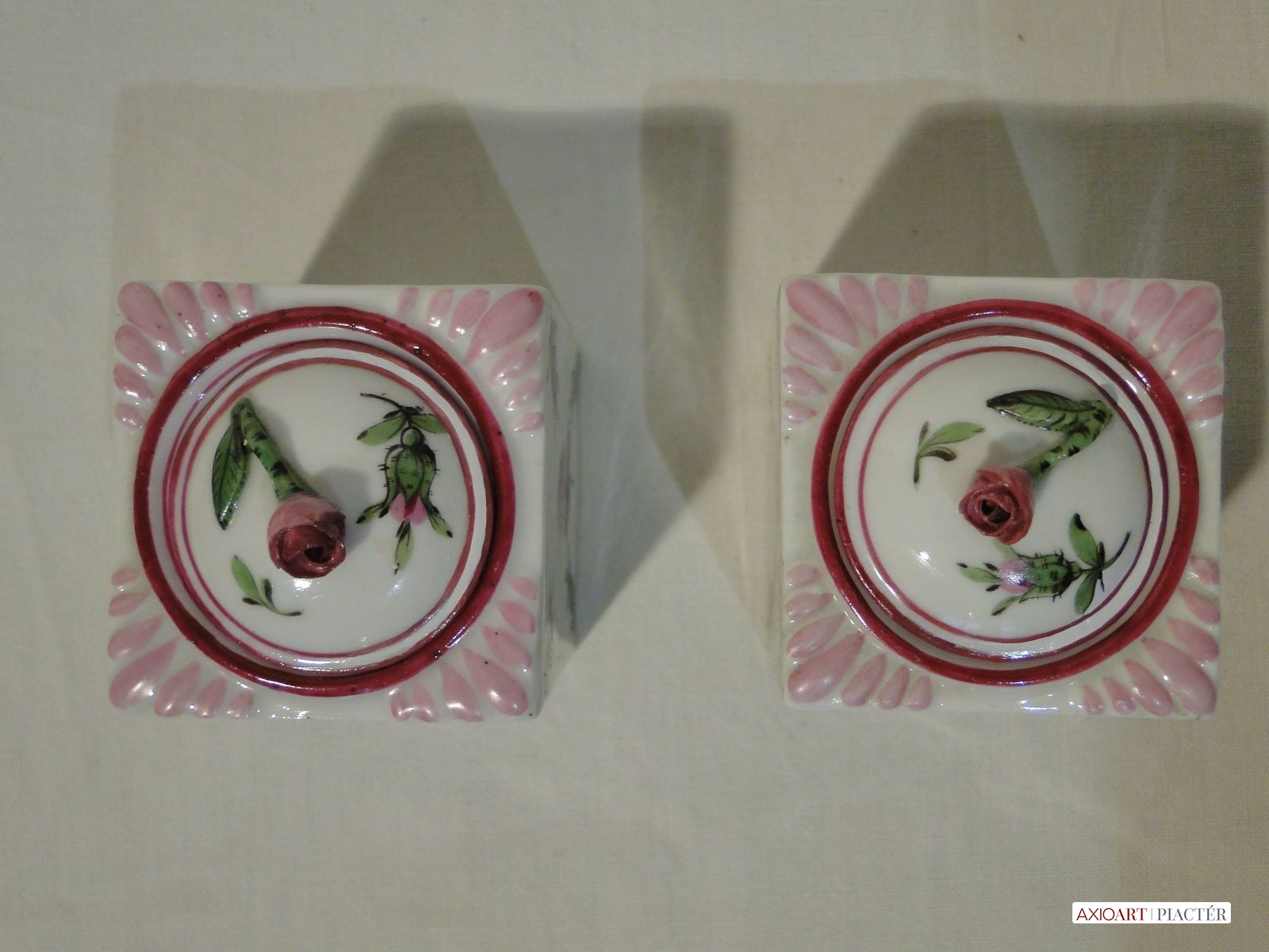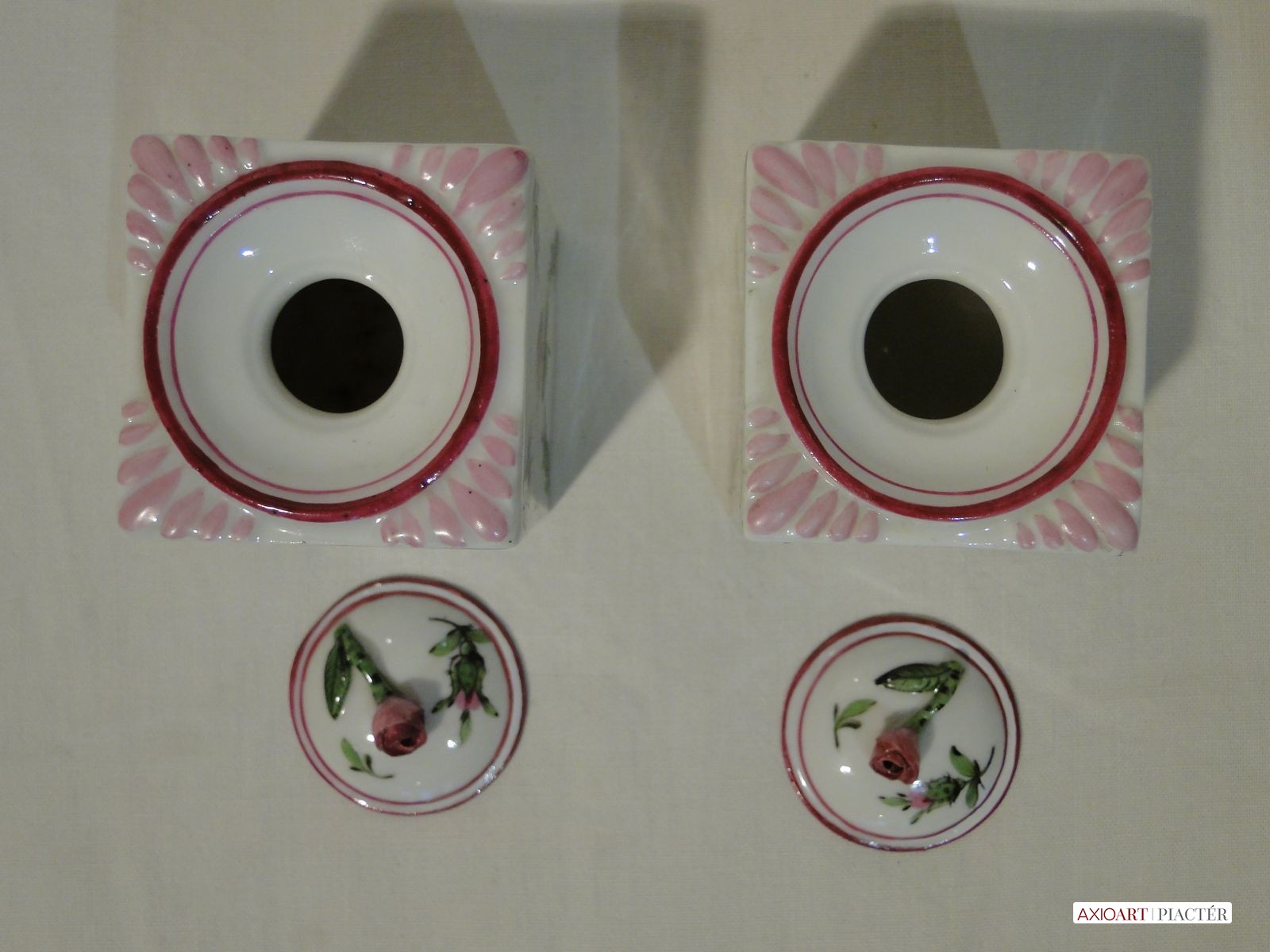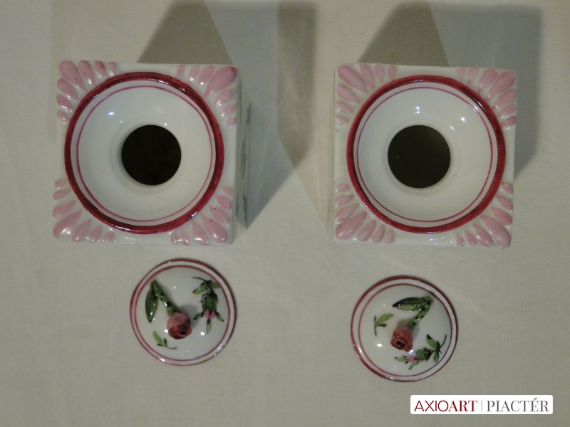 Az egyik tégely tetején restaurálás nyomok láthatóak a rózsán és a tetőn. A többi része hibátlan, szép, ép.