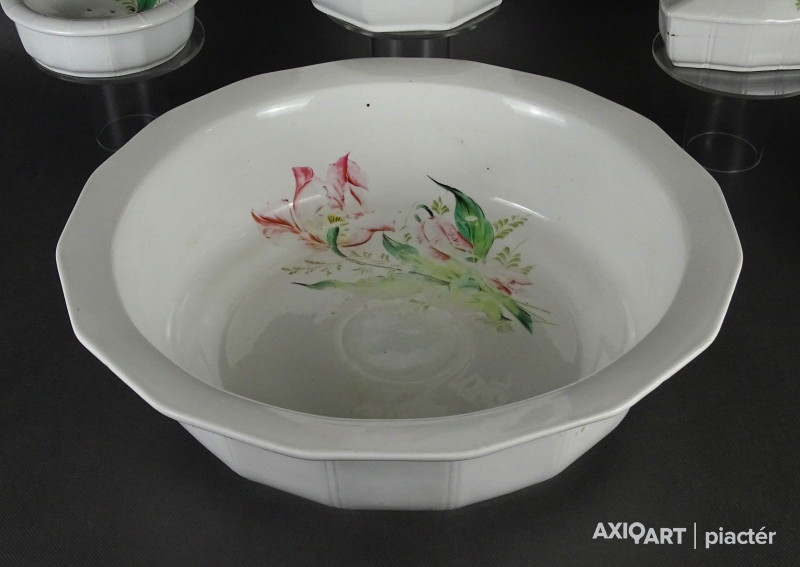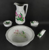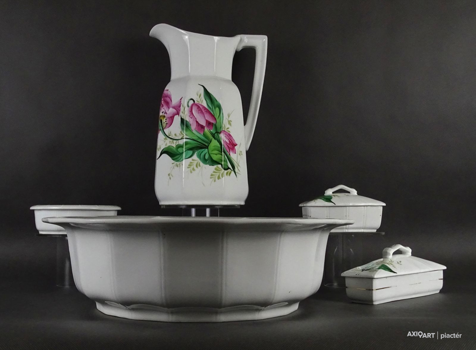 Gyönyörű, szép állapotú, öt darabos nagy méretű kézzel festett porcelán mosakodó készlet.