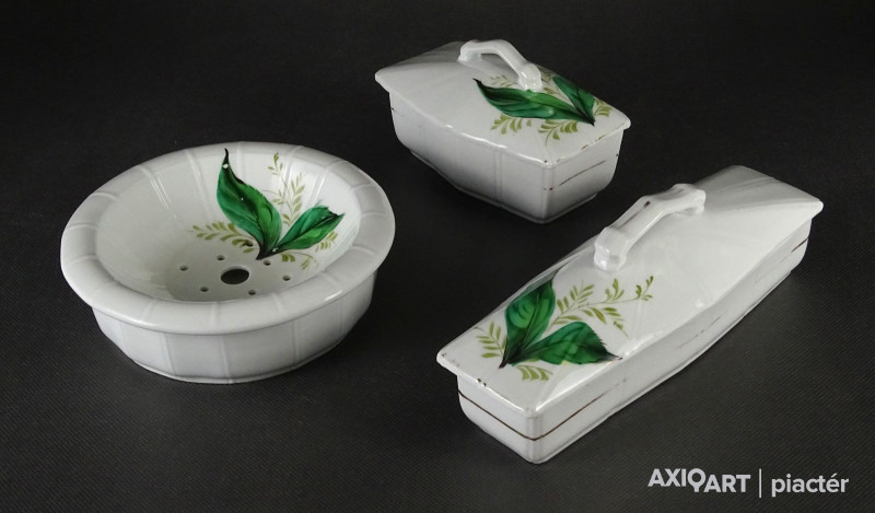 [1N289/Z039] Gyönyörű, szép állapotú, öt darabos nagy méretű kézzel festett porcelán mosakodó készlet. A készlet darabjai: - 1 darab nagy méretű mosdókancsó (34 x 16.8 x 22.3 cm) Fülénél kisebb hajszálrepedés. - 1 darab nagy méretű mosdótál (12.8 x 43.7 cm) - 1 darab kör alakú szappantartó (5.3 x 16.8 cm) Peremén kisebb lepattanás. - 1 darab fedeles fogkefe tartó (8.5 x 7.3 x 22.7 cm) - 1 darab fedeles tároló doboz (8.8 x 9.2 x 14.6 cm) Fedelén csillagrepedés. Alján formaszám: 4002 4 Súly: 6.945 kg