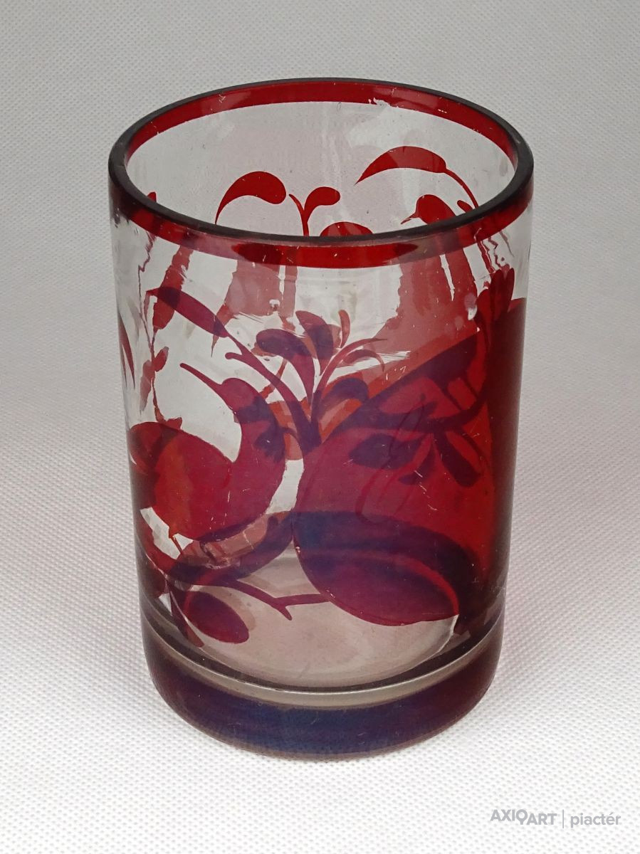 [1F628/UZ-K] Antik, szép állapotú vastag falú bíborpácolt Biedermeier fújt üveg pohár. Oldalán indás, madaras díszítés és surolófényben is nehezen látható kopottas felirat: EMLÉKÜL Magasság: 11.3 cm Szélesség: 7.8 cm Súly: 0.295 kg
