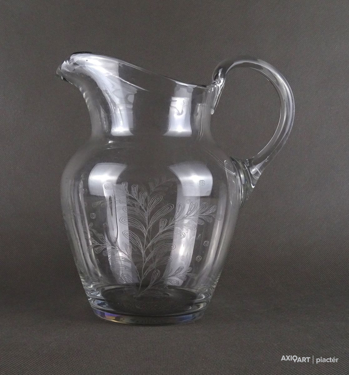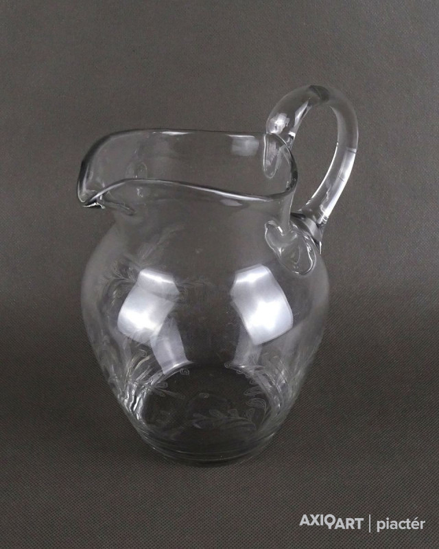 Hibátlan állapotú, fújt üveg kancsó, boros kancsó, borkínáló. Oldalán maratott motívummal díszített. A fújás, szakítás nyoma a talpán szépen ki van csiszolva.