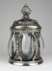 [1S331/Z058] Régi, hibátlan állapotú, üvegbetétes áttört fém cukortartó bonbonier. Gyönyörű hólyagos fújt üveg dísztárgy. Magasság: 17 cm Szélesség: 10.5 cm Hosszúság: 13.5 cm Súly: 1.23 kg
