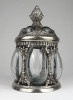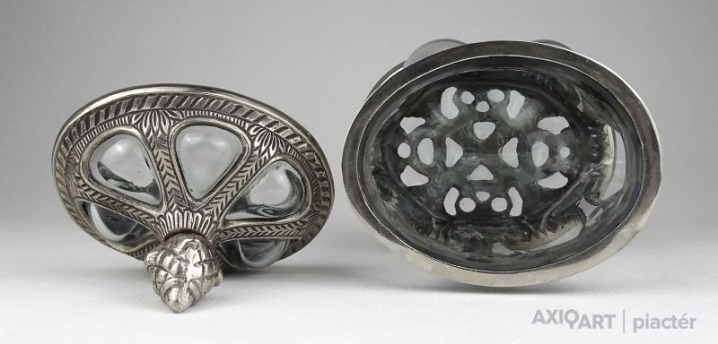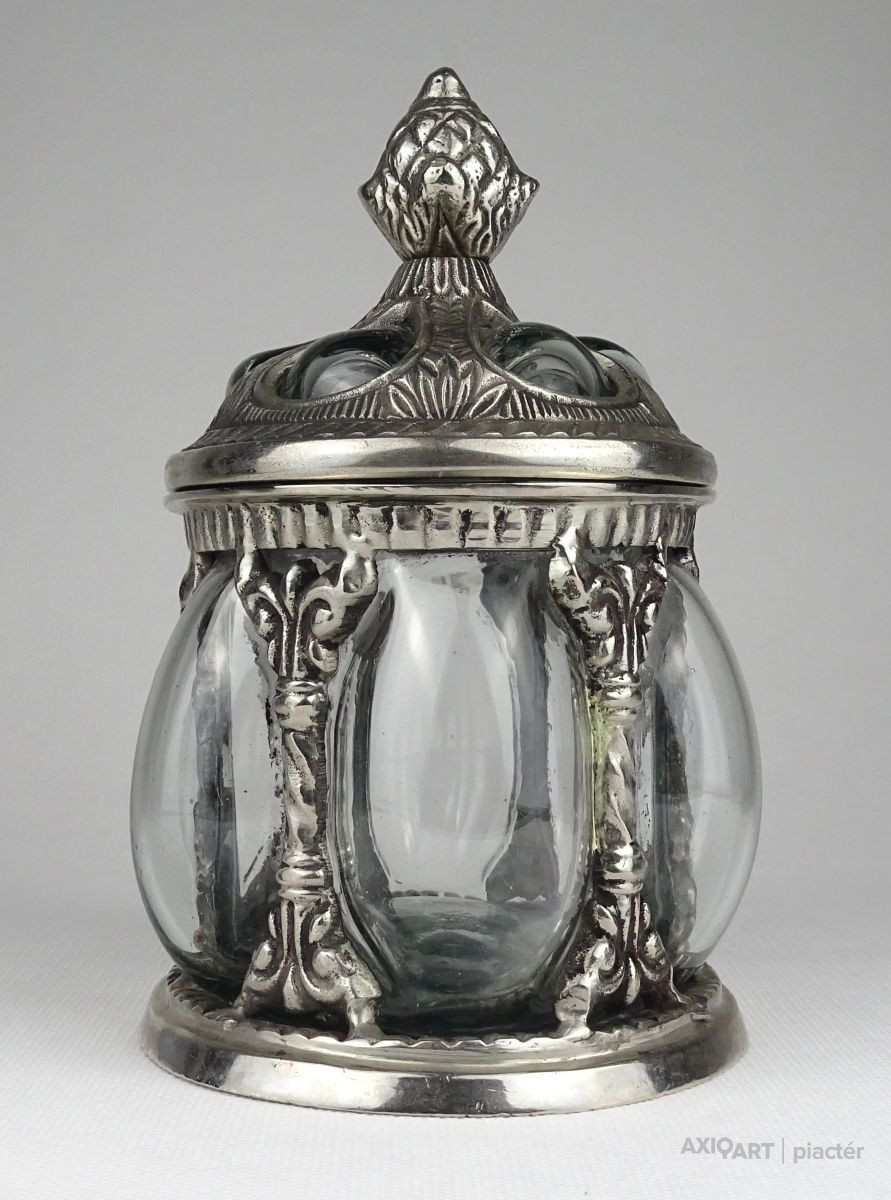 Régi, hibátlan állapotú, üvegbetétes áttört fém cukortartó bonbonier. Gyönyörű hólyagos fújt üveg dísztárgy.