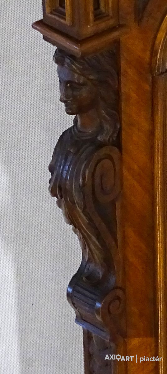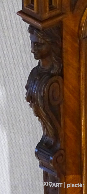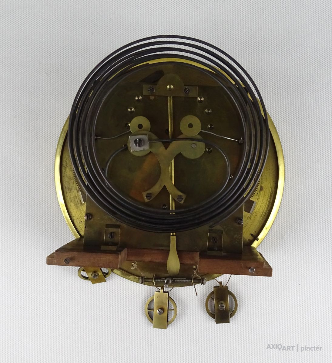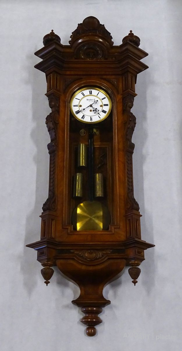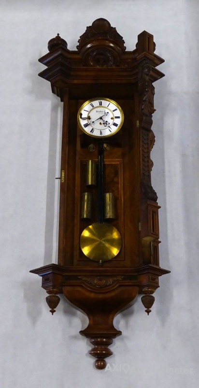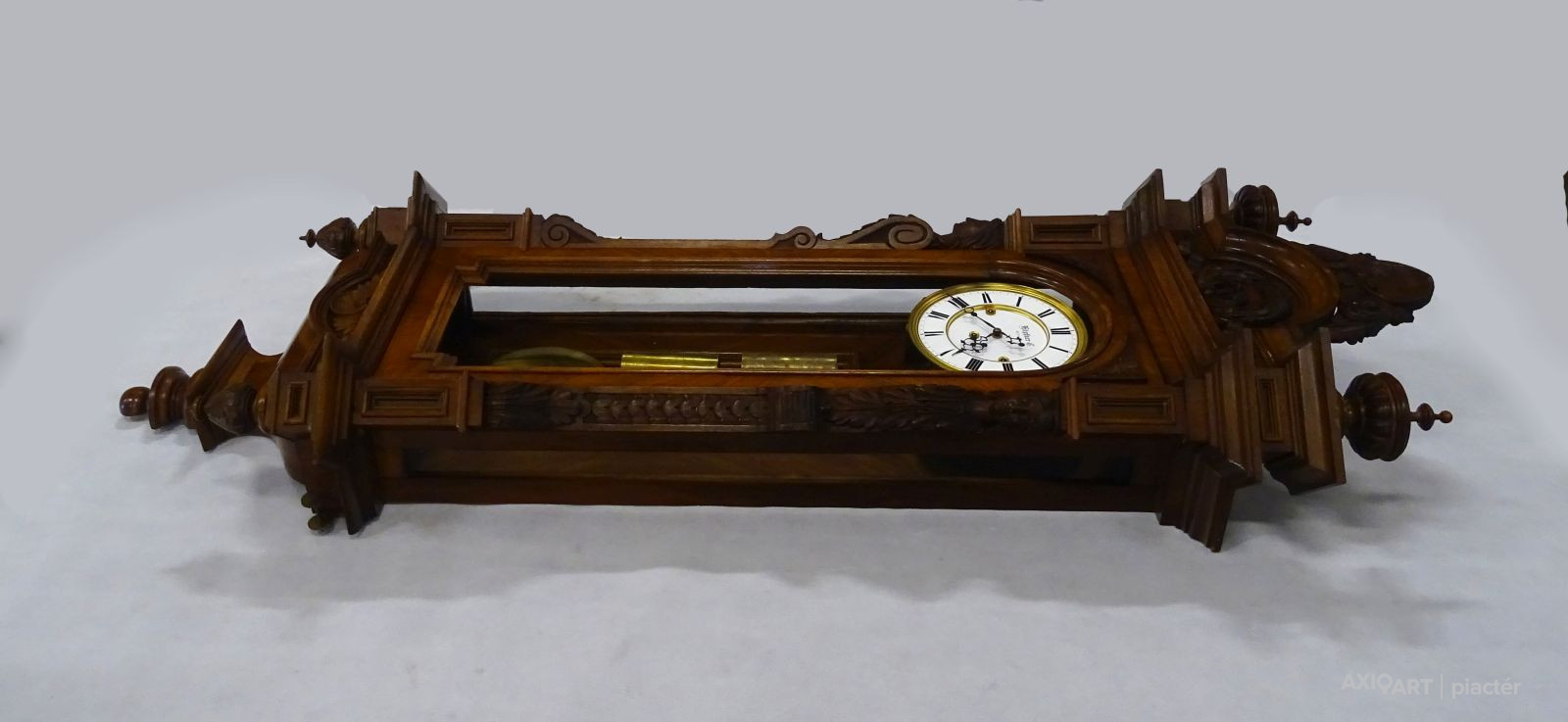 Antik, működő állapotban lévő nagyméretű, faragásokkal gazdagon díszített ónémet falióra az 1900-as évek elejéről. Negyed ütős, háromsúlyos, ingás óraszerkezettel rendelkezik. Felhúzó kulcsa is megvan.