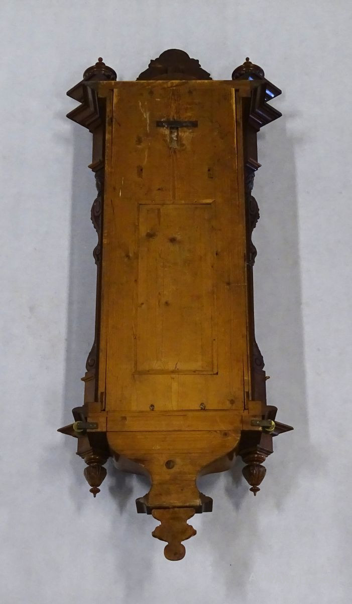 [1T385/BX-10] Antik, működő állapotban lévő nagyméretű, faragásokkal gazdagon díszített ónémet falióra az 1900-as évek elejéről. Negyed ütős, háromsúlyos, ingás óraszerkezettel rendelkezik. Felhúzó kulcsa is megvan. Kézi festett zománc számlapon felirat: HÖPFNER B. BUDAPEST Magasság: 137 cm Szélesség: 50 cm