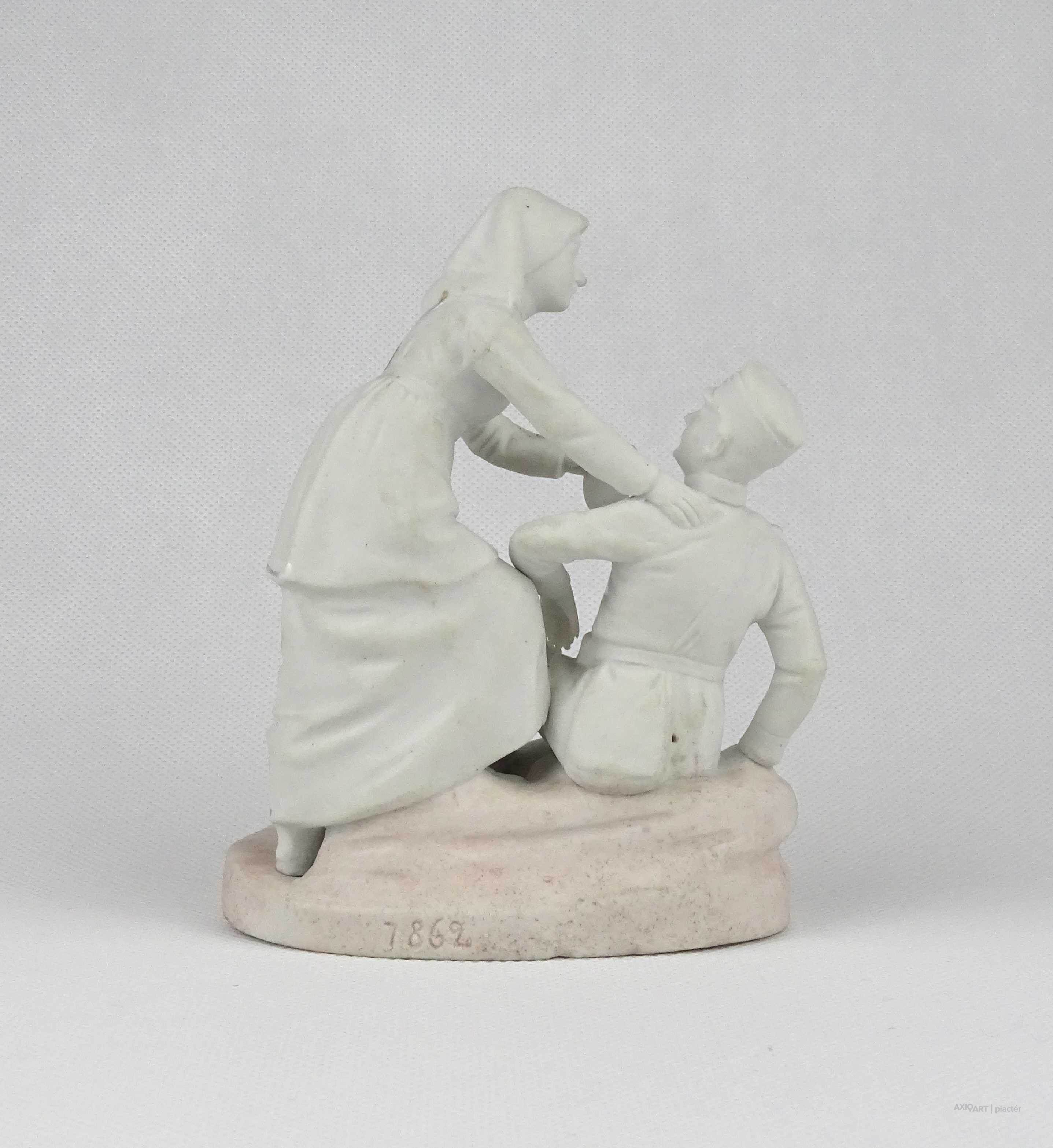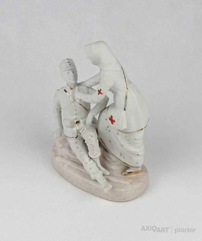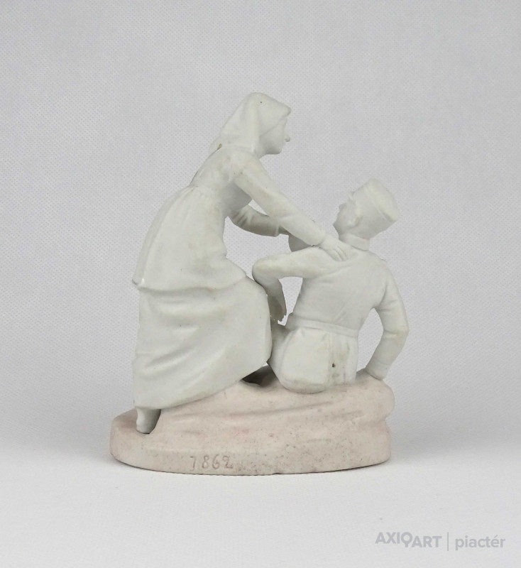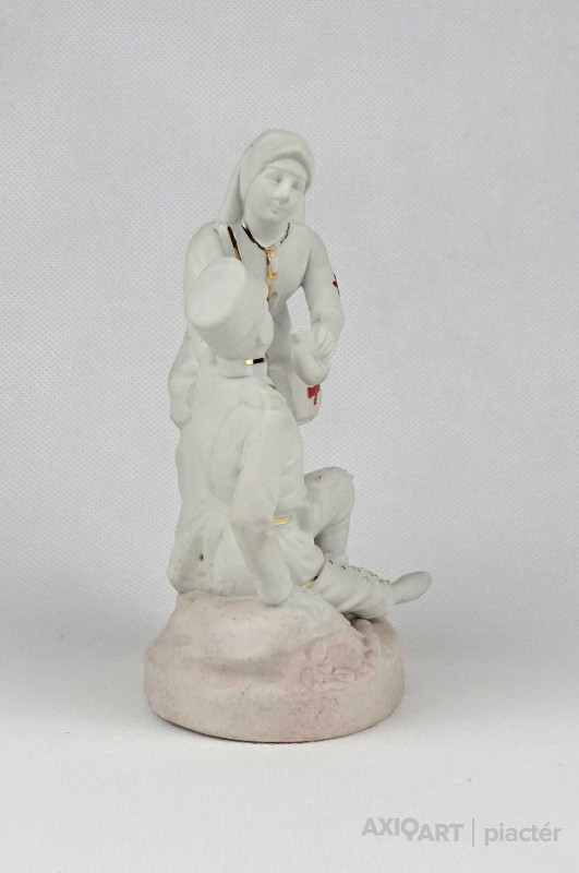 [1V398/Z010] 25% ÁRENGEDMÉNY MINDEN TERMÉKÜNKRE Dec. 14-ig Antik, jelzetlen világháborús témájú kétalakos biszkvit porcelán figura, sebesült katonát ápoló nővér. Ritka, gyűjteménybe illő darab! Formaszám: 7862 Magasság: 14 cm Szélesség: 7 cm Hosszúság: 11 cm Súly: 0.185 kg