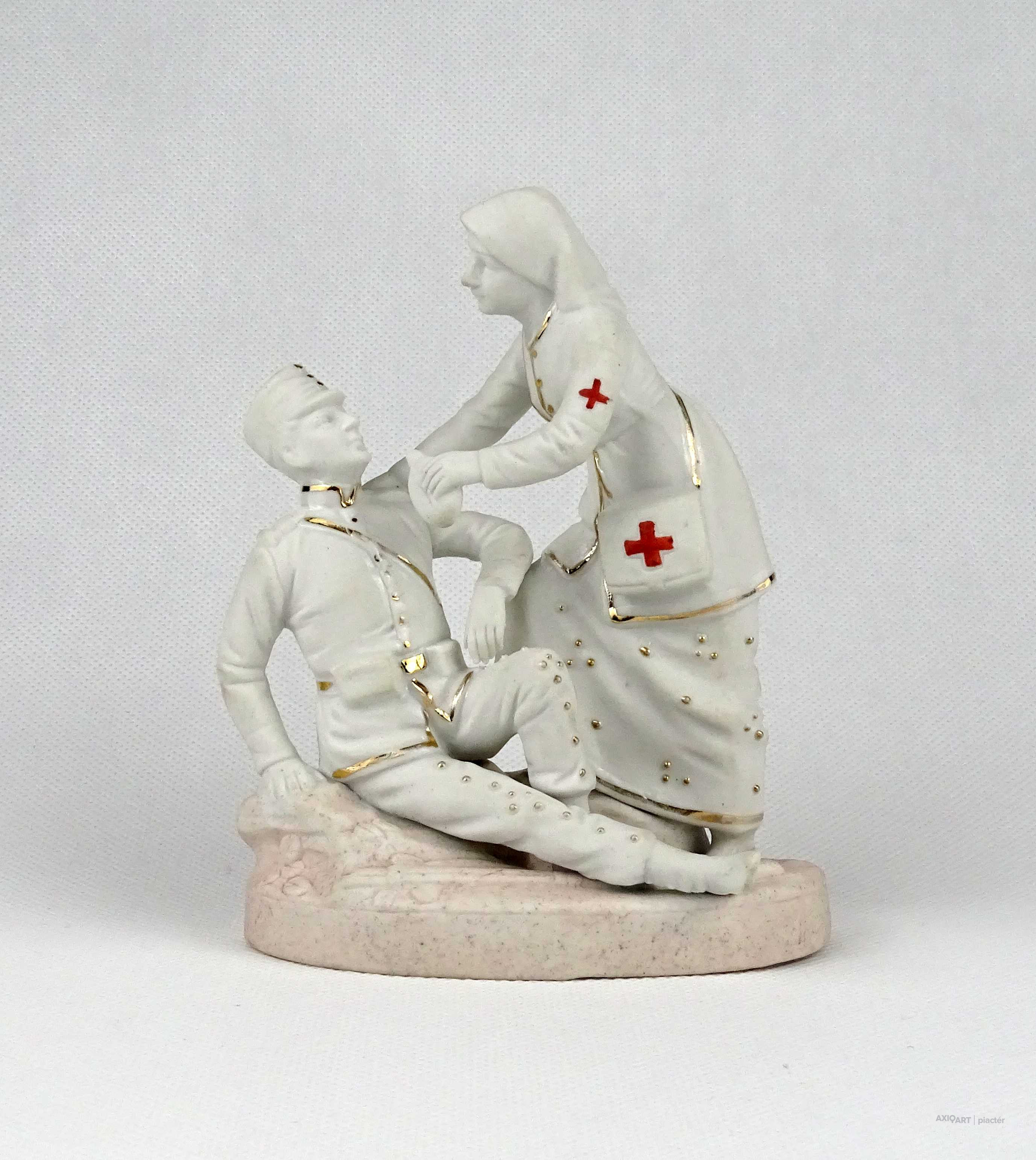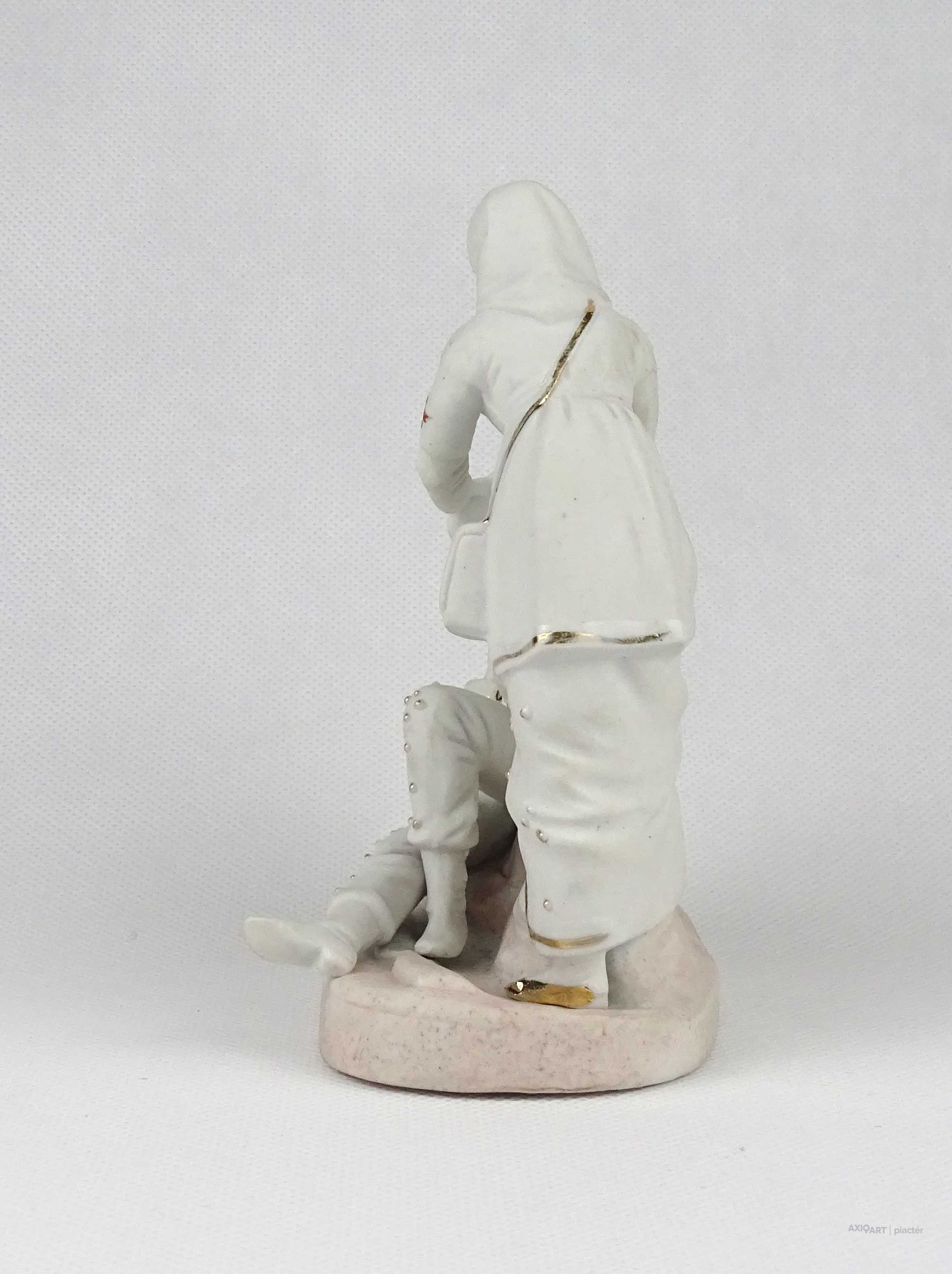Antik I. világháborús biszkvit porcelán katona és vöröskeresztes nővér figurával 14 cm