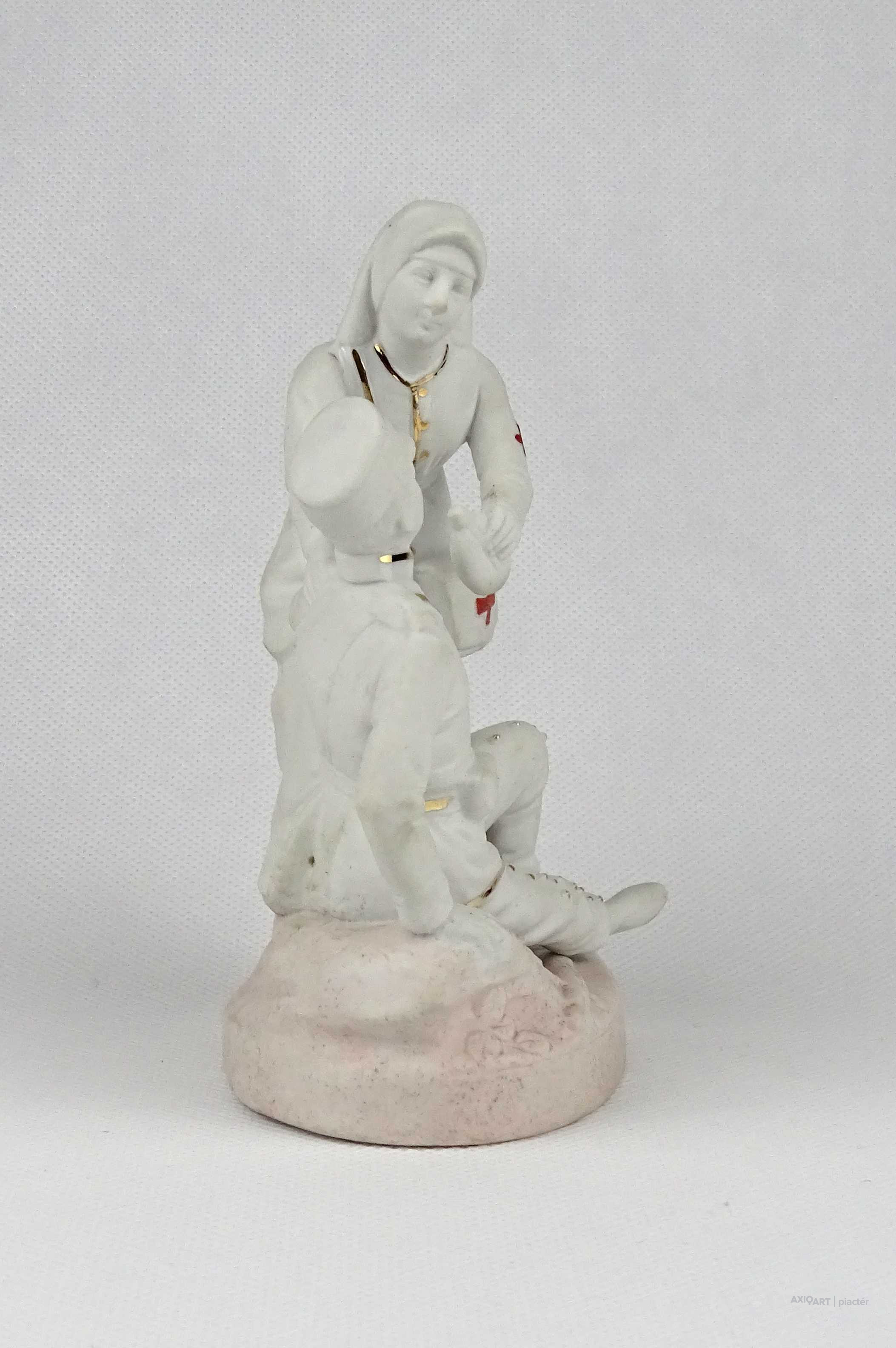 Antik, jelzetlen világháborús témájú kétalakos biszkvit porcelán figura, sebesült katonát ápoló nővér.