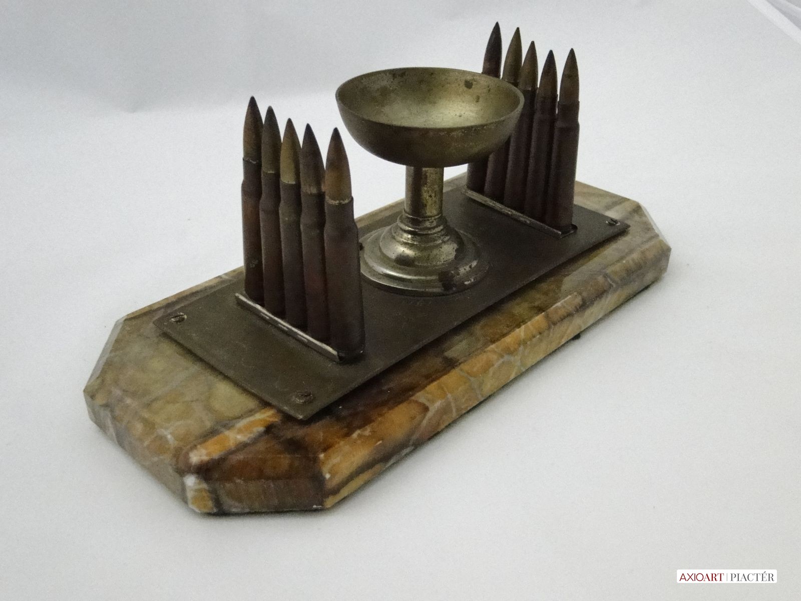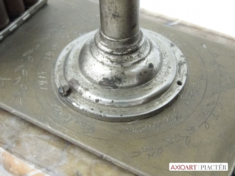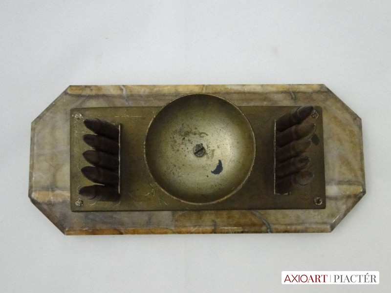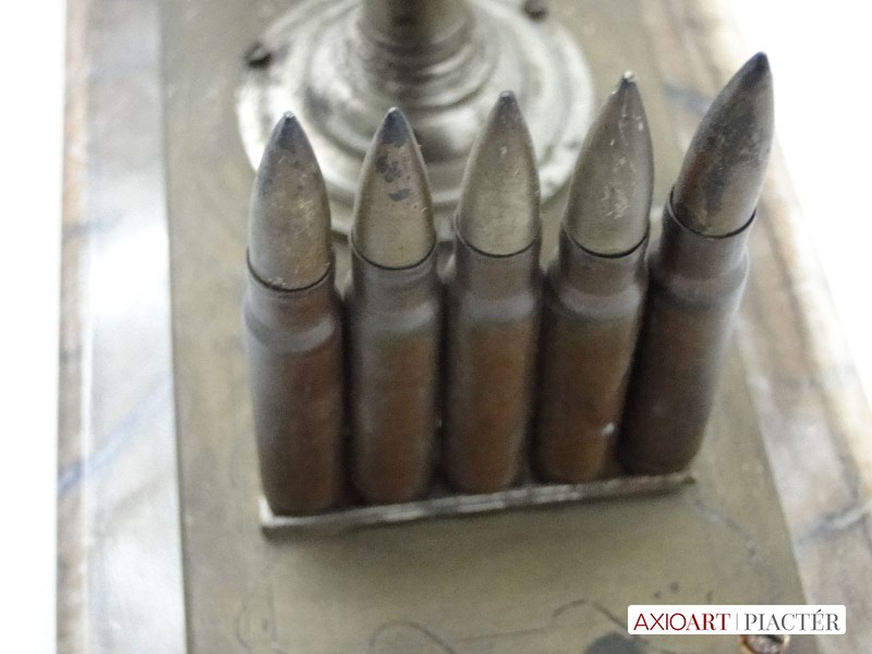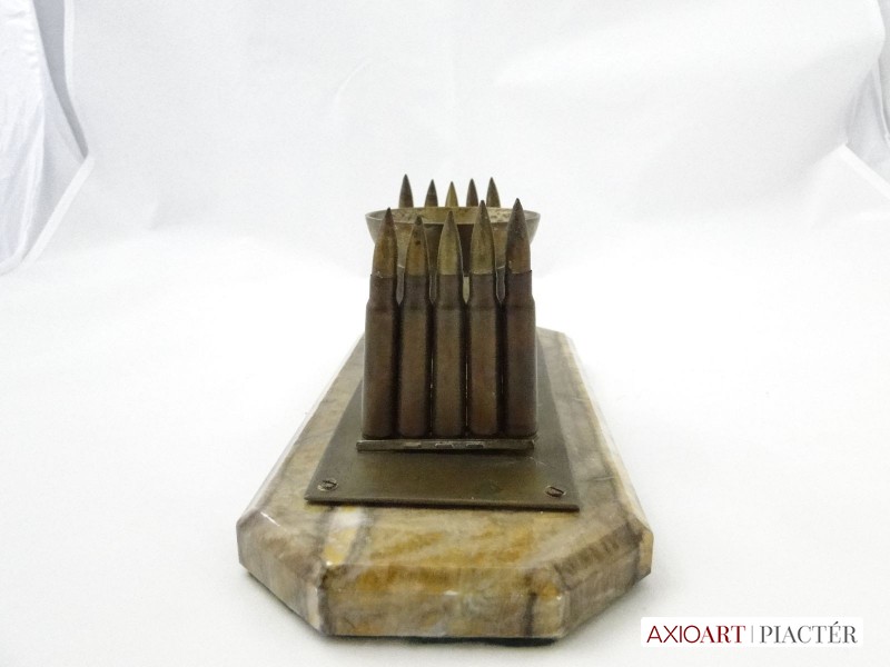 [6086/UZ-N] 10 töltényhüvely díszítéses asztali hadi emlék, alatta gravírozott felirattal, márvány szerű talapzaton. A talapzaton lévő töredékes felirat: VILÁG HÁBORÚ EMLÉKE 1914 1915 ISTEN ... Magasság: 11 cm Szélesség: 12 cm Hosszúság: 27 cm Súly: 1.944 kg Maga a tárgy talapzat nélkül 20 x 8 cm, magassága 9 cm.