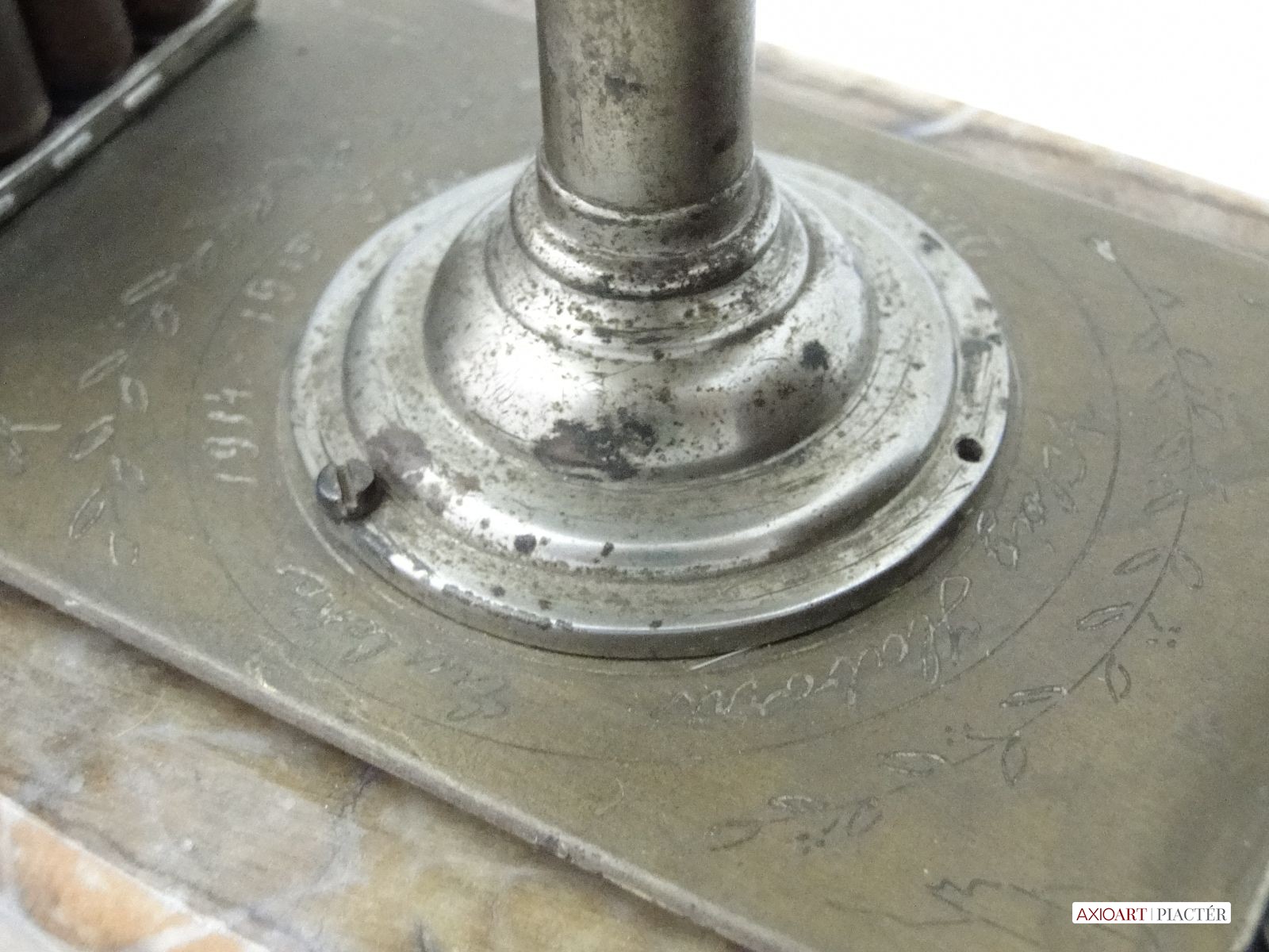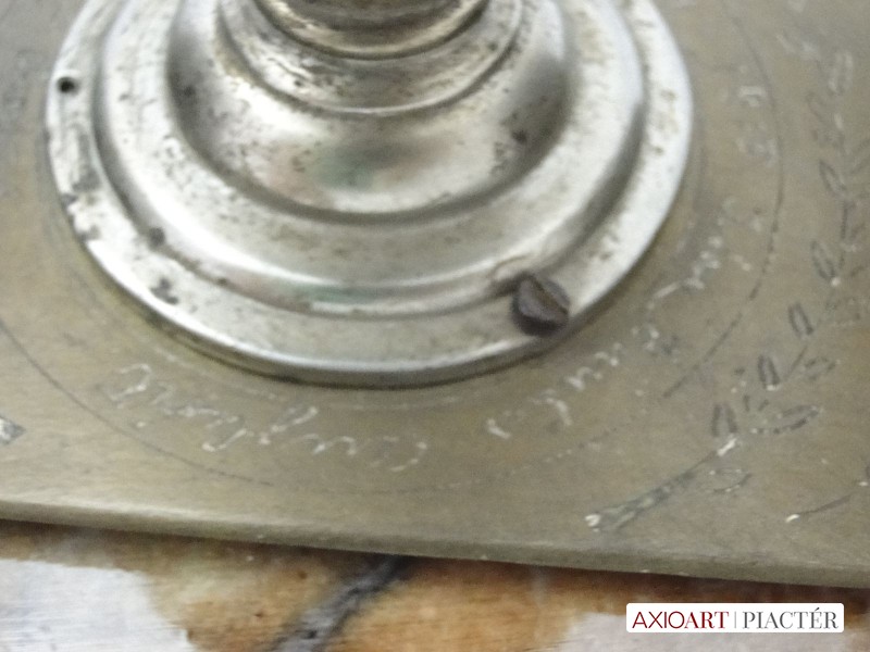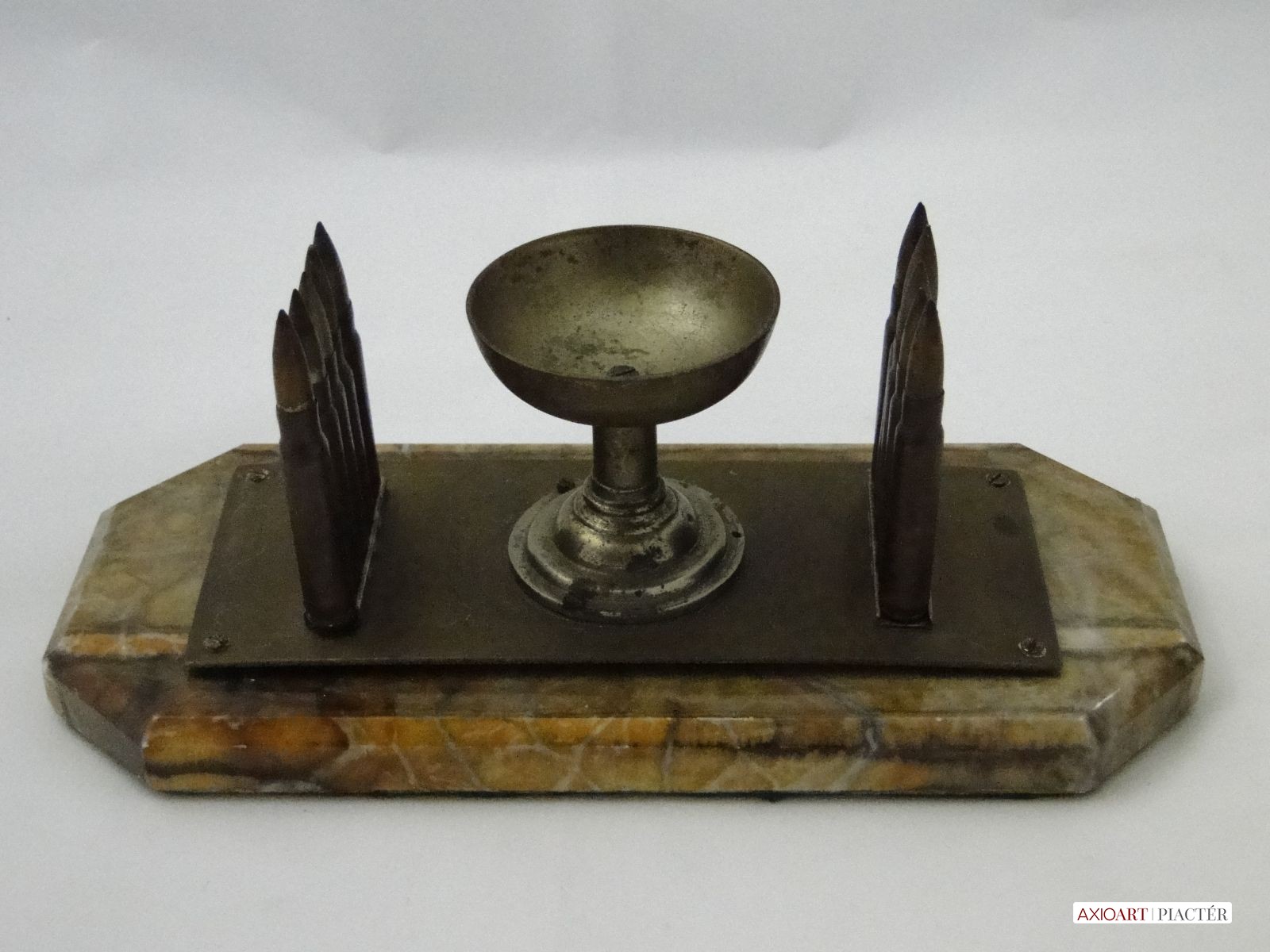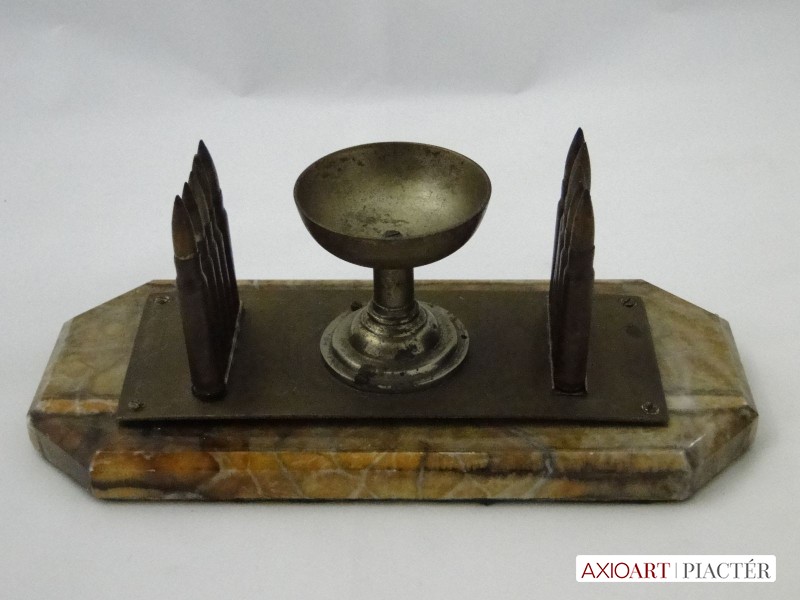 [6086/UZ-N] 10 töltényhüvely díszítéses asztali hadi emlék, alatta gravírozott felirattal, márvány szerű talapzaton. A talapzaton lévő töredékes felirat: VILÁG HÁBORÚ EMLÉKE 1914 1915 ISTEN ... Magasság: 11 cm Szélesség: 12 cm Hosszúság: 27 cm Súly: 1.944 kg Maga a tárgy talapzat nélkül 20 x 8 cm, magassága 9 cm.