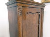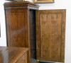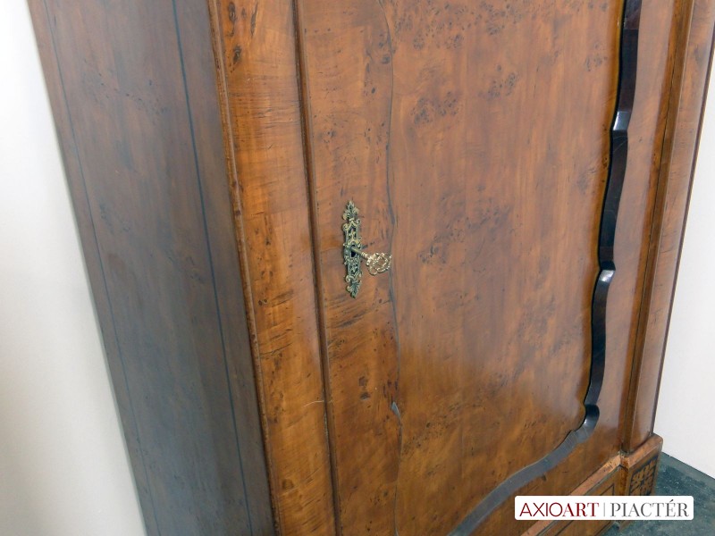 [0C813/UZ-N] Gyönyörű, eredeti felújítatlan állapotában lévő, vastag svartnis akasztós ruhásszekrény az 1800-as évek végéről. A bútoron gyönyörű habos kőris furnér található. A bútor oldalán és a lábain alul intarzia díszítés található, két oszlopán felül faragvány rátét díszítés látható. A bútor különlegessége hogy az akasztós rész alatt középen a lábazatban egy fiók található. Belsejében ruha akasztási lehetőség, illetve két oldalán farkas fogas kialakítású polc tartó lehetősége található. Hátulja osztott, csapott deszkás, eredeti. Magasság: 179 cm Szélesség: 109 cm