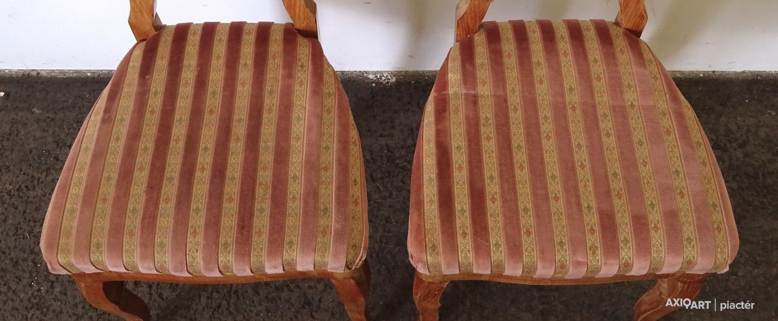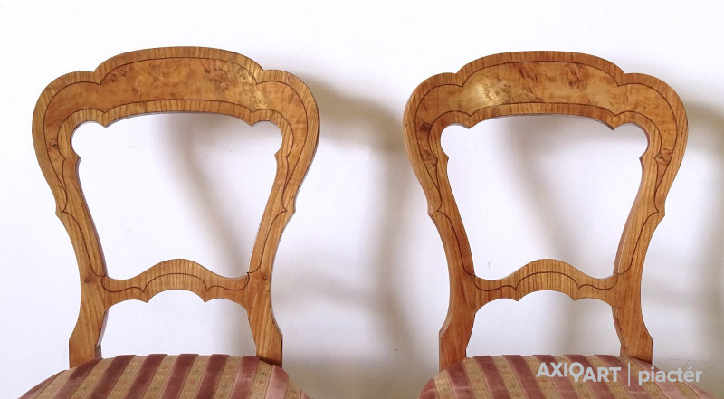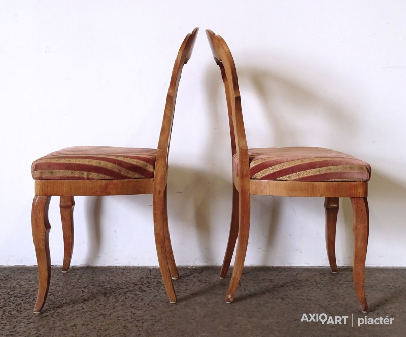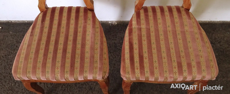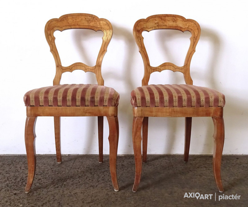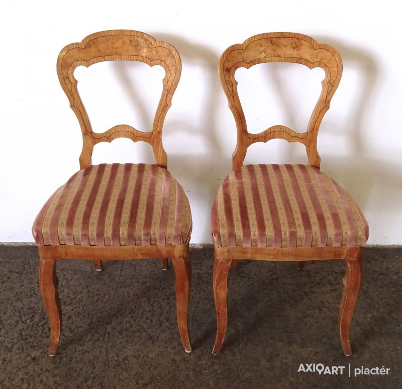 Hibátlan állapotú, gyönyörű, furnér intarziával díszített, biedermeier szék pár az 1800-as évek második feléből, cca 1880. Azonnal használatba vehető, enteriőrbe helyezhető állapotban van.