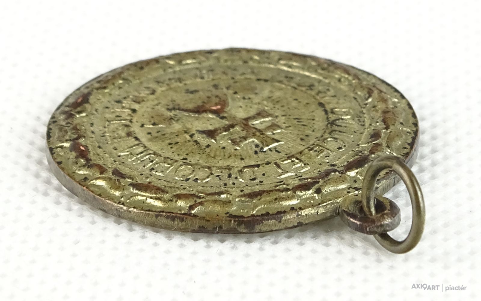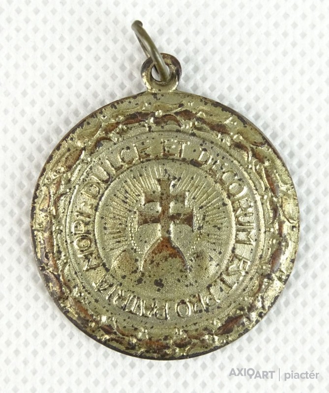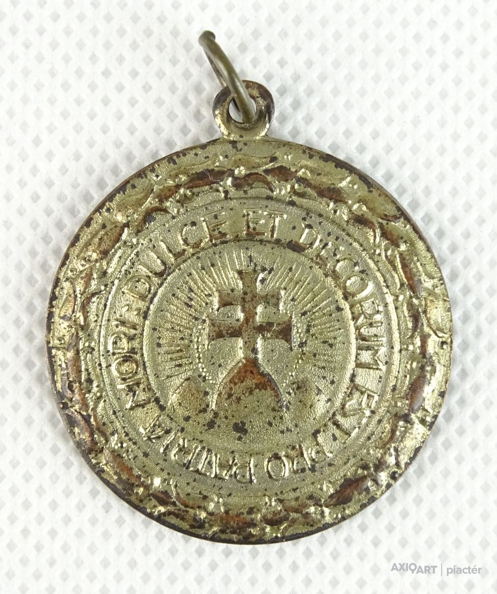 [0S898/X024/2] Gyönyörű, irredenta elemekkel díszített, ezüst színű sportérem. Egyik oldalán felirat: DULCE ET DECORUM EST PRO PATRIA MORI Illyés Gyula fordításában: " SZÉP ÉS MAGASZTOS HALNI EZÉRT: HAZA! " Másik oldalán felirat: KÖZÉPFOKÚ ISKOLÁK SPORTKÖREINEK ORSZ. SZÖV. VERSENYDÍJA Az érmet szalag, kard, babérlevél, Nagymagyarország, kettős kereszt, hármashalom és körben szecessziós virágmotívum díszíti. Gyönyörű sport, nemzeti relikvia. Gyűjtőknek ajánljuk! Az érem valószínűleg a 30-as évekből származik. Szélesség: 3 cm Súly: 0.013 kg