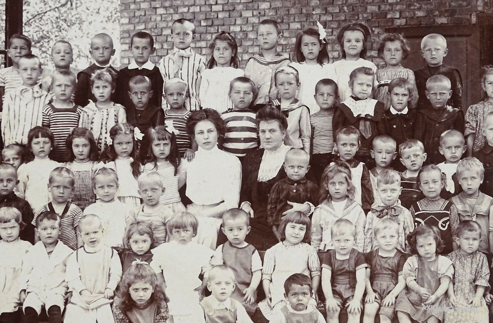 Szép állapotban megmaradt antik iskolai osztály fénykép, csoportkép az 1900-as évek elejéről. 69 vegyes korosztályú tanuló és 3 tanár.