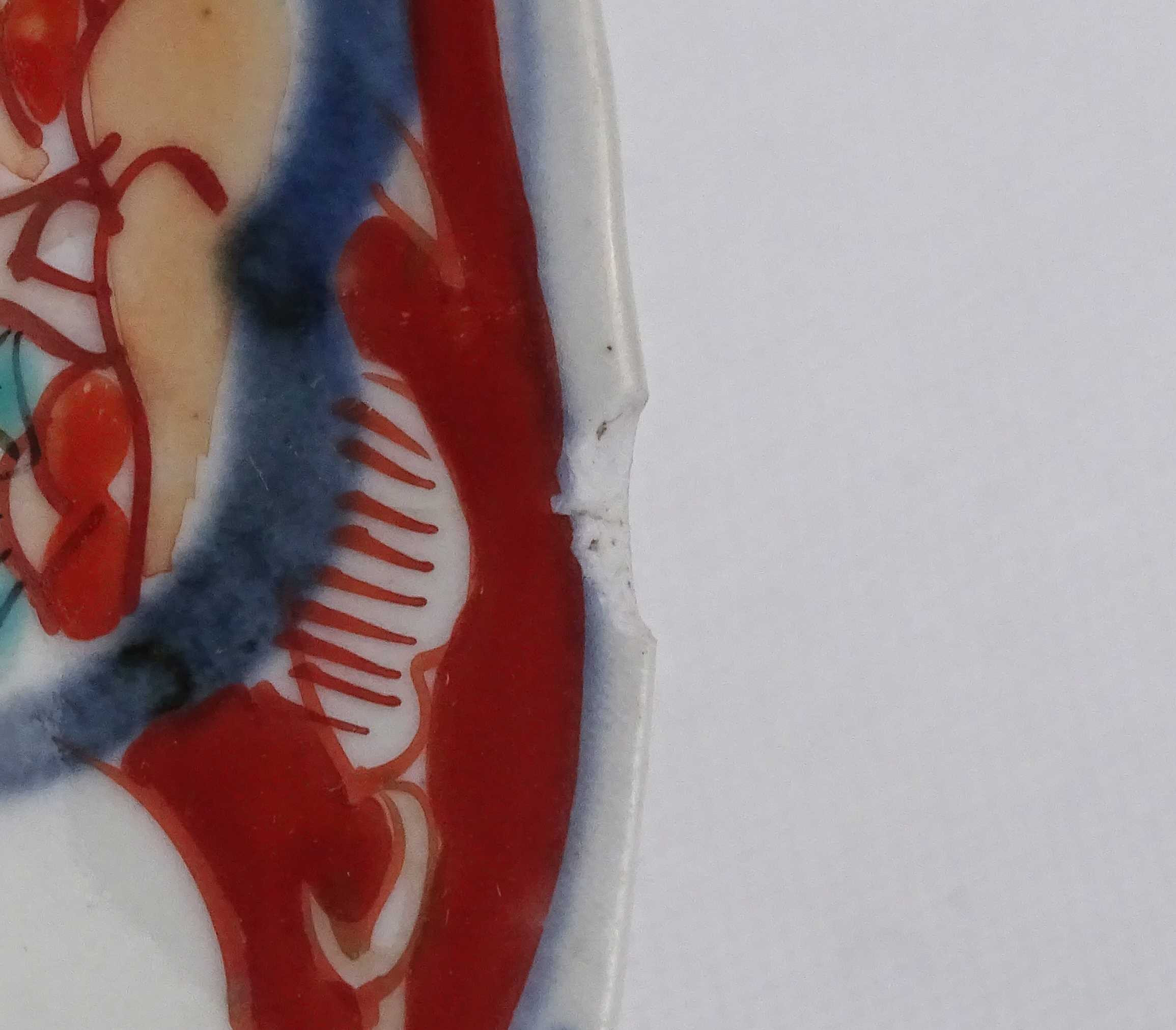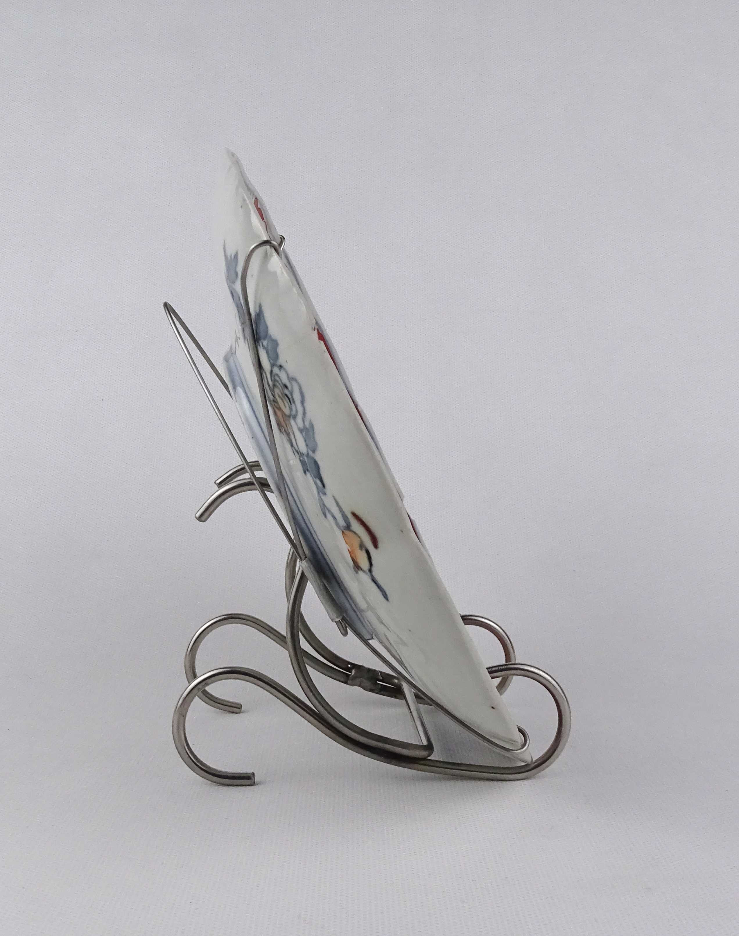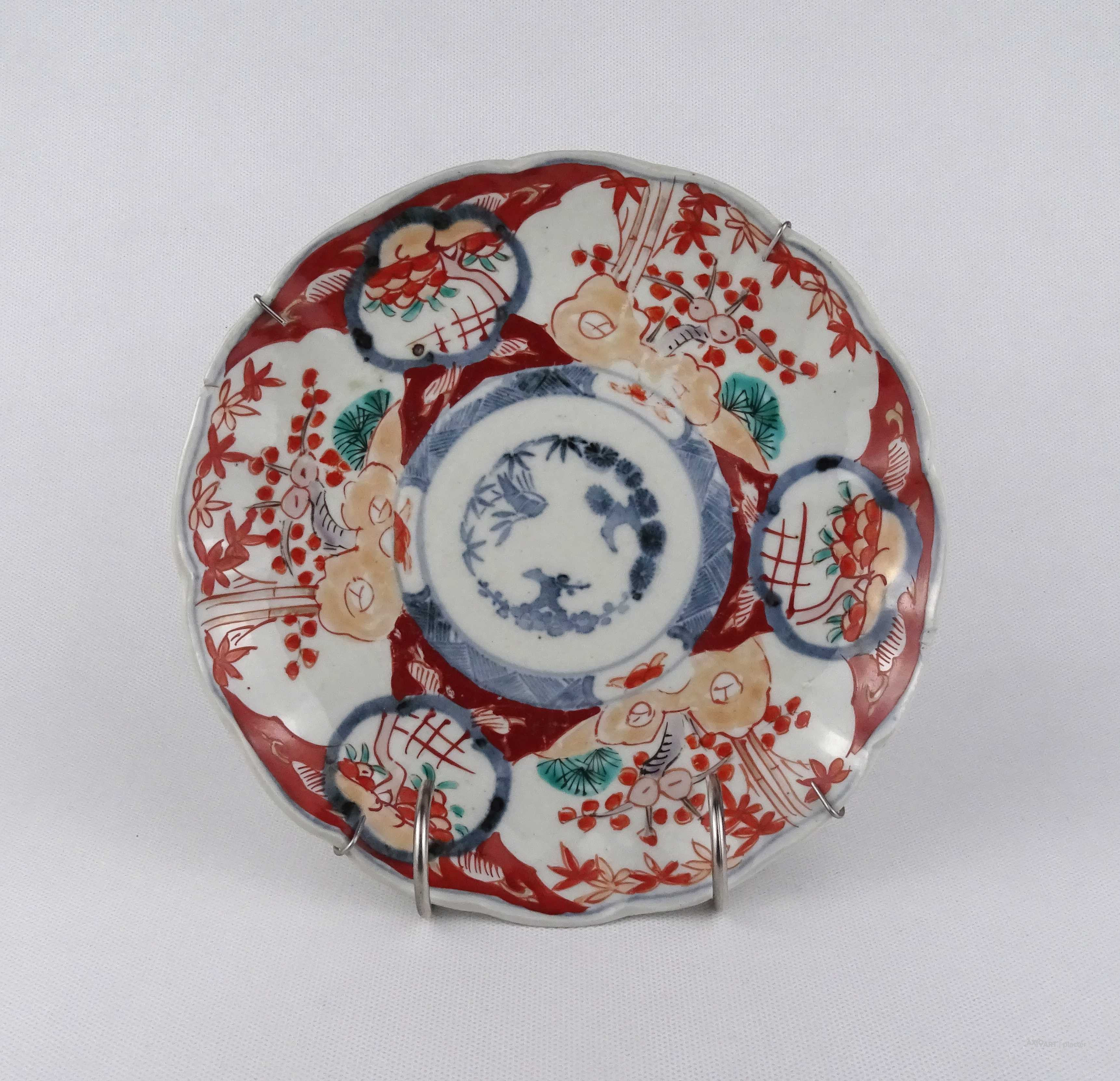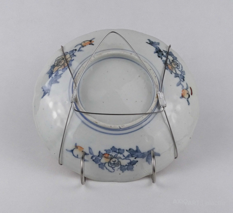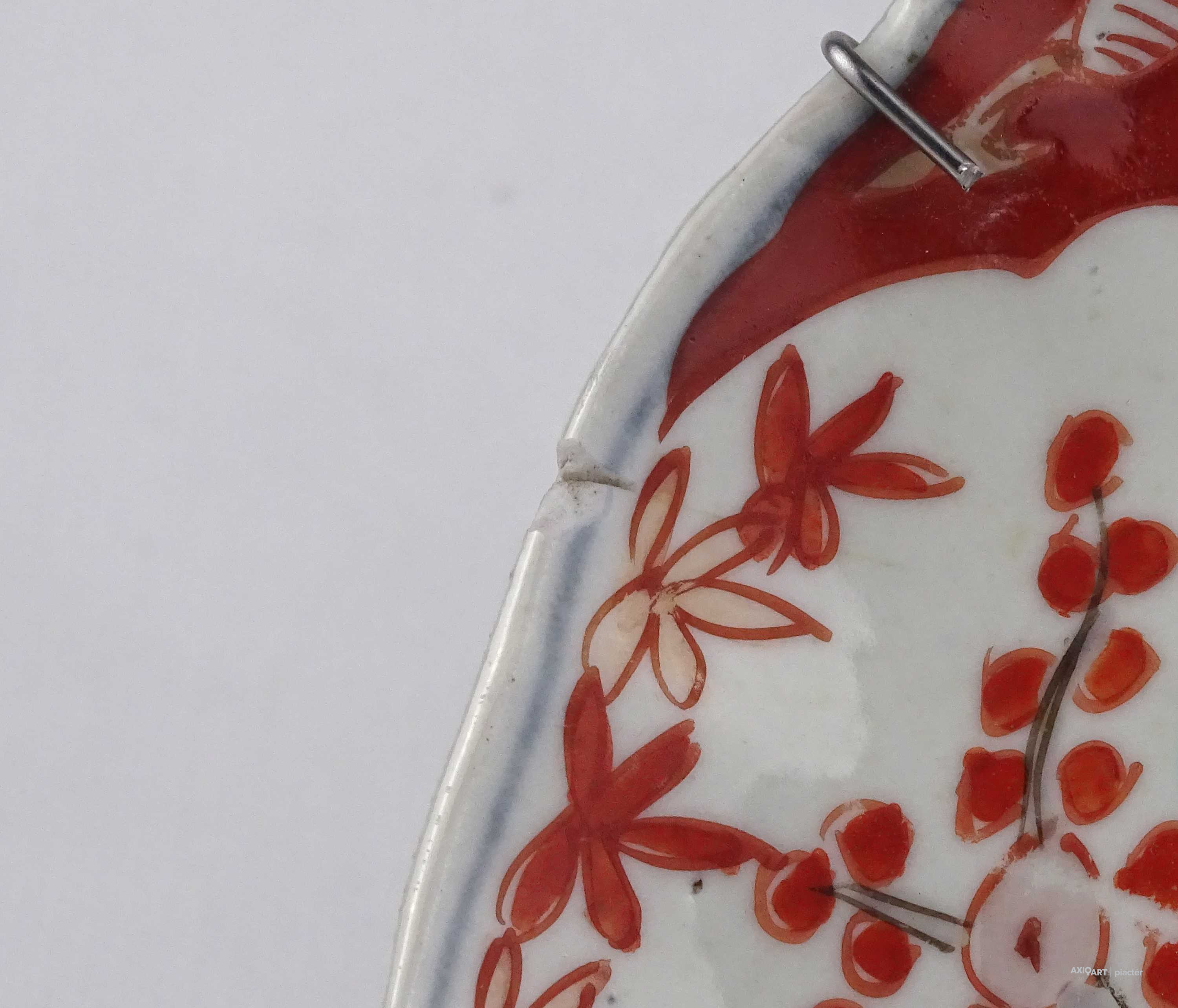 Antik, szép állapotú, gazdagon díszített, kézzel festett, japán porcelán dísz tál, falitál. A tányéron fémből hajlított pánt található, aminél fogva falra akasztható. Peremén két helyen apró lepattanás látható.