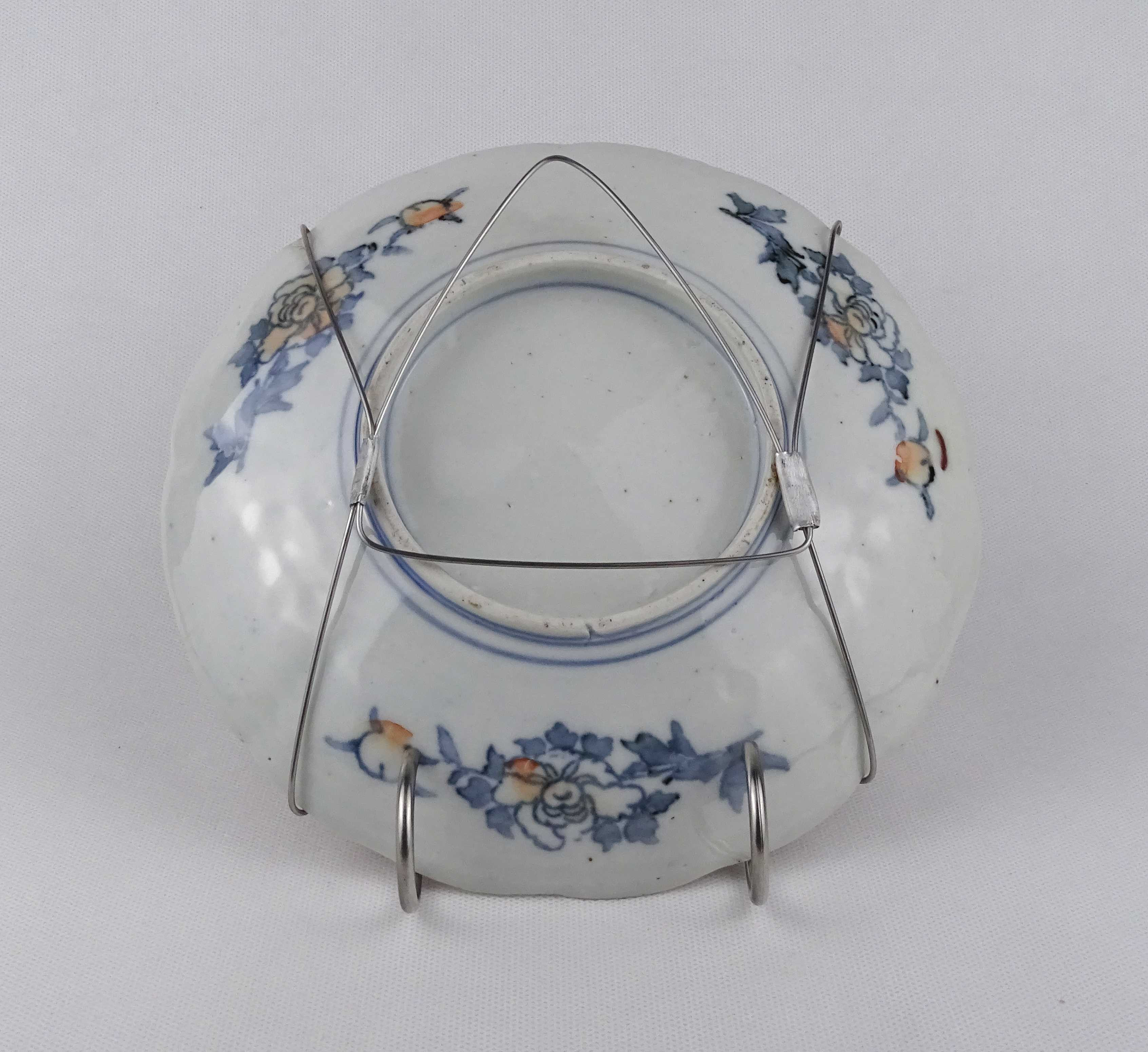 [1U510/Z268] Antik, szép állapotú, gazdagon díszített, kézzel festett, japán porcelán dísz tál, falitál. A tányéron fémből hajlított pánt található, aminél fogva falra akasztható. Peremén két helyen apró lepattanás látható. Magasság: 3 cm Szélesség: 21.2 cm Súly: 0.42 kg