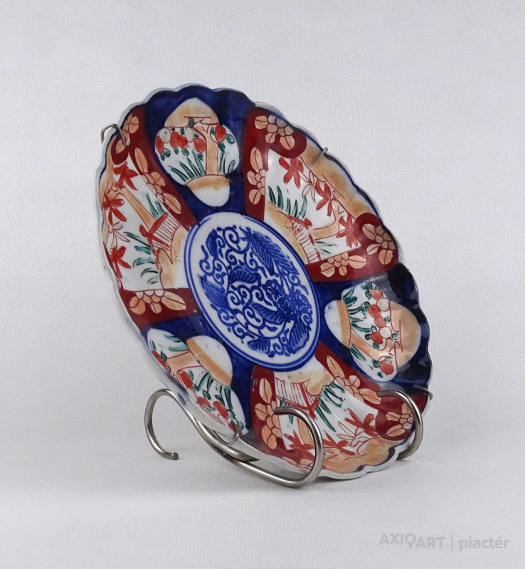 [1U506/Z268] Antik, hibátlan állapotú, gazdagon díszített, kézzel festett, japán porcelán dísz tál, falitál. A tányéron fémből hajlított pánt található, aminél fogva falra akasztható. Magasság: 4 cm Szélesség: 21.4 cm Súly: 0.54 kg