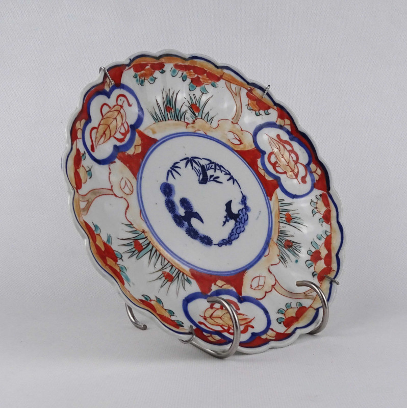 [1U508/Z268] Antik, hibálan állapotú, gazdagon díszített, kézzel festett, japán porcelán dísz tál, falitál. A tányéron fémből hajlított pánt található, aminél fogva falra akasztható. Magasság: 3 cm Szélesség: 21.3 cm Súly: 0.4 kg