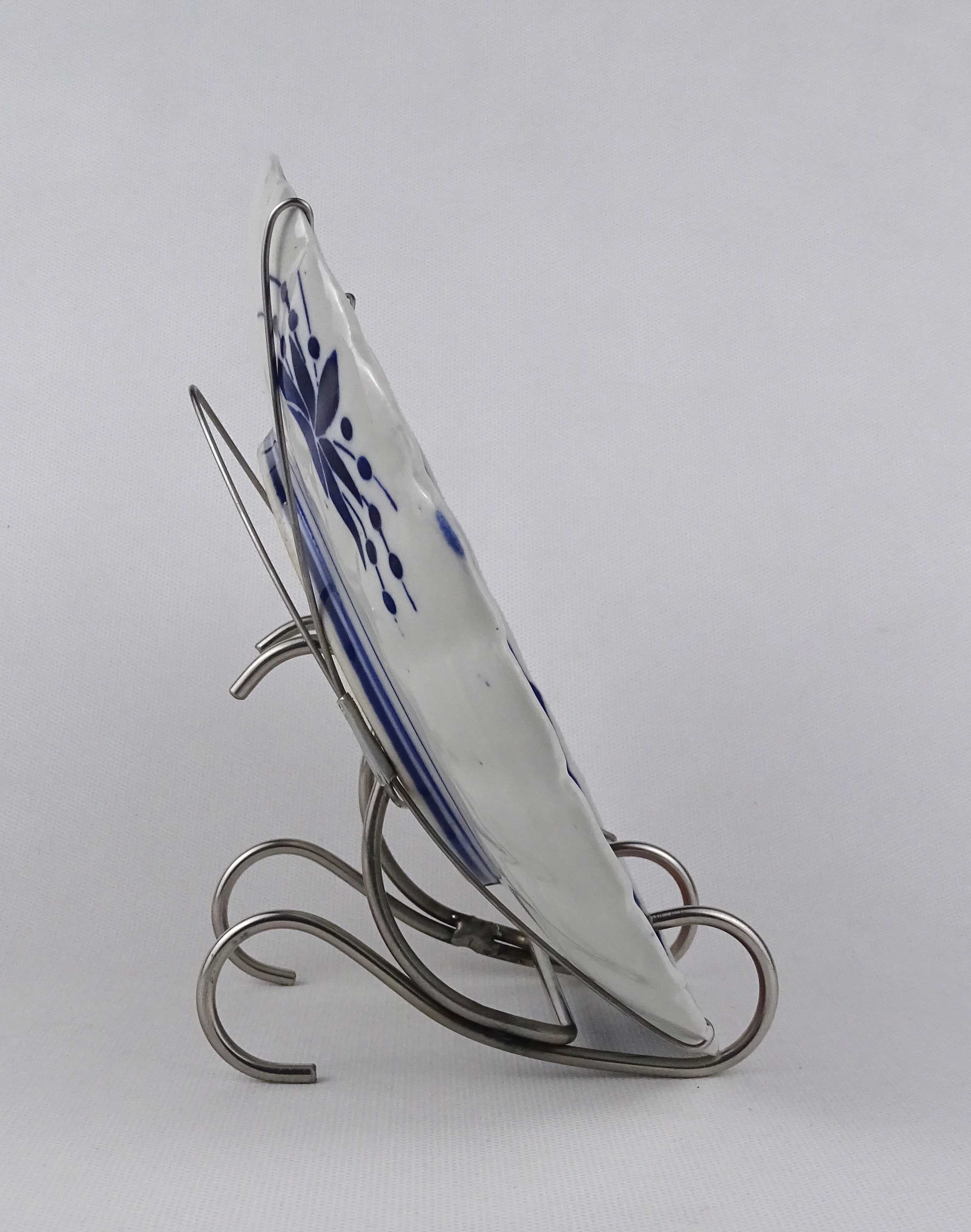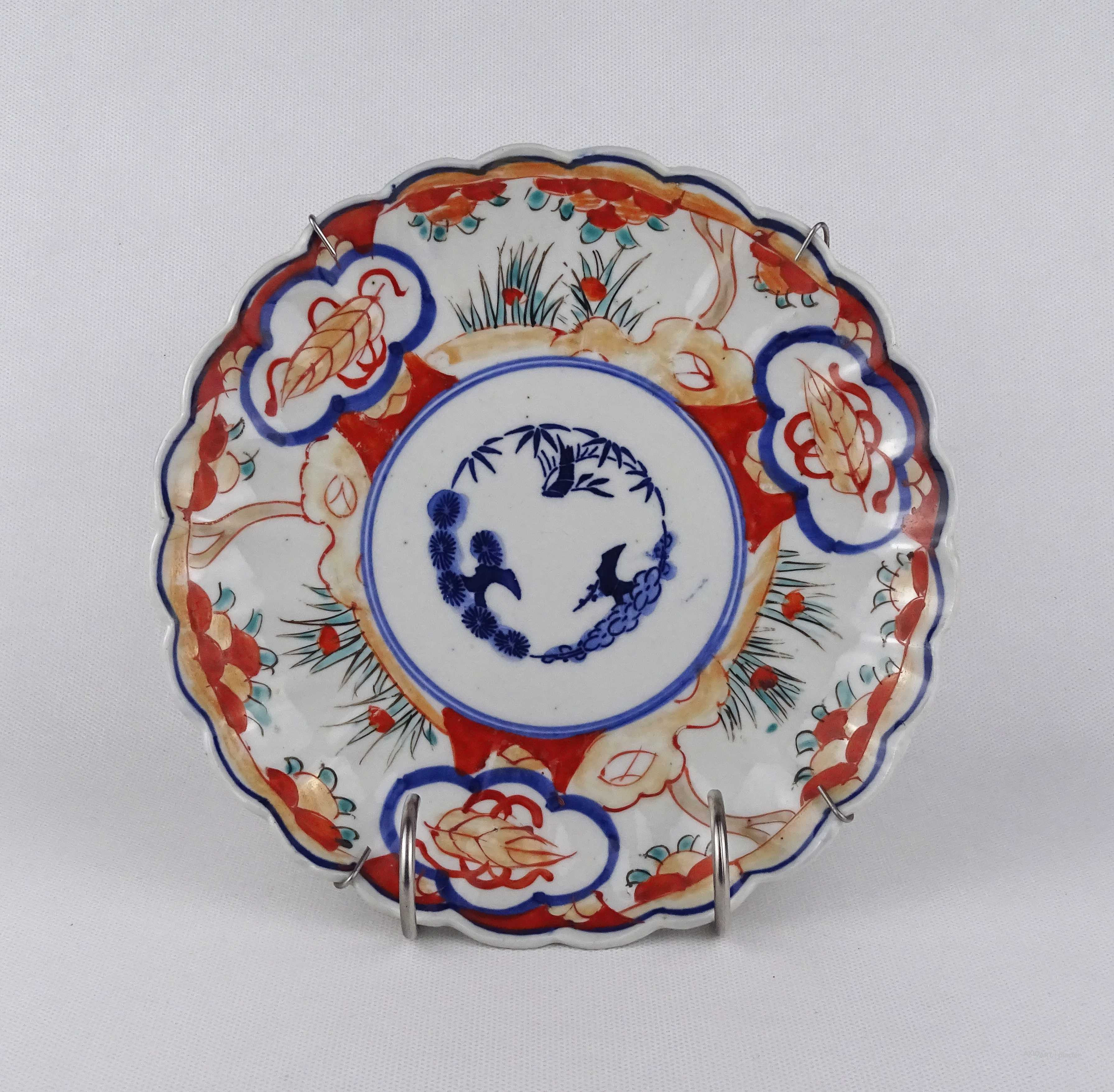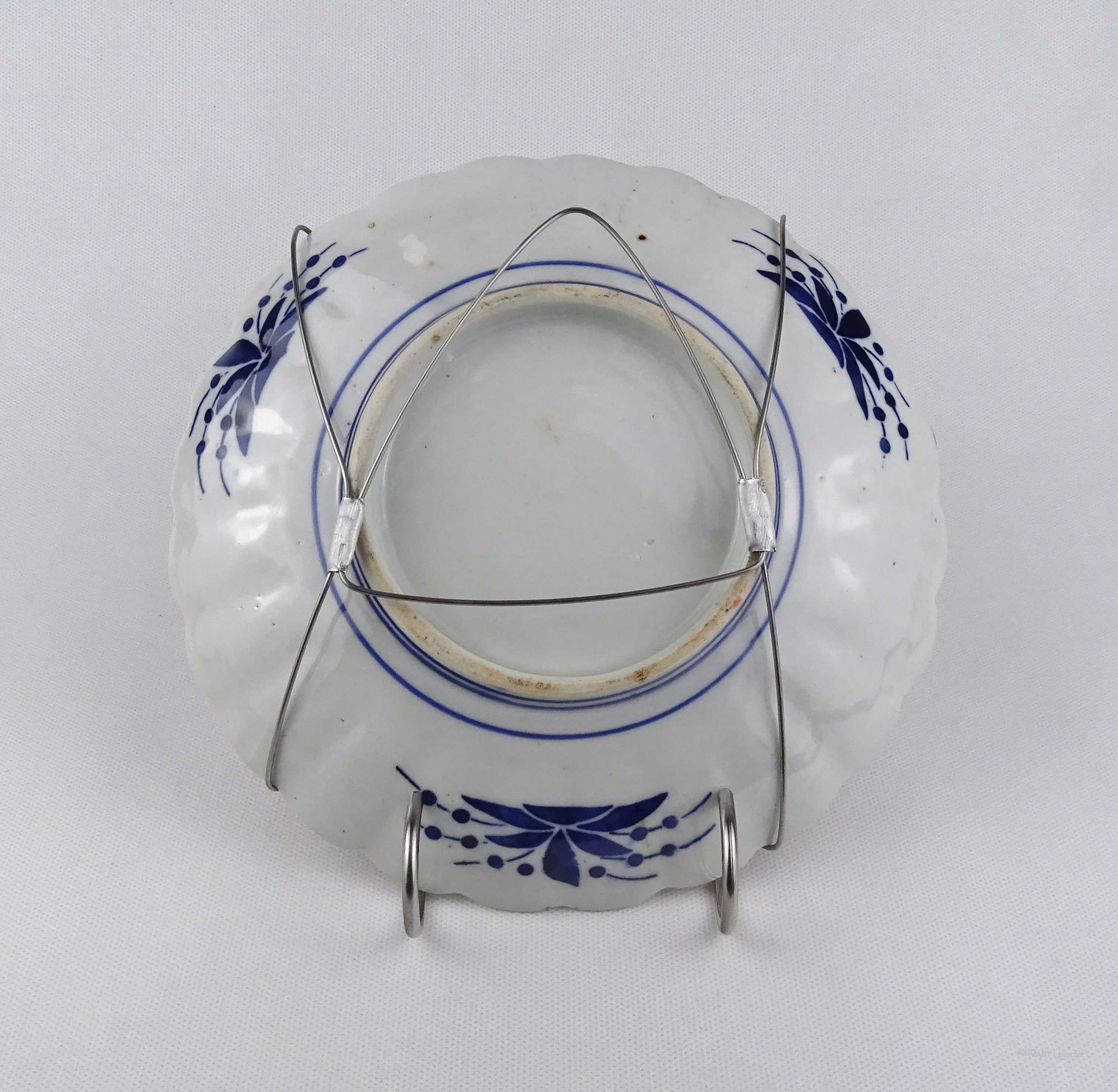 Antik, hibálan állapotú, gazdagon díszített, kézzel festett, japán porcelán dísz tál, falitál. A tányéron fémből hajlított pánt található, aminél fogva falra akasztható.