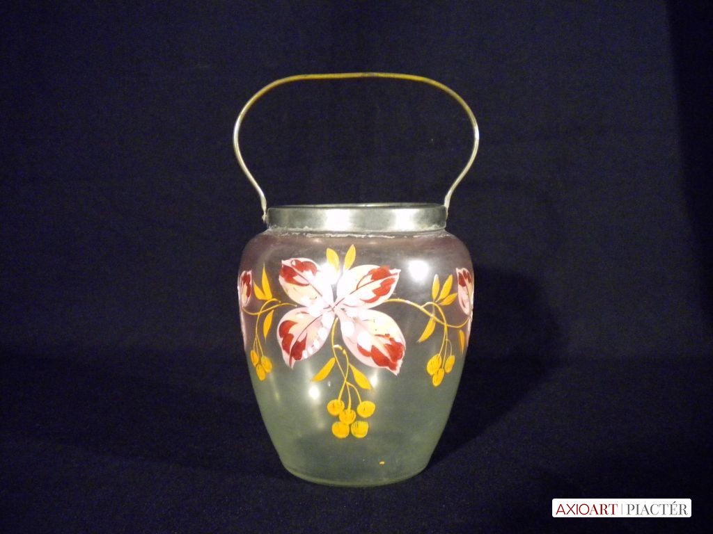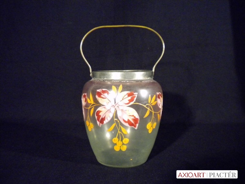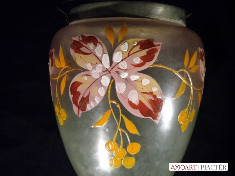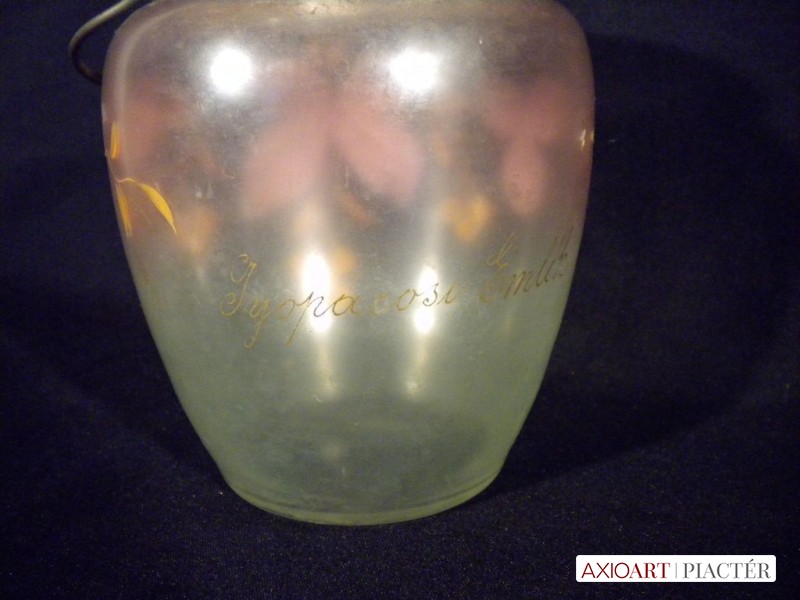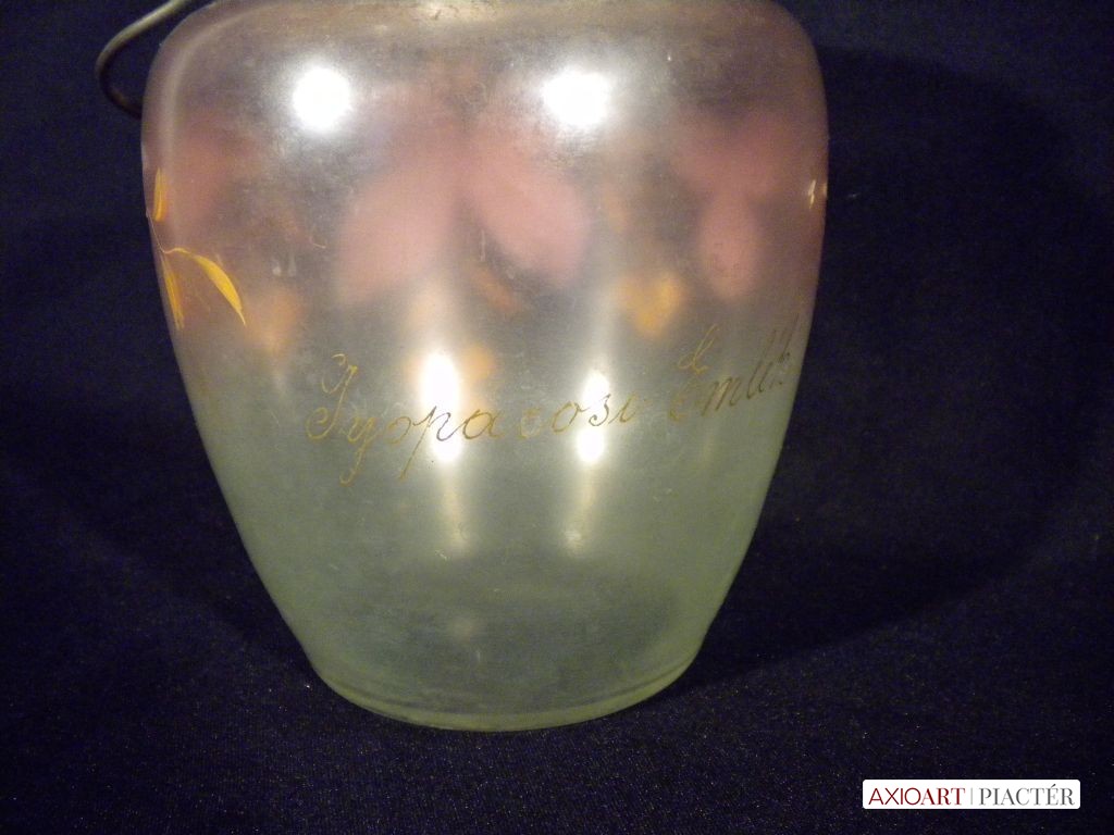 [M083/VTR-10] 1890-1900 környéki fújt üveg, színezett üveg, kézi festésű jégtartó edény. Peremén fém fogó található, hátulján felirat GYOPÁROSI EMLÉK A fém peremnél egy 1,5 cm-es repedésnyom látható. Magasság: 16 cm