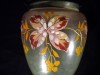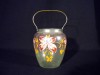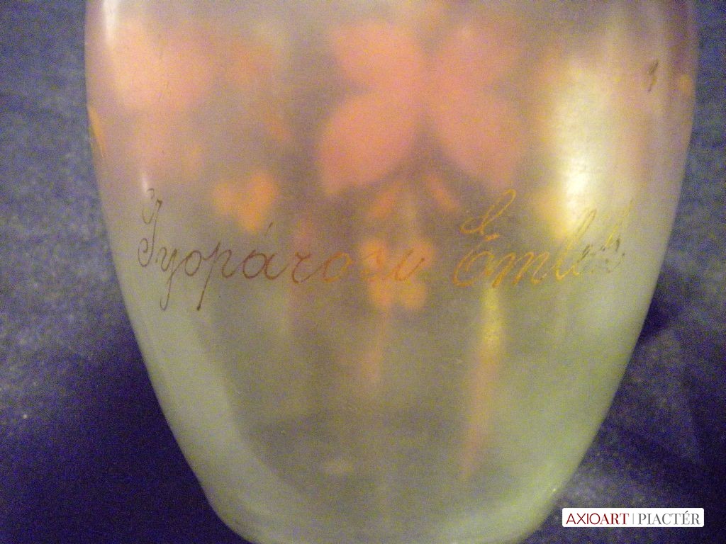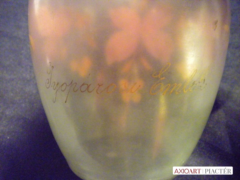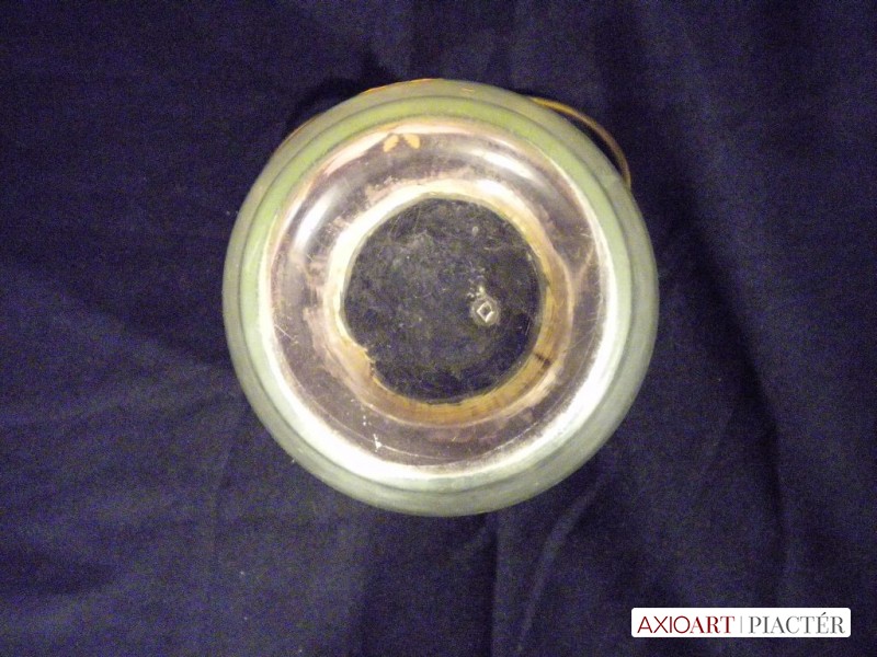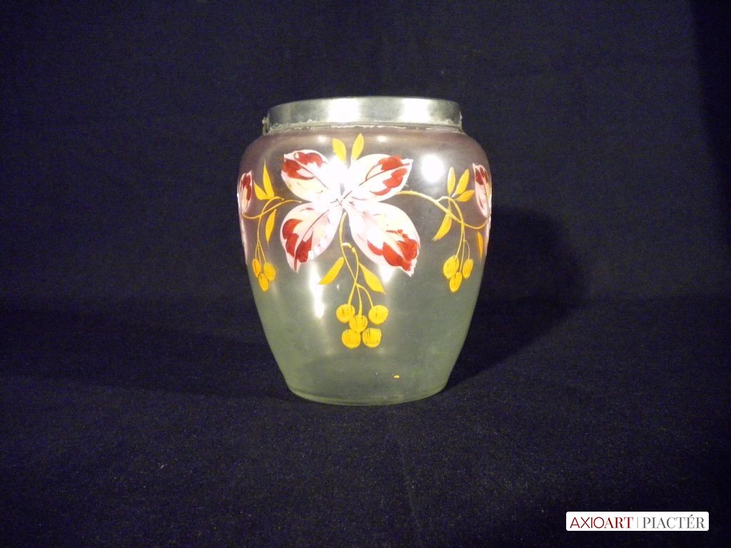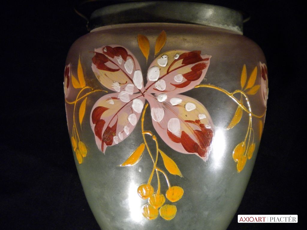 [M083/VTR-10] 1890-1900 környéki fújt üveg, színezett üveg, kézi festésű jégtartó edény. Peremén fém fogó található, hátulján felirat GYOPÁROSI EMLÉK A fém peremnél egy 1,5 cm-es repedésnyom látható. Magasság: 16 cm