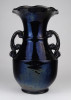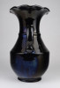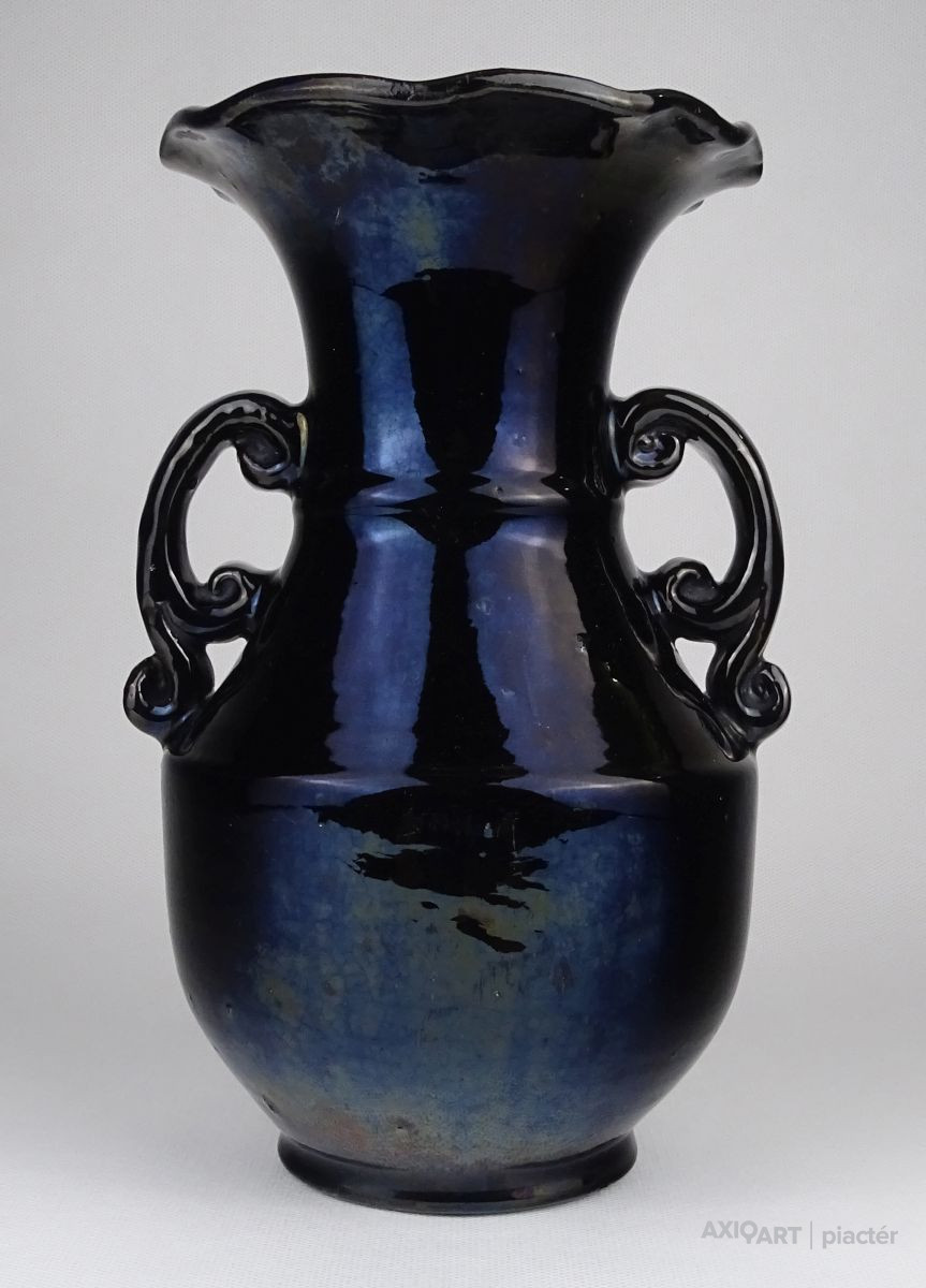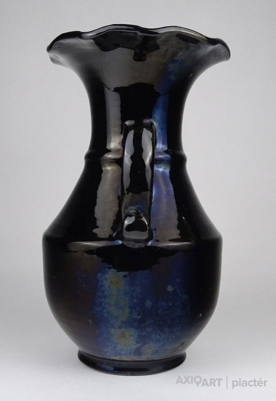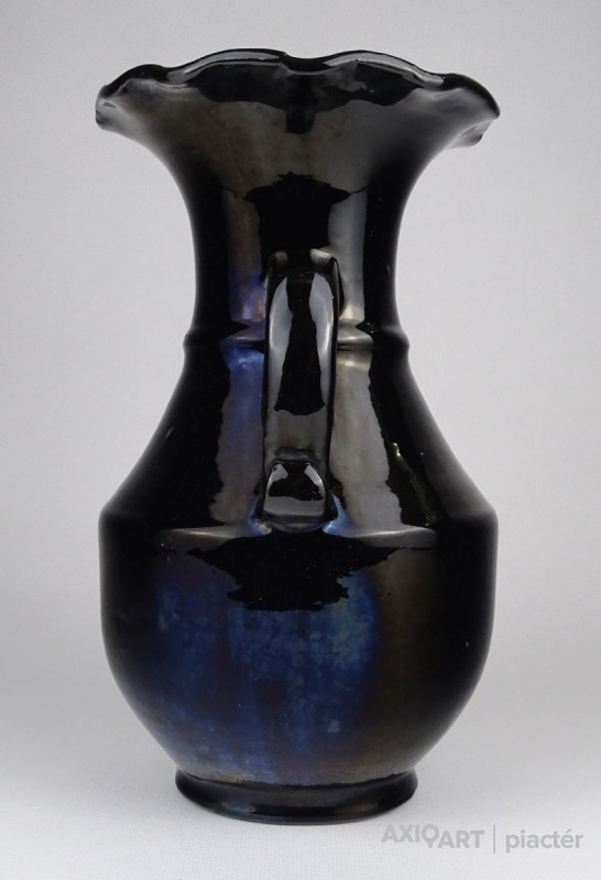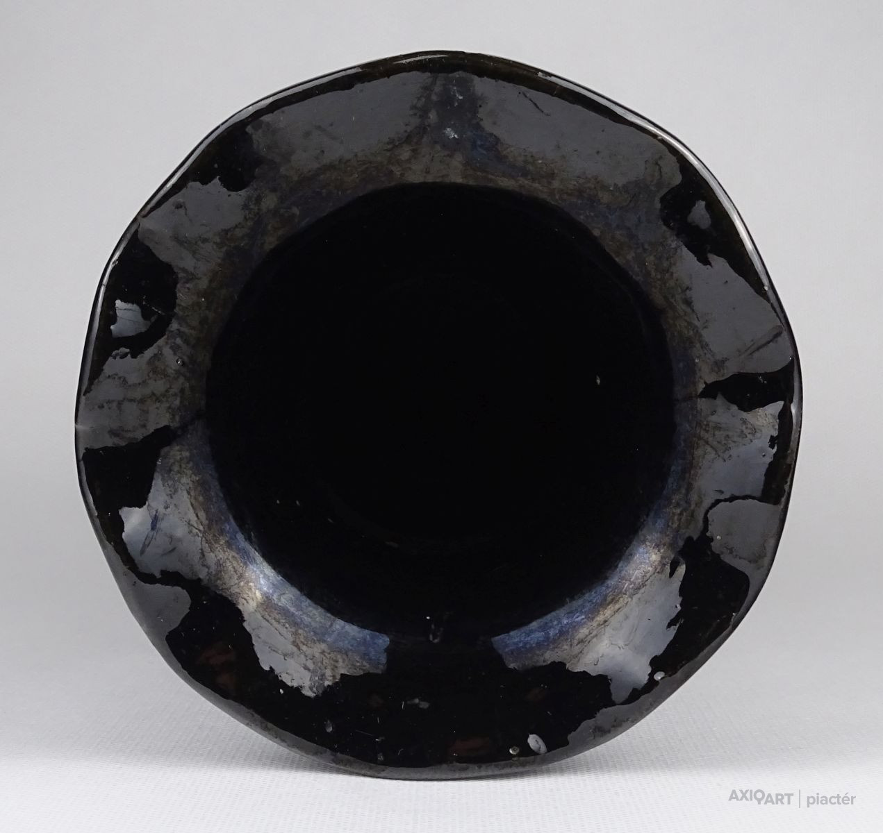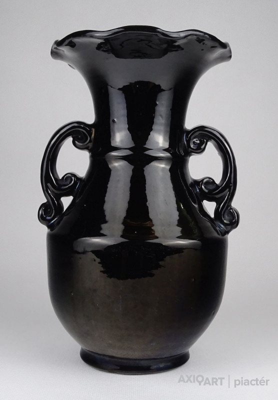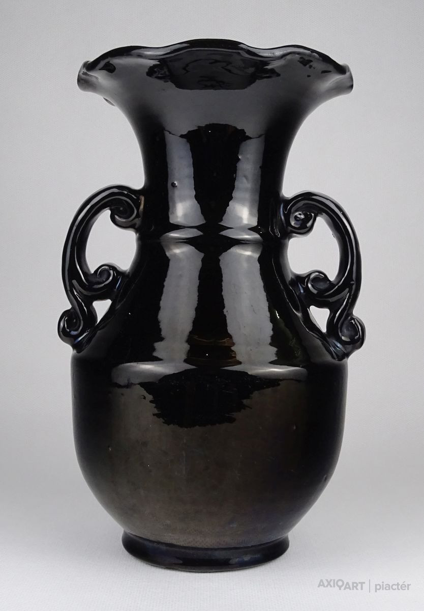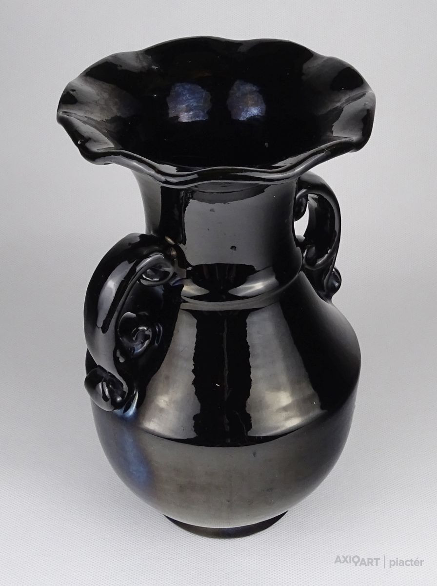 Hibátlan állapotú fekete mázas fodros szélű talpas nagy méretű kerámia váza.