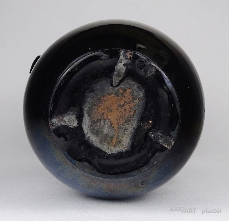 [1M055/X305] Retro hibátlan állapotú iparművészeti kerámia váza, díszváza. Alján jelzés: B. VÁRDEÁK Alján zsűri címke, rajta felirat: IPARMŰVÉSZETI VÁLLALAT ZSŰRISZÁM: 108154 69-995 Magasság: 10.5 cm Szélesség: 6.5 cm Hosszúság: 10.5 cm Súly: 0.35 kg B.Várdeák Ildikó keramikus Abony, 1929-05-13 Névváltozat: Bődy Oszkárné 1953-ban diplomázott a Magyar Iparművészeti Főiskolán Gádor István és Borsos Miklós növendékeként. 1971-ben és 1972-ben részt vett a Siklósi Kerámia Szimpóziumon. 1979: Faenza, aranyérem [Bődy Oszkárral]; 1980: Patikaedény-kiállítás, aranyérem, Gualdo Tadino. Kezdetben porcelán- és kerámiaedények tervezésével, kivitelezésével foglalkozott, majd kerti plasztikákat készített samottos agyagból. Jelenleg cserépkályhát, kandallót tervez és kivitelez, valamint régi épületkerámiák restaurálásával foglalkozik. Irodalom Mai magyar iparművészet. Kerámia, porcelán, üveg, Budapest, 1975. Egyéni kiállítások Egyéni kiállítások 1971 • Népház, Budapest-Óbuda 1980 • Faipari Szakiskola, Budapest 1992 • Angelika Cukrászda, Budapest. Válogatott csoportos kiállítások Válogatott csoportos kiállítások 1955 • Fiatal Iparművészek Kiállítása, Ernst Múzeum, Budapest 1955, 1959, 1965 • 2., 4., 5. Országos Iparművészeti kiállítás, Műcsarnok, Budapest 1958 • Magyar Iparművészek Kiállítása, Világkiállítás, Brüsszel 1959 • Magyar Képzőművésznők II. kiállítása, Műcsarnok, Budapest 1960 • Képzőművésznők nemzetközi kiállítása, Műcsarnok, Budapest 1963 • Modern magyar kerámia, Royal Festival Hall, London 1966 • Gádor István és tanítványai kiállítása, Ernst Múzeum, Budapest 1967 • Kerámia kiállítás, Vármúzeum, Siklós 1968, 1972, 1975, 1978, 1980 • I., III-VI. Országos Kerámia Biennálé, Pécs 1968, 1972, 1977, 1979 • Nemzetközi Kerámia Kiállítás, Faenza 1971, 1972 • Kerámia Szimpozion, Siklós 1972 • Edénykultúra, Műcsarnok, Budapest 1974 • Mai Magyar Iparművészet II., Iparművészeti Múzeum, Budapest 1975 • Jubileumi Iparművészeti Kiállítás, Műcsarnok, Budapest 1979 • Nemzetközi Kerámia Kiállítás, Sopot 1980 • Művészek az üzemekben, Magyar Nemzeti Galéria, Budapest 1982 • Magyar Kerámia, Palazzo delle Esposizione, Faenza 1983 • Nemzetközi Kerámia Kiállítás, Perugia – Gualdo Tadino 1995 • XX. századi magyar keramikusok. Válogatás az Iparművészeti Múzeum gyűjteményéből, Iparművészeti Múzeum, Budapest 1998 • In Memoriam Tornyai, Tornyai János Múzeum, Hódmezővásárhely 1998 • Őszi kerámia kiállítás, Palme Ház, Budapest Művek közgyűjteményekben Művek közgyűjteményekben Forrás: artportal.hu