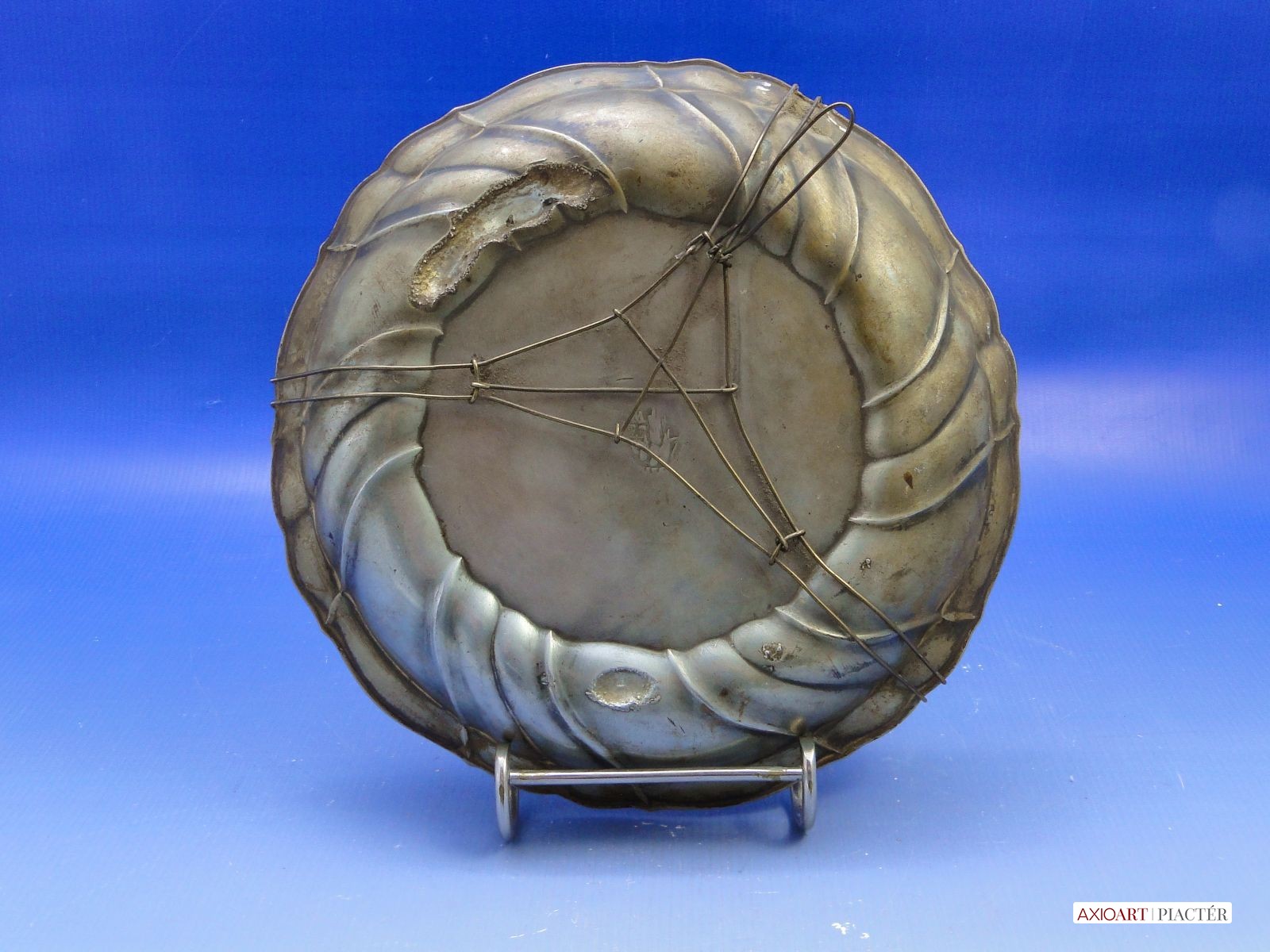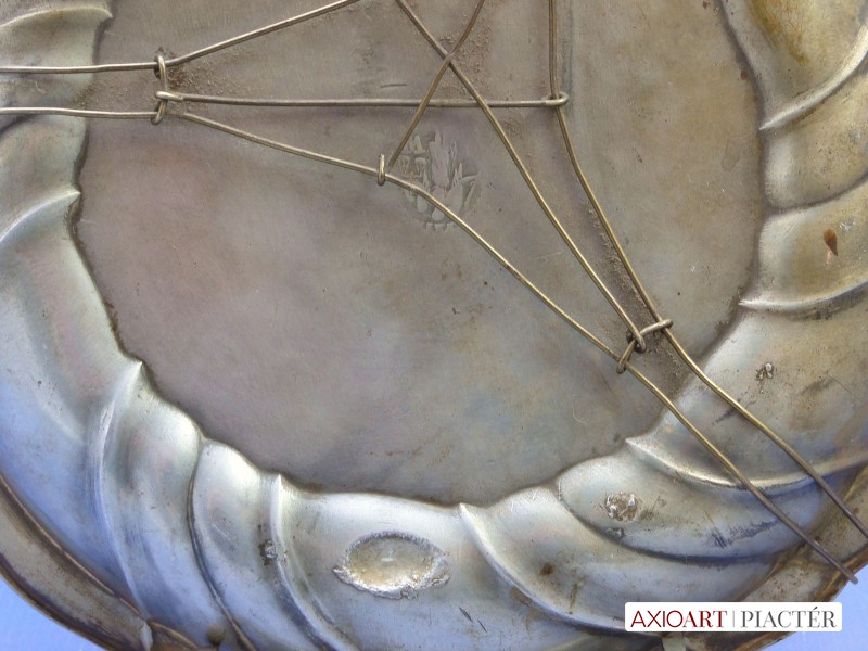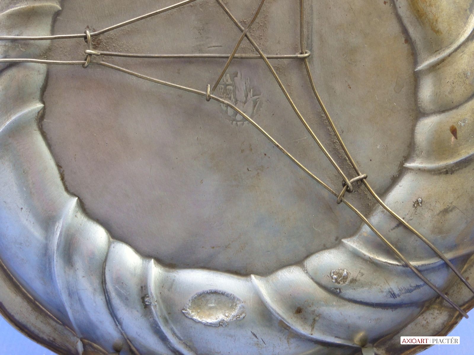 [0A744/X005] Szép állapotú fodros szélű kerek alakú jelzett kínáló óntál a XVIII. századból. Régi gyűjteményből való ritka, megbecsült darab. Hátoldalán az 50-es évekből való réz drótos pántolás, falra akasztási lehetőség. Alján angyalos jelzés: C.W. ENGEL Az angyal egyik ezében kard, másik kezében mérleg látható. Magasság: 4 cm Szélesség: 22 cm Súly: 0.455 kg