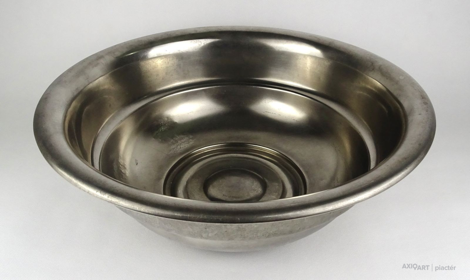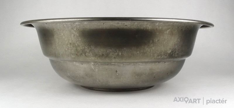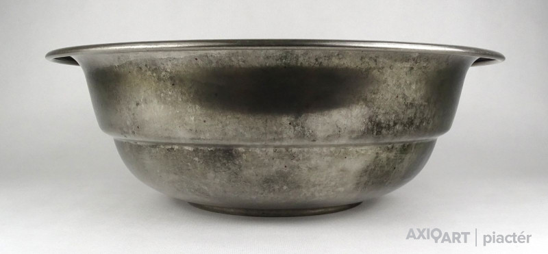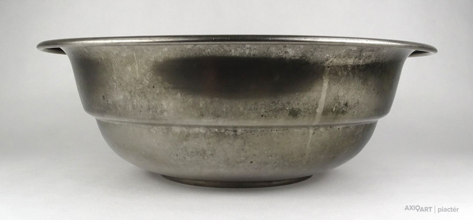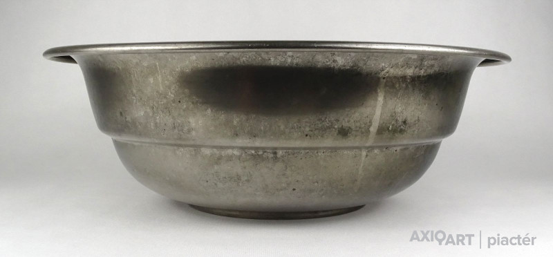 [1L055/UZ-N] Antik szép állapotú, nagyméretű alpakka lavór. Oldalán koronás iniciálés tulajdonosi monogram: PM vagy MP Magasság: 13.5 cm Szélesség: 42 cm Súly: 1.48 kg