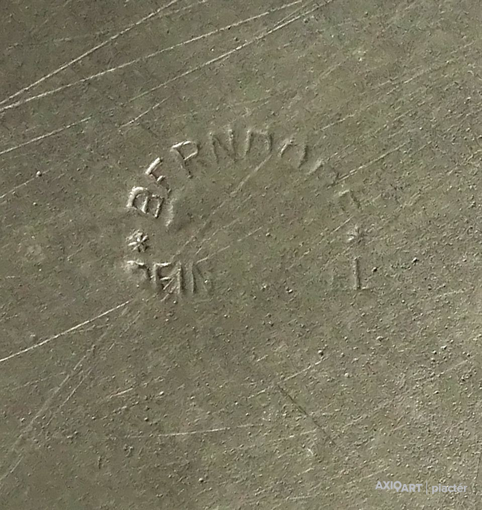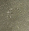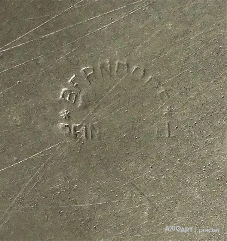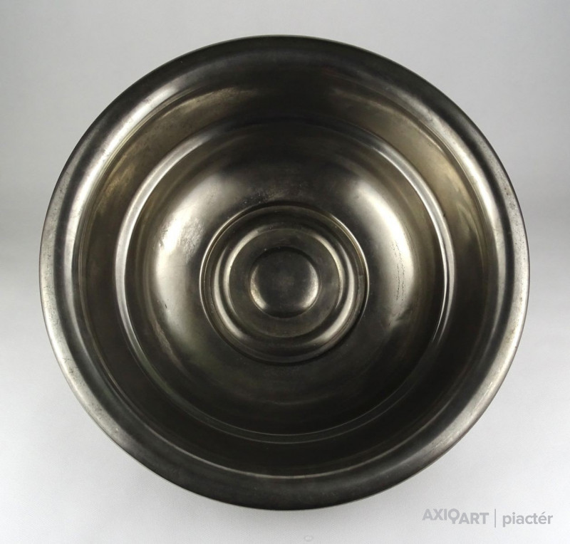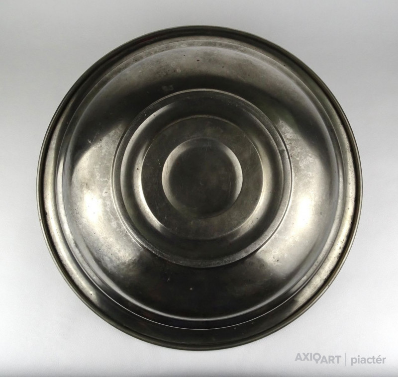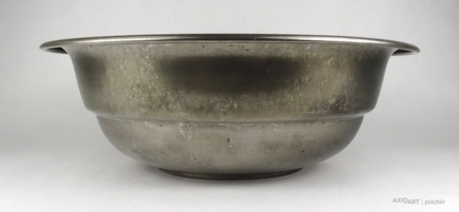 [1L055/UZ-N] Antik szép állapotú, nagyméretű alpakka lavór. Oldalán koronás iniciálés tulajdonosi monogram: PM vagy MP Magasság: 13.5 cm Szélesség: 42 cm Súly: 1.48 kg