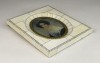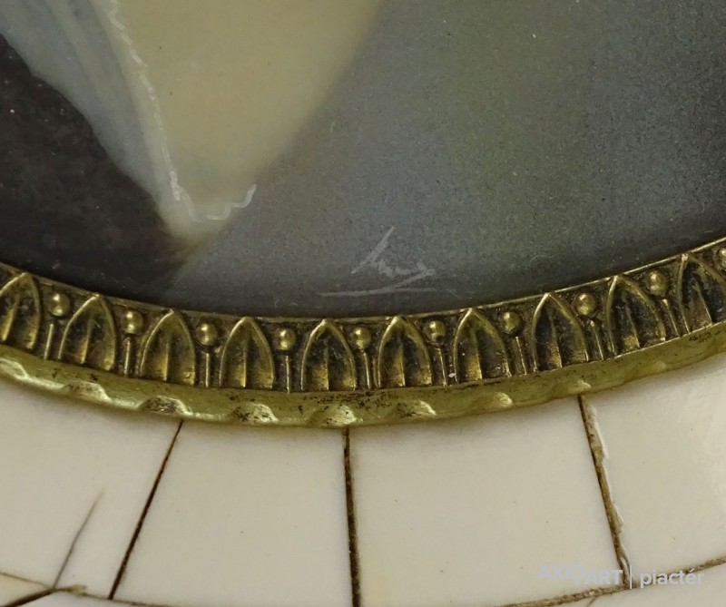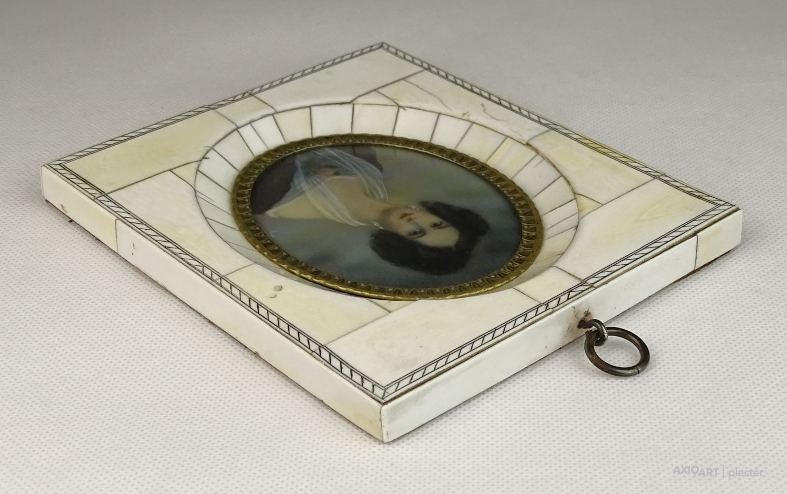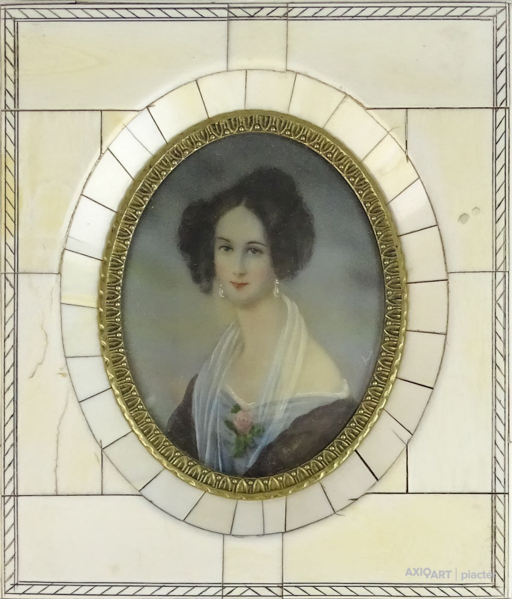 [0U948/BX-10] Antik biedermeier főúri hölgy portré. Csontra festett, rendkívül részletgazdag, jelzett, német miniatúra. Csontlapokkal díszített keretben, ovális alakú, enyhén domború üveg alatt található női portré. Az üveglap körül finoman díszített réz szegély található. Magasság: 14 cm Szélesség: 12 cm Súly: 0.125 kg