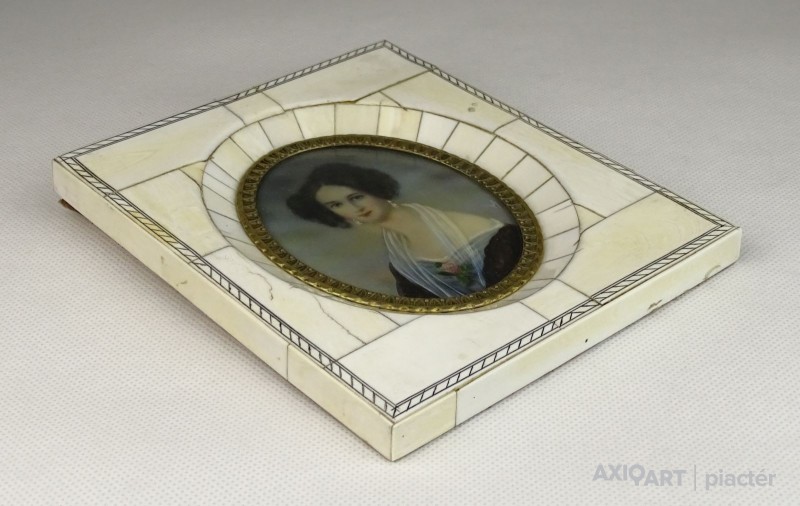 Antik biedermeier főúri hölgy portré. Csontra festett, rendkívül részletgazdag, jelzett, német miniatúra. Csontlapokkal díszített keretben, ovális alakú, enyhén domború üveg alatt található női portré. Az üveglap körül finoman díszített réz szegély található.