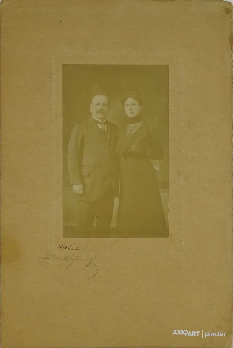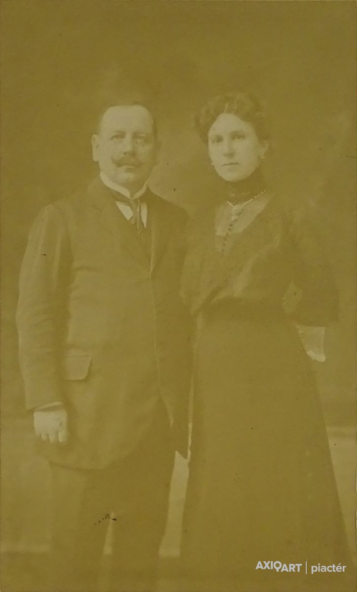 Antik, kartonra ragasztott, fekete-fehér fotográfia, melyen egy házaspár látható.
