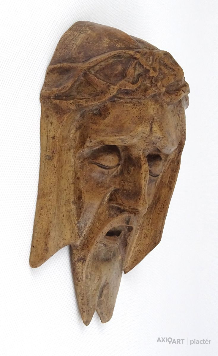Régi, akasztási lehetőséggel rendelkező falikerámia, falidísz Plasztikus Jézus portré. A darabon több korabeli javítás, restaurálás nyoma fedezhető fel.
