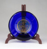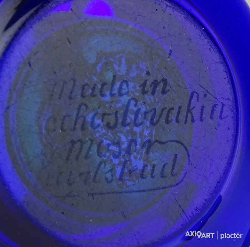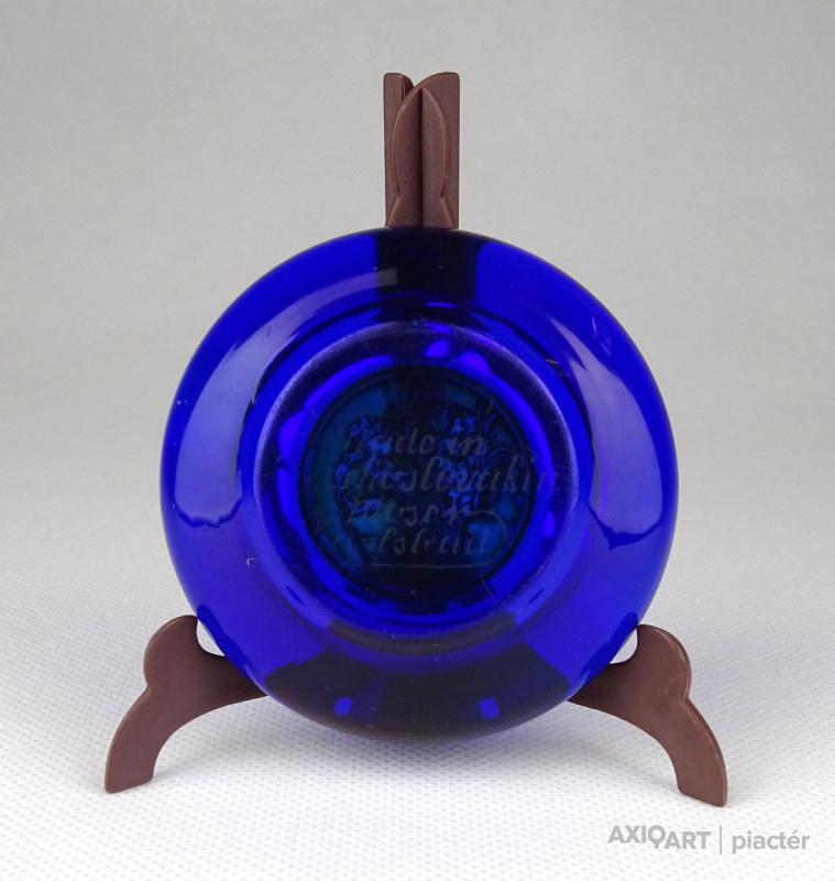 [1B653/X110] Antik, szép állapotú, jelzett kis méretű királykék színű Moser üveg hamutál. Közepében aranyozott díszítés. Alján gravírozott jelzés: MADE IN CZECHOSLOVAKIA MOSER KARLSBAD Magasság: 2 cm Szélesség: 6.8 cm Súly: 0.11 kg Cseh üveg a 19. században:  A cseh üvegesség megszokott technikáit Ludwig Moser bővítette ki. Korai, bonyolult ornamentikájú munkáit főleg iszlám és japán motívumokkal díszítette. Ekkori tárgyaira a gravírozás és a zománcfestés együttes használata volt jellemző – bőséges aranyozással. Saját üveggyára 1893-ban épült fel, és abban a bonyolult módon zománcozott üvegáruk előállításáról az újszerű módon vágott, gravírozott és színezett (pl. pácfestett) üvegekre tért át. A Moser-üveg minősége, tökéletes kidolgozása és művészi értéke gyorsan híressé vált.  Forrás: wikipédia
